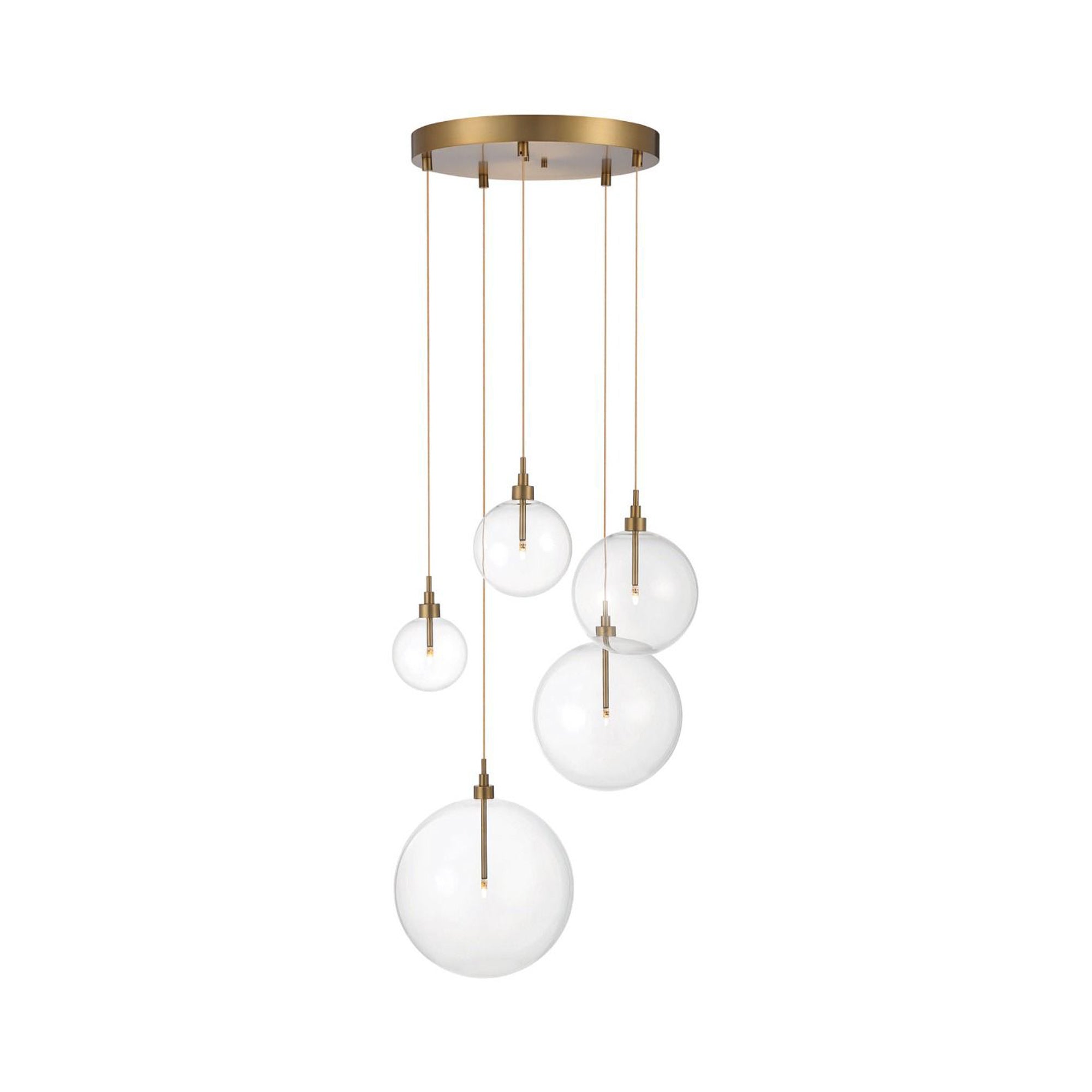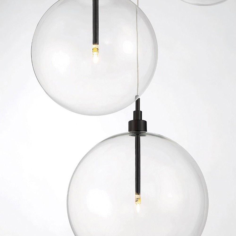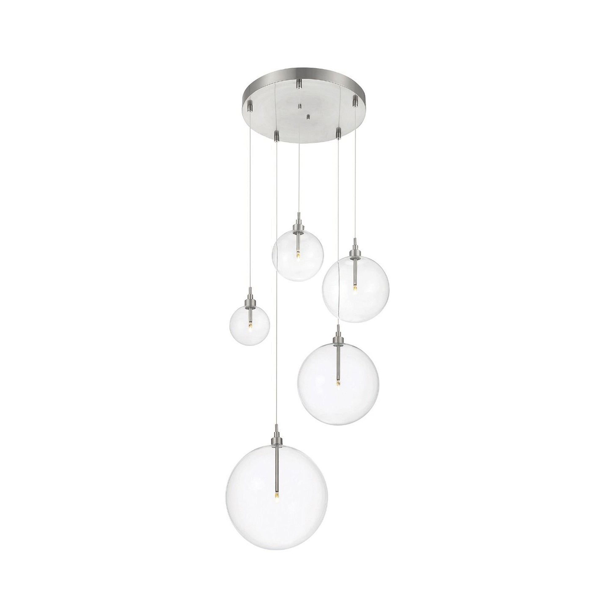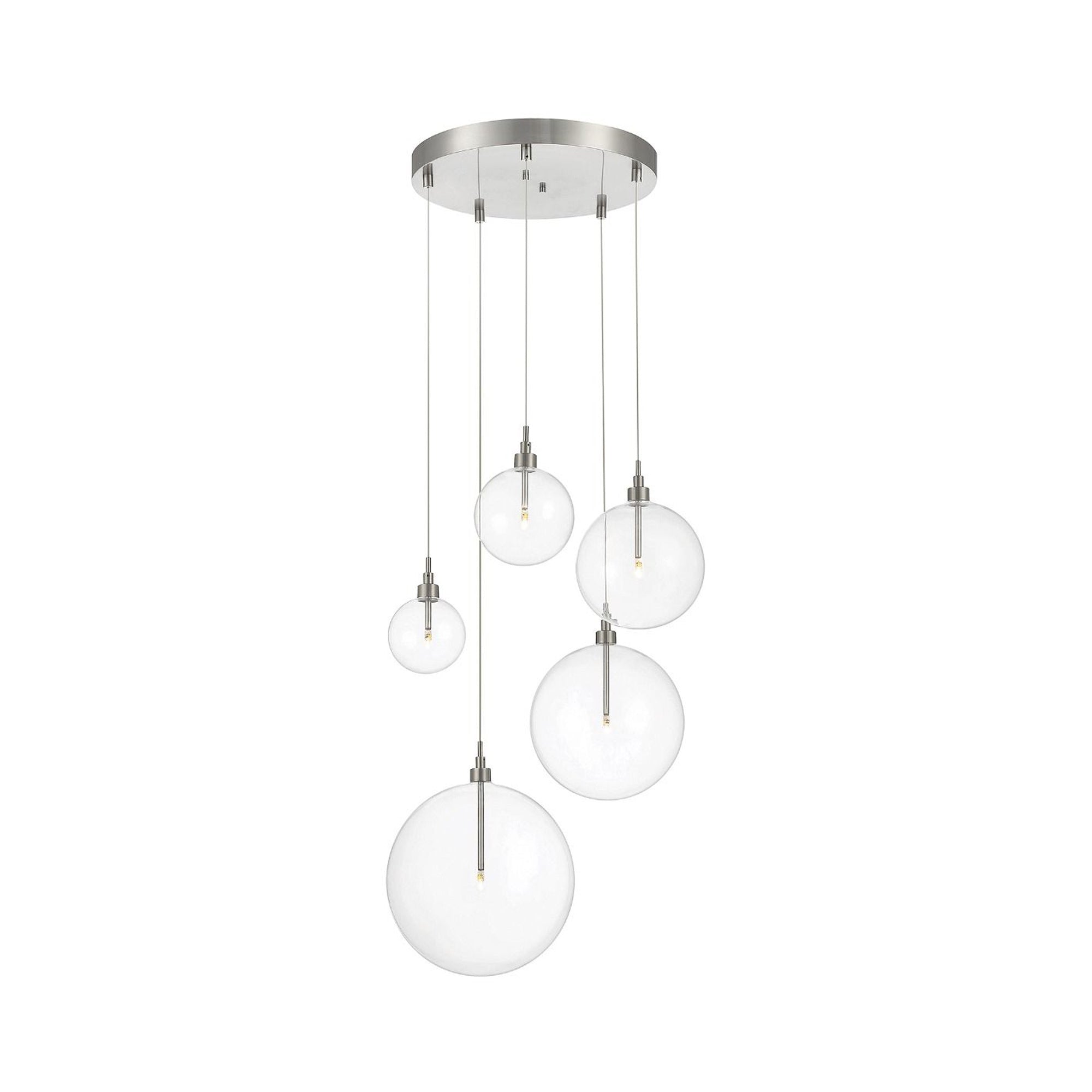 Enchanting design elements offer up a delicate elegance in the Meridian M10099 Multi Light Pendant Light from Savoy House, delivering artisanal glam and sleek sophistication. Gleaming light infuses through multiple sizes of clear blown glass orbs that suspend at graduated heights from a basic canopy, understated to maintain focus on bubble-like shades. Adjust cable heights to achieve a customized configuration.