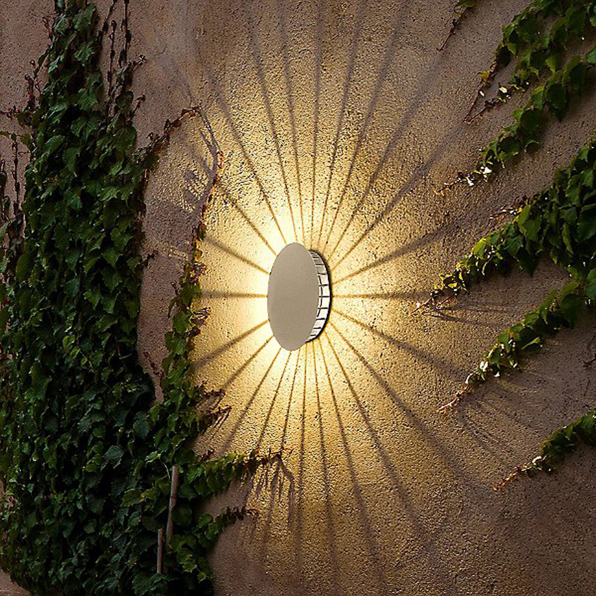 Rich and radiant, the Meridiano Outdoor LED Wall Light from Vibia brings outdoor décor to artfully elegant life . This round fixture creates a sunburst-like pattern against an exterior wall for an impressive display of glowing light.
