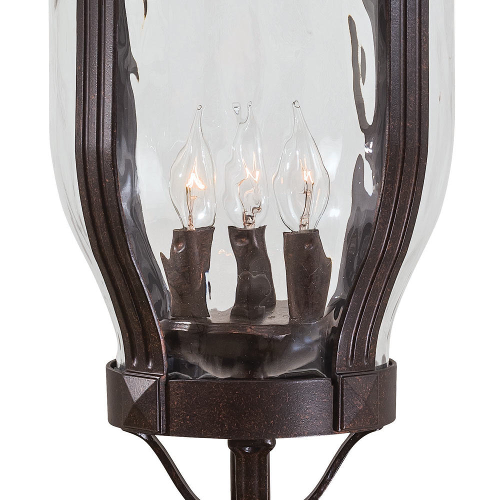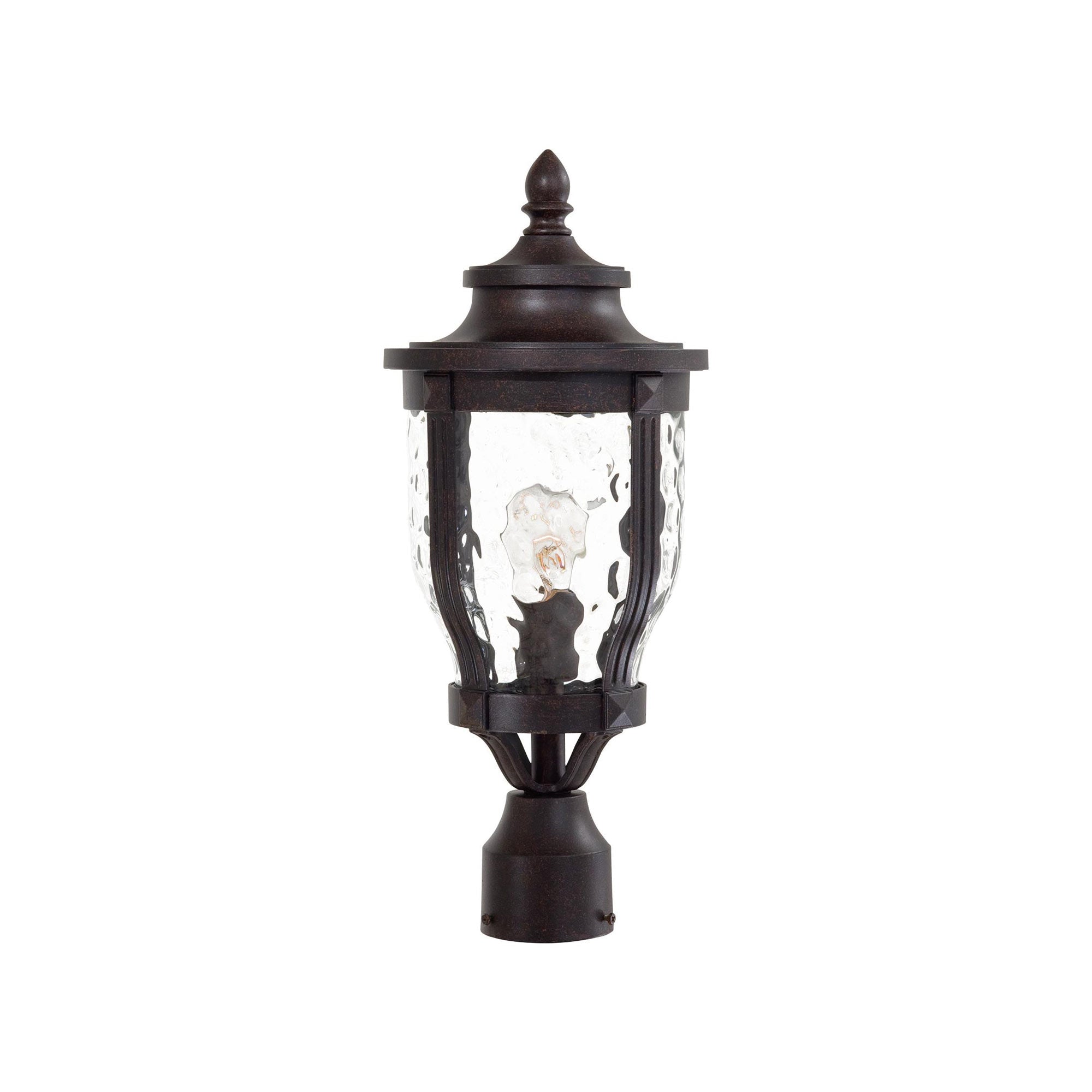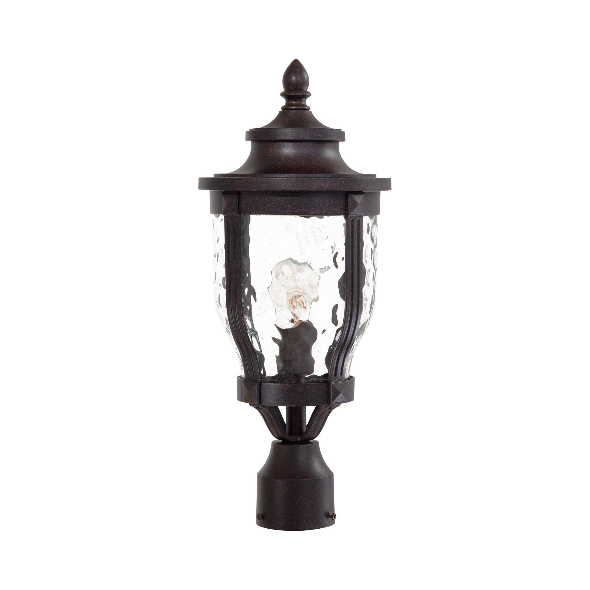 Capture the romance of artistry in an outdoor post fixture that embellishes custom landscaped spaces or walkways. With an abundance of village-inspired charm, the Merrimack Outdoor Post Light from The Great Outdoors focuses on decadent hammered glass, creating an alluring visual impact. A rounded lantern style metal frame offers an exquisite silhouette and a bold finish of Corona Bronze.