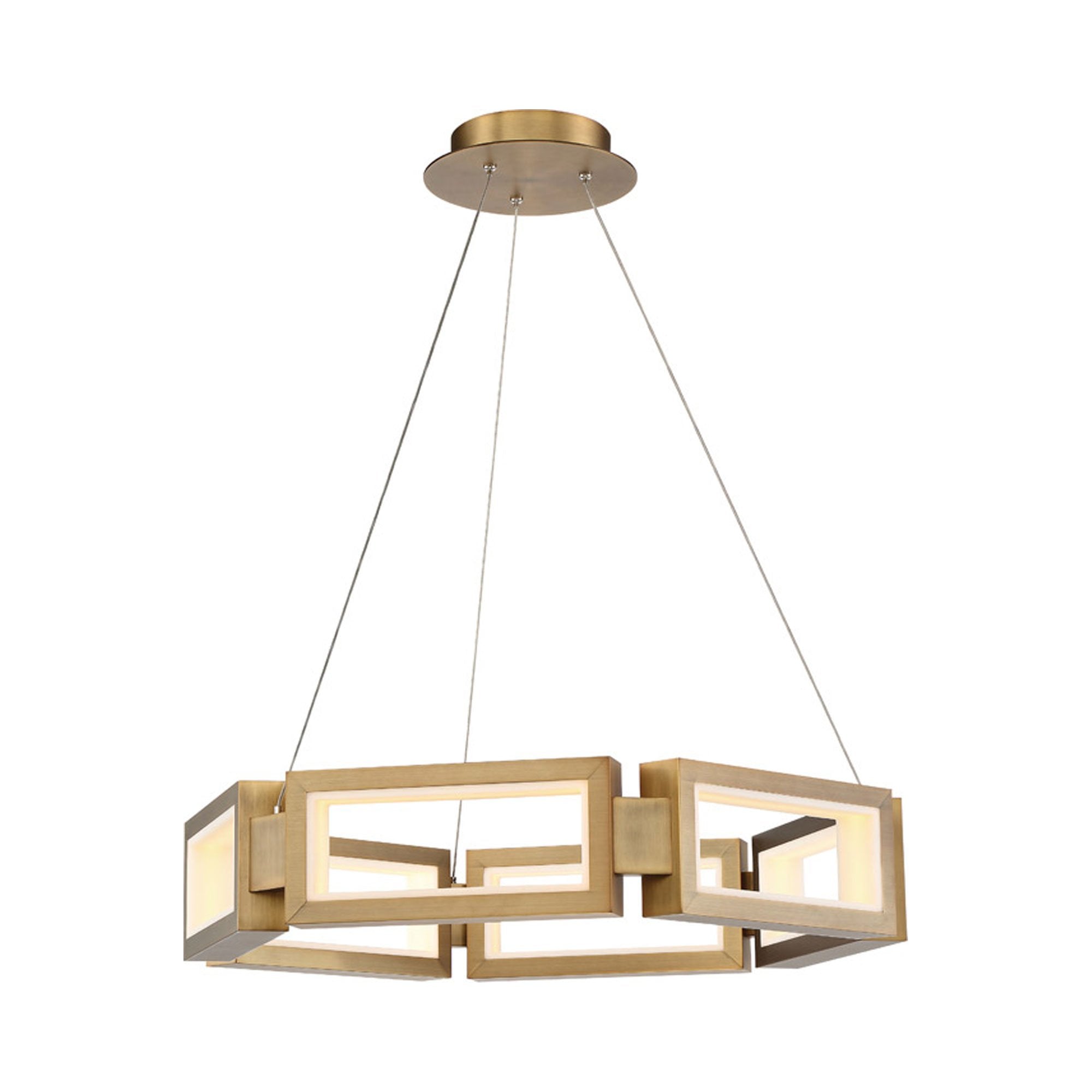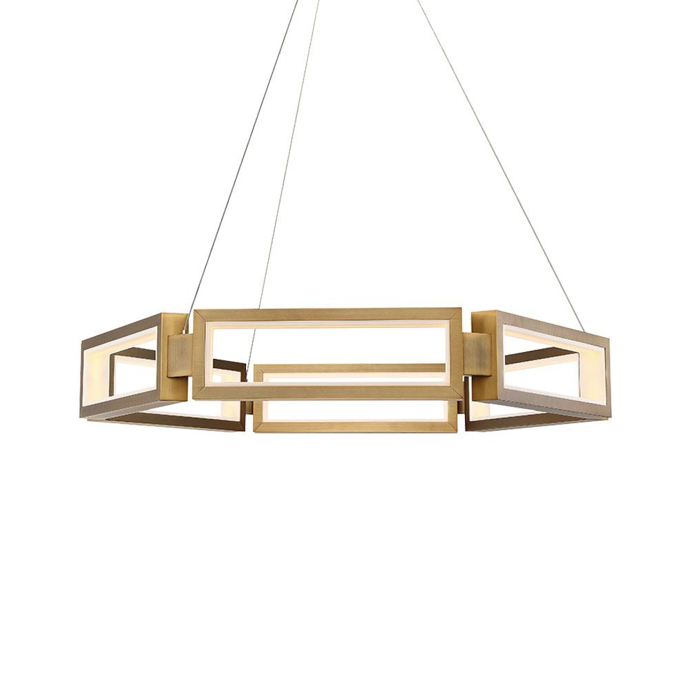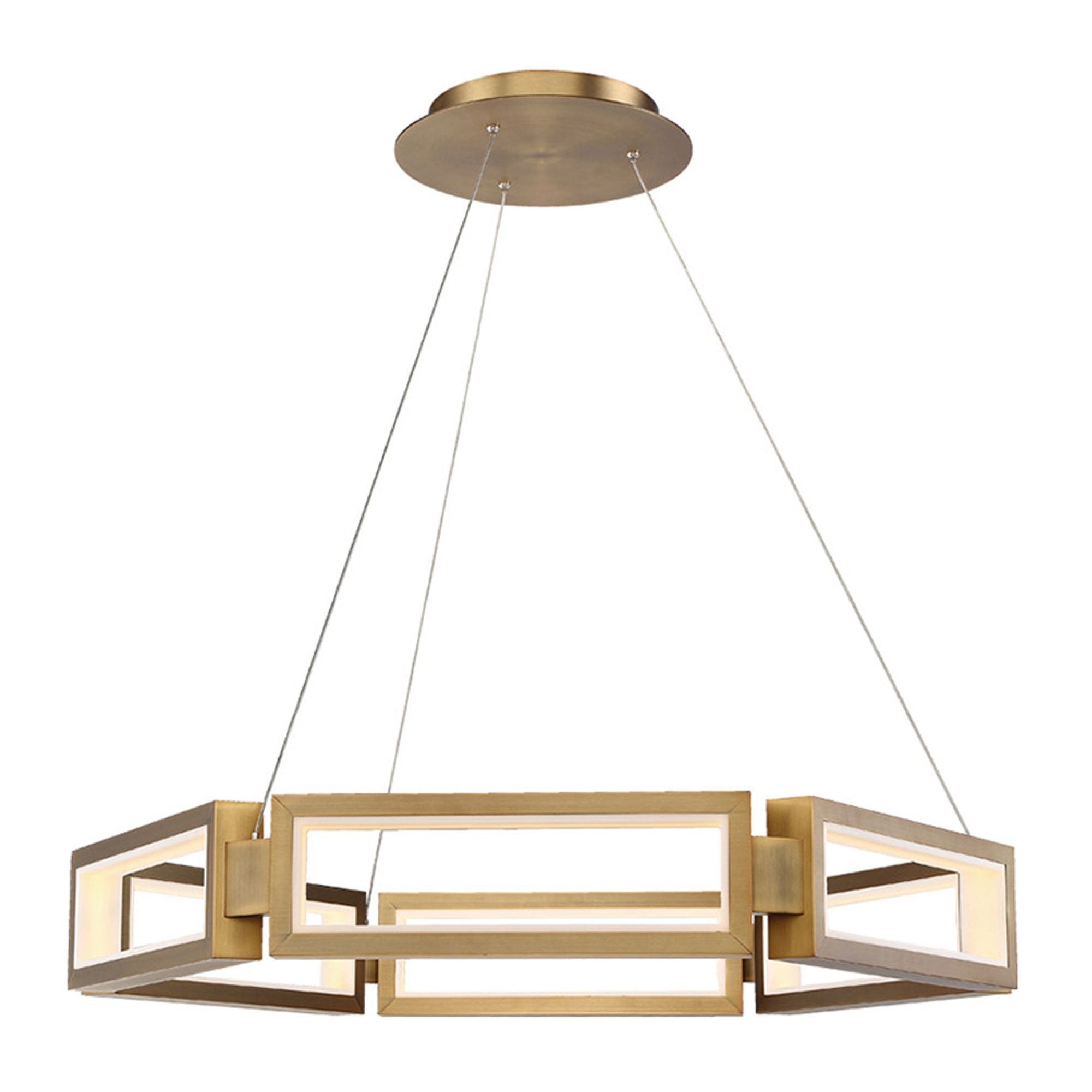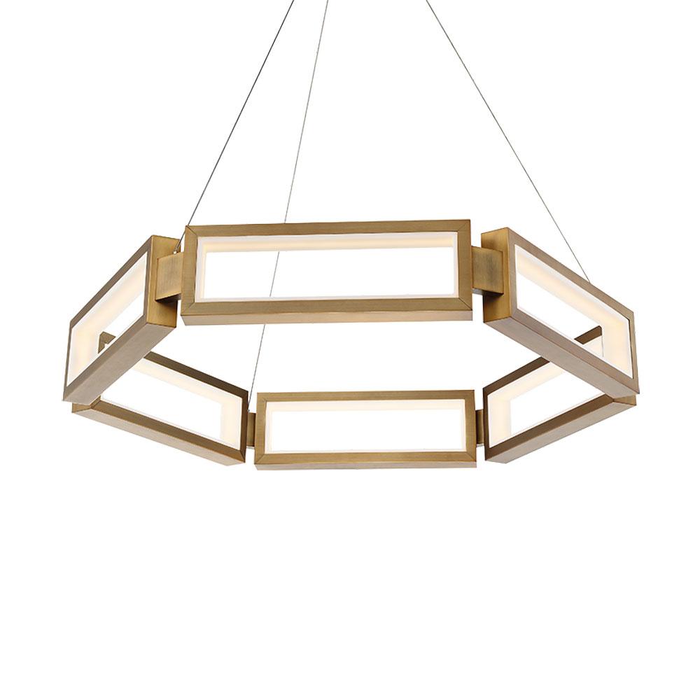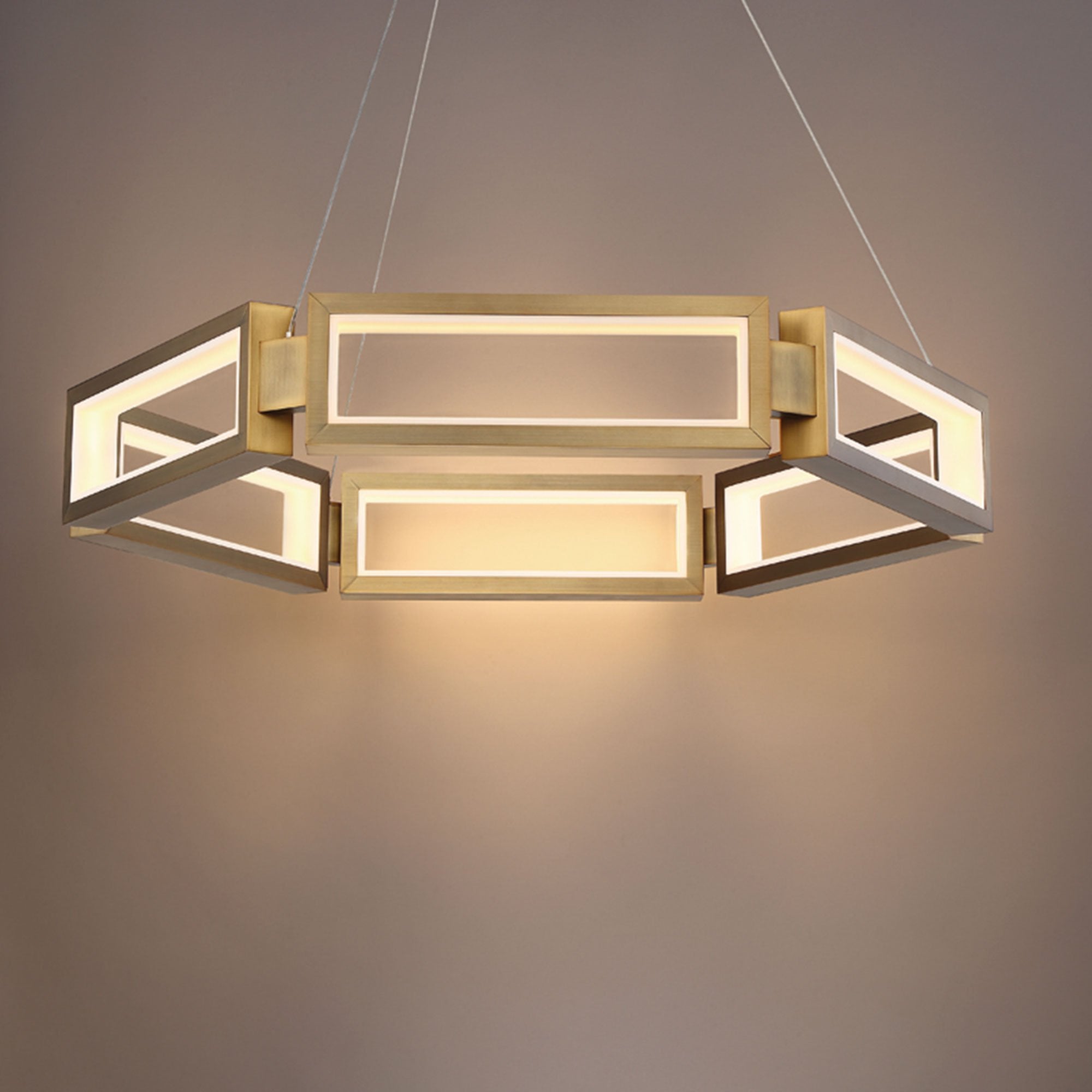 Inspired by Mies van der Rohe, one of the pioneers of modern architecture, this hexagonal chandelier nails the minimalist aesthetic while observing modern décor trends with its aged brass finish. Cutting-edge LED modules bring beautiful light into every setting, while ultra-thin aircraft cables connect the hexagon to a circular canopy for a subtle geometric contrast.
