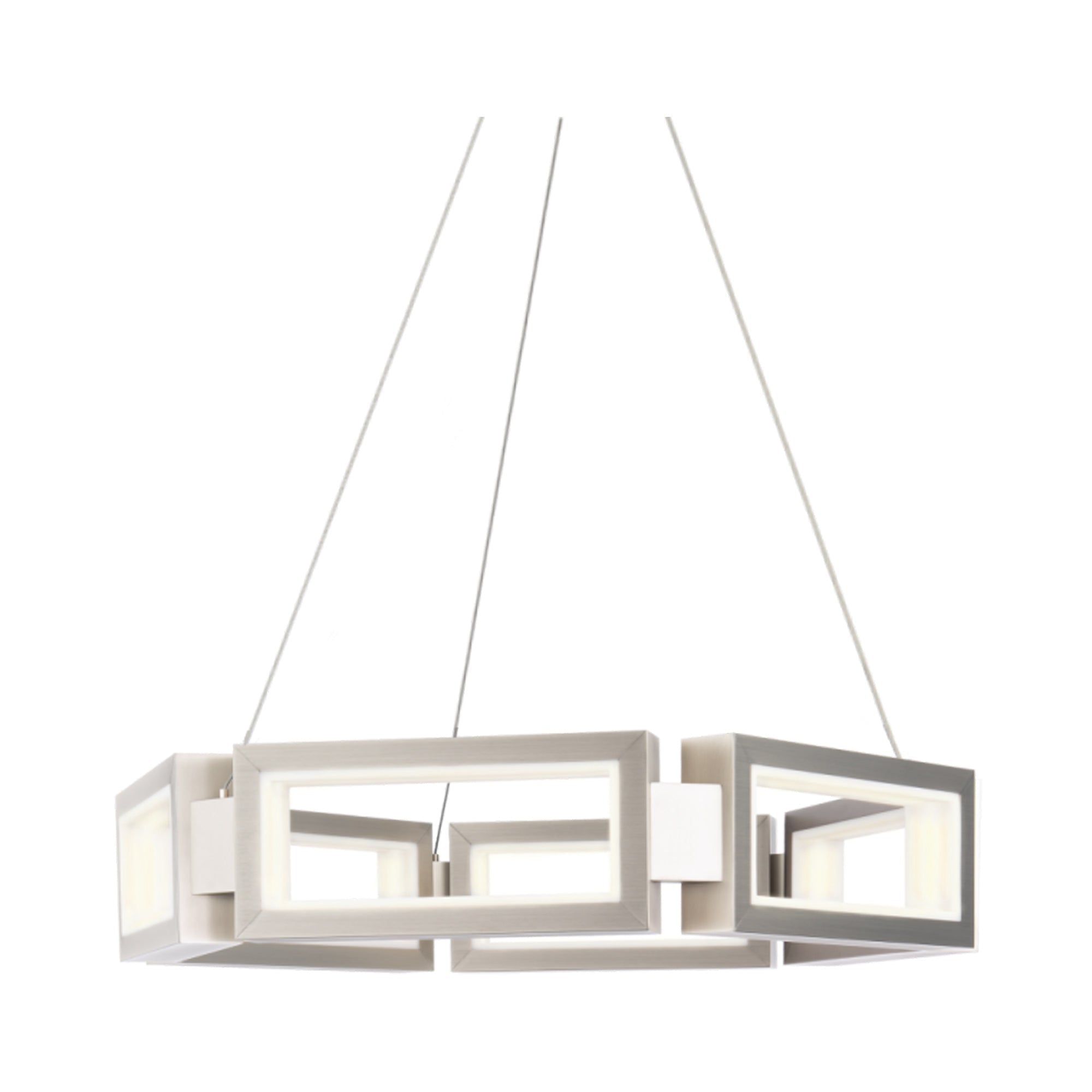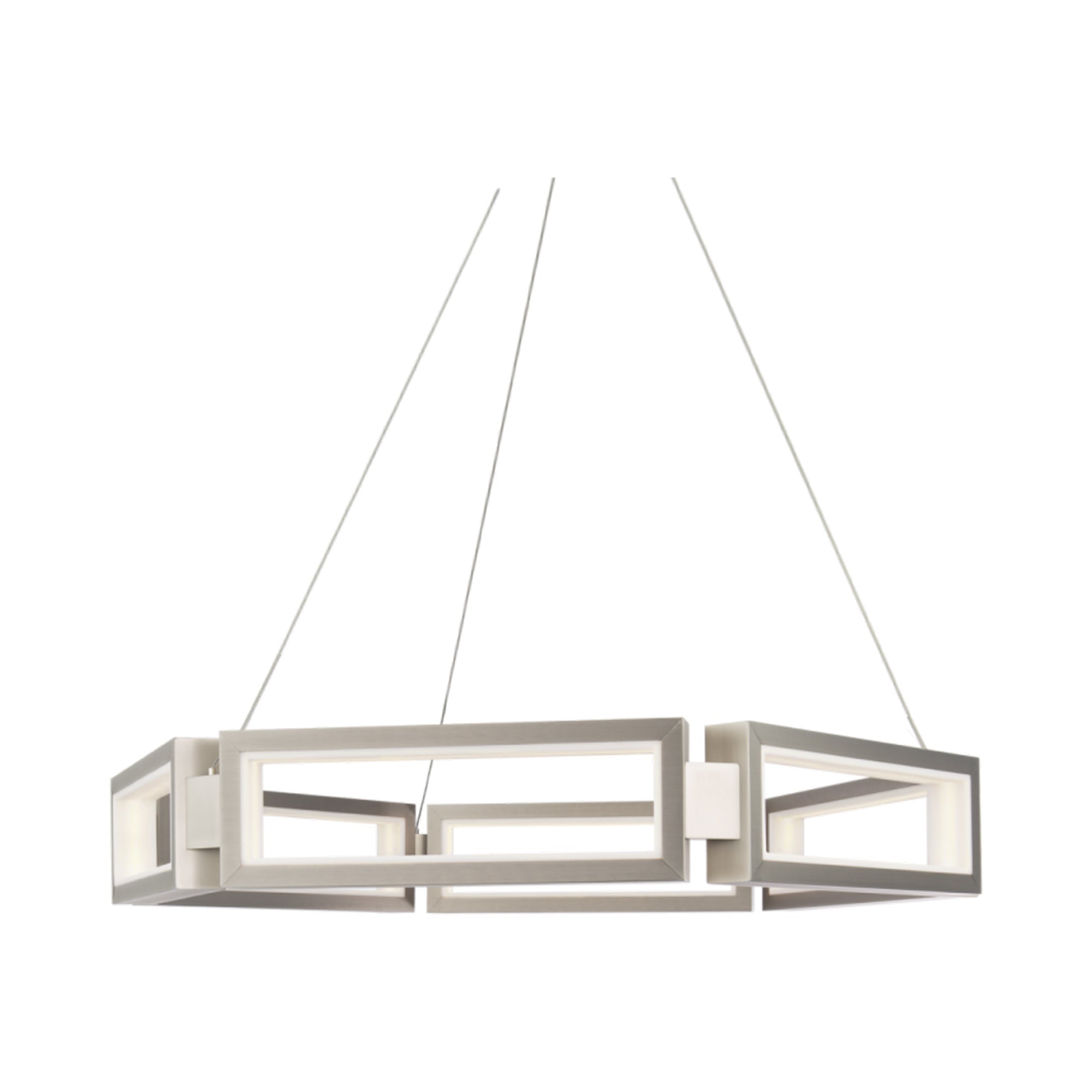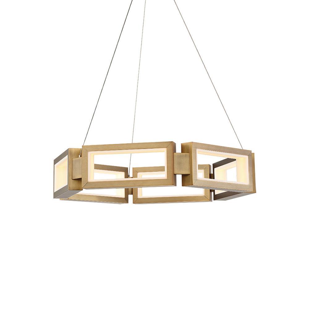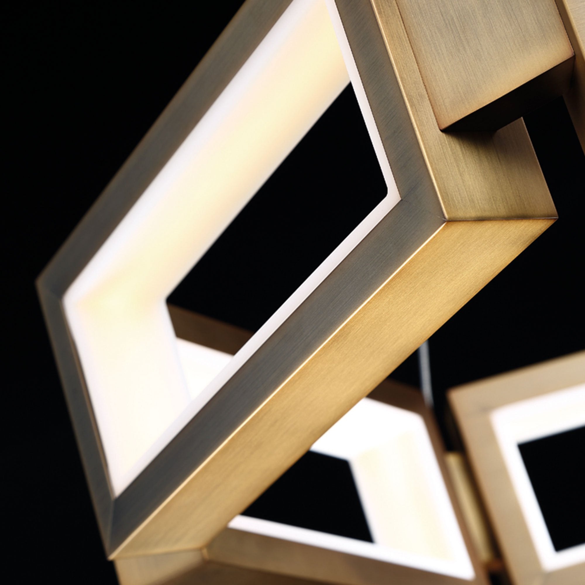Inspired by Mies van der Rohe, one of the pioneers of modern architecture, this hexagonal chandelier nails the minimalist aesthetic while observing modern décor trends with its aged brass finish. Cutting-edge LED modules bring beautiful light into every setting, while ultra-thin aircraft cables connect the hexagon to a circular canopy for a subtle geometric contrast.