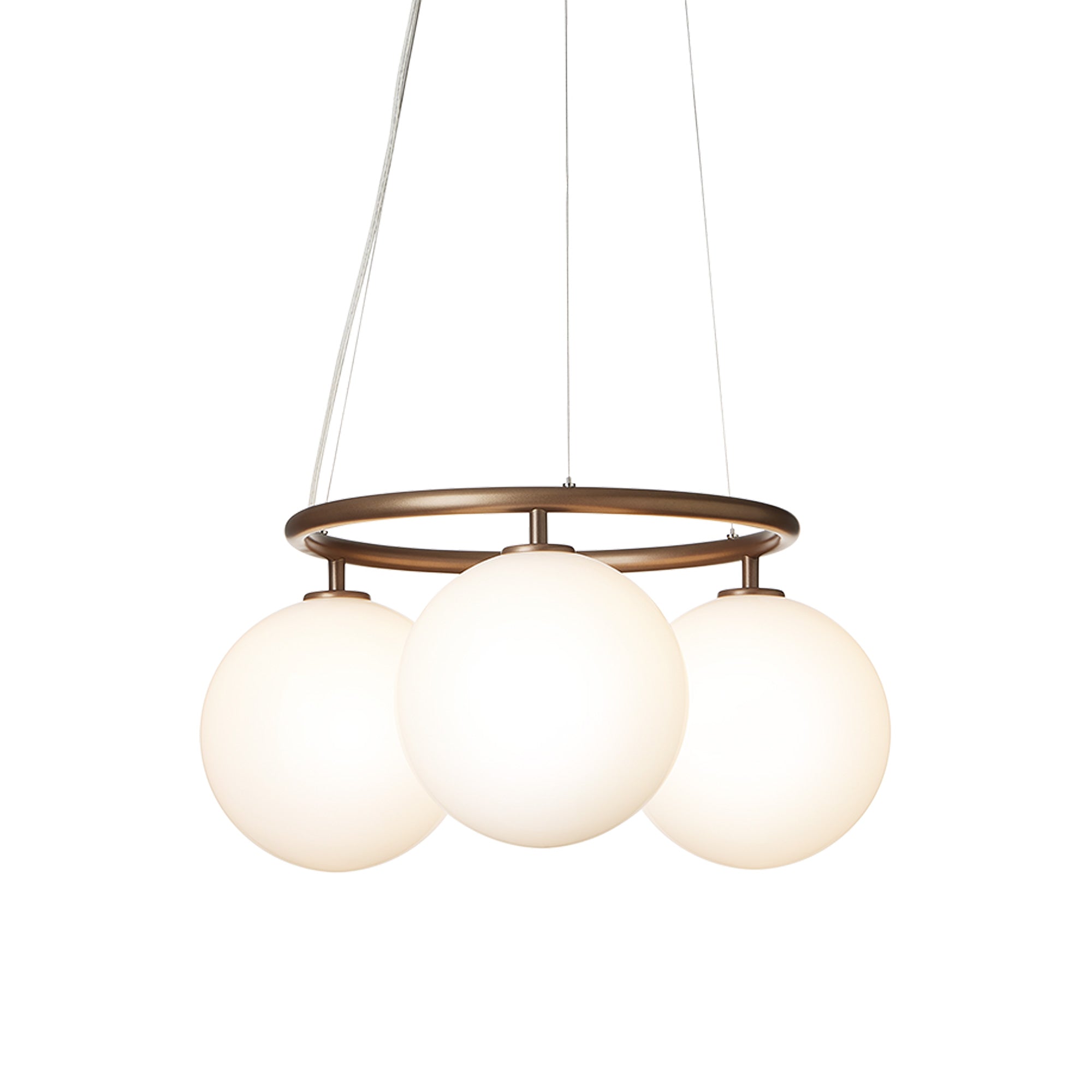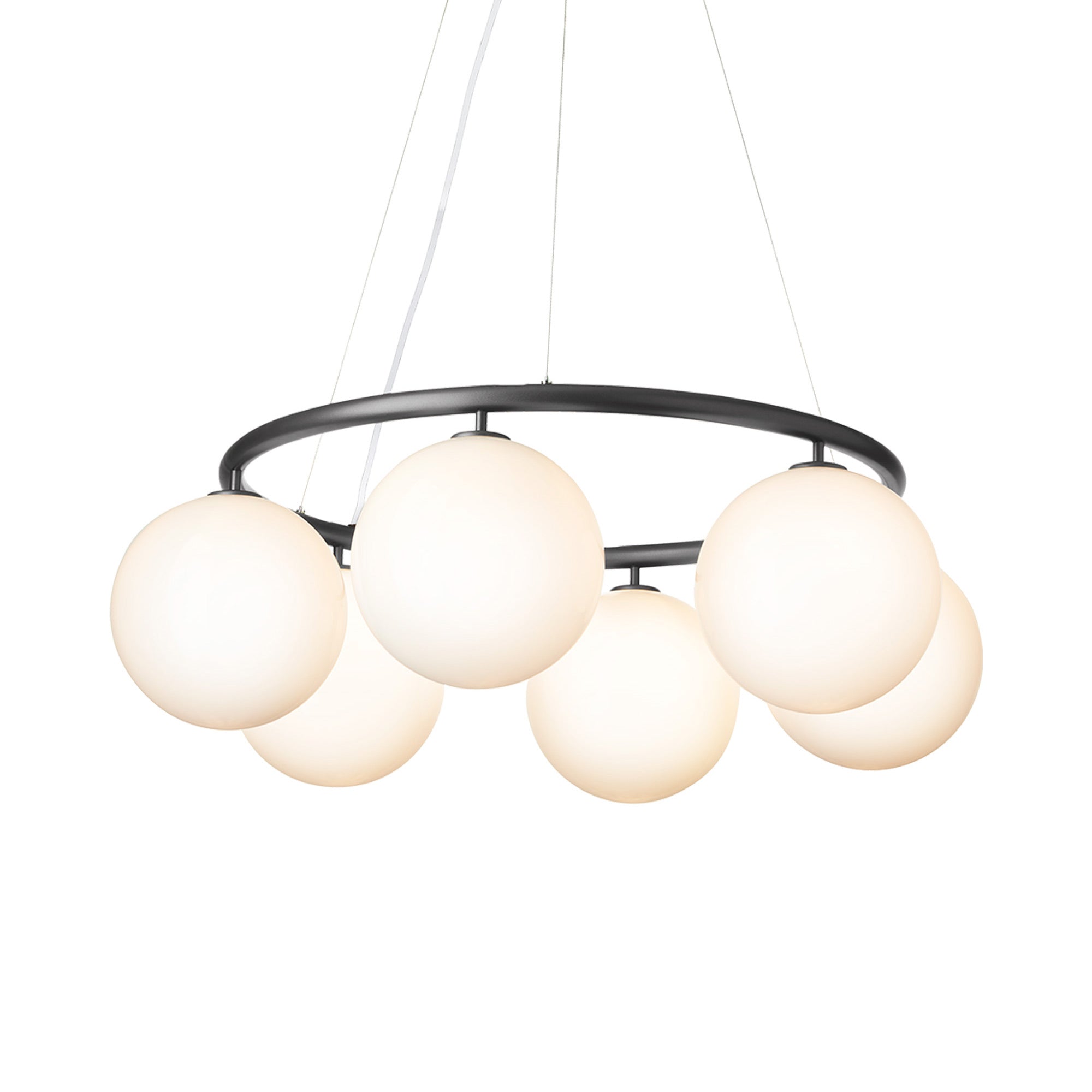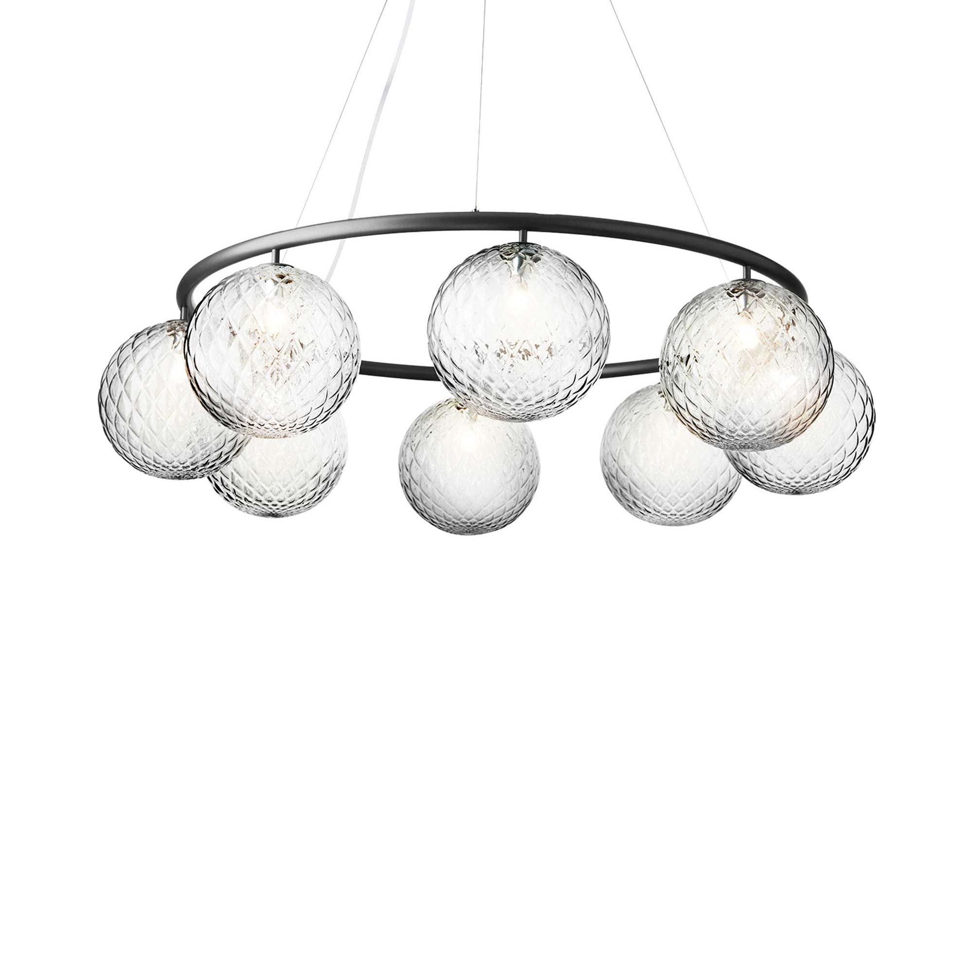 A classic and sophisticated design motif shows off expert configuration with tasteful materials. The Miira Circular Chandelier from Nuura creates a halo-inspired ring of illumination, with metal framing and delicate glass orbs emulating a brilliant display of pearls.