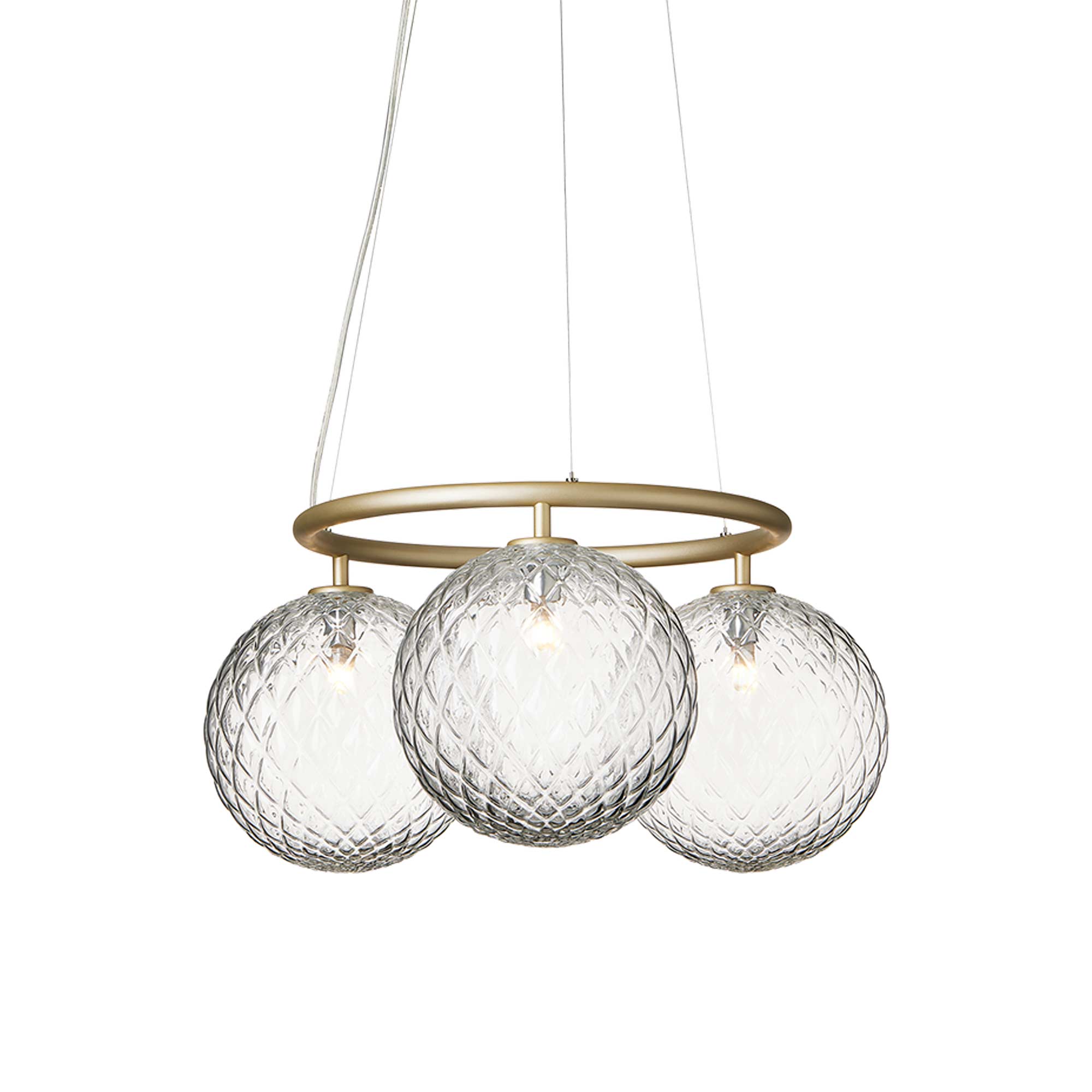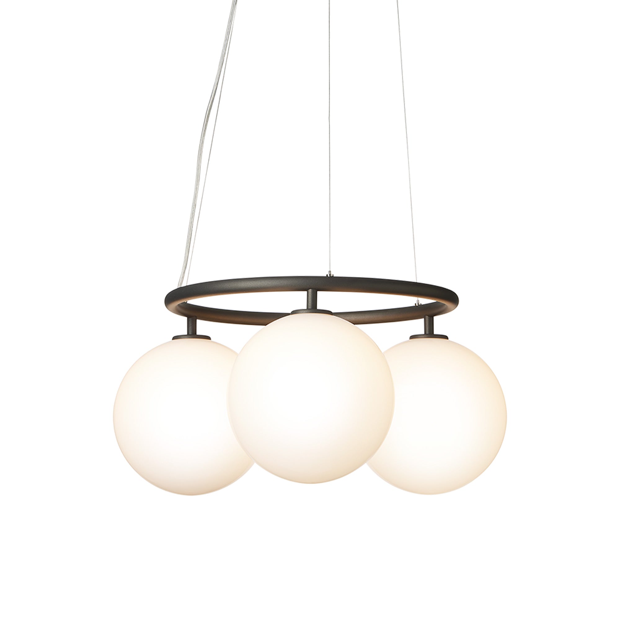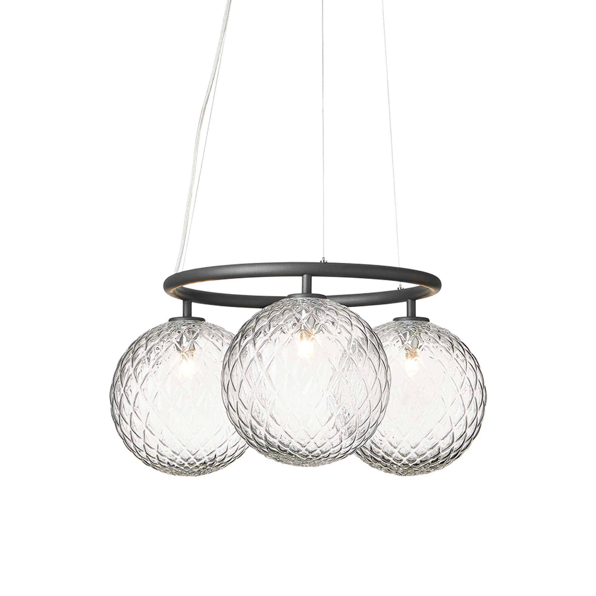 A classic and sophisticated design motif shows off expert configuration with tasteful materials. The Miira Circular Chandelier from Nuura creates a halo-inspired ring of illumination, with metal framing and delicate glass orbs emulating a brilliant display of pearls.