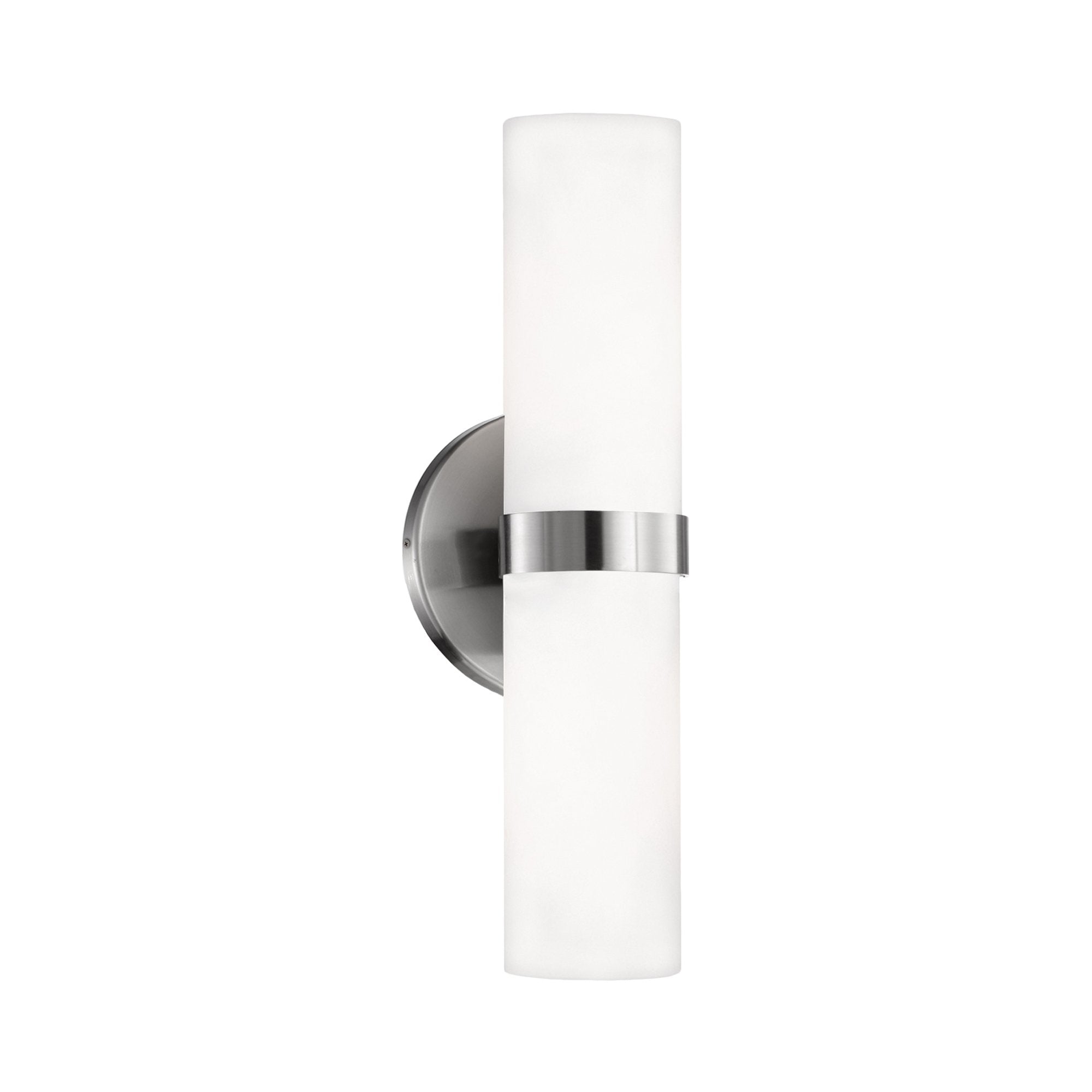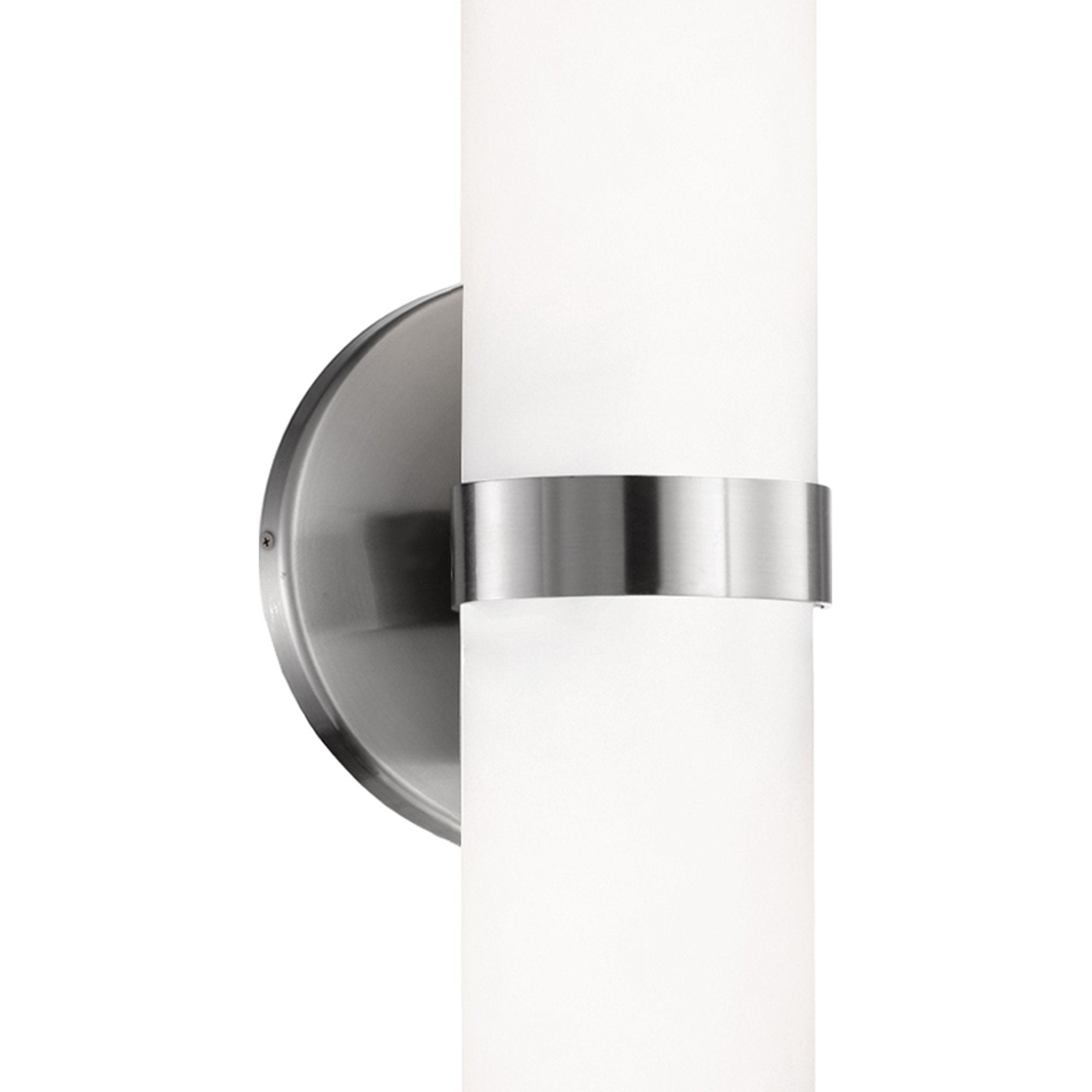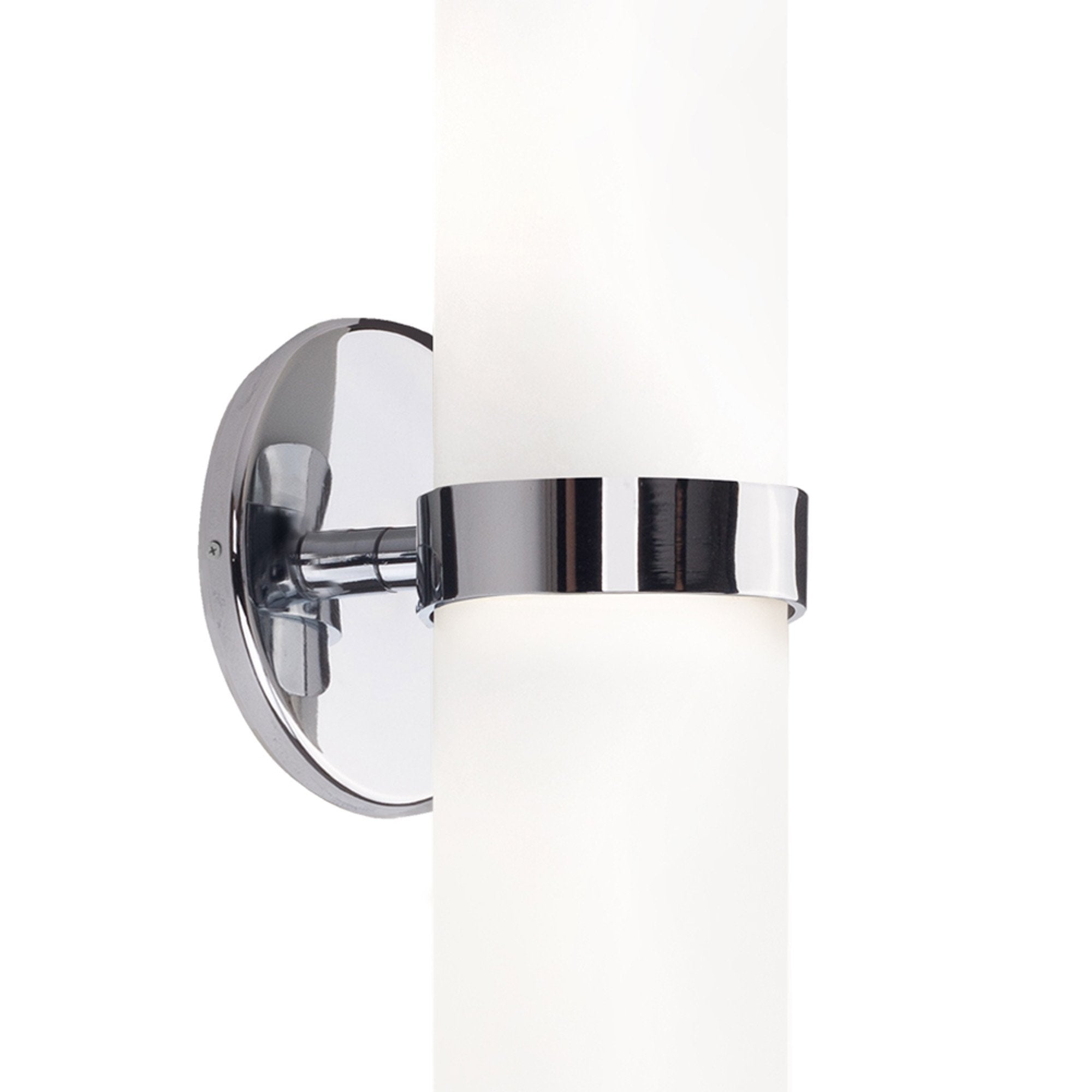 A sleek cylinder 15 inches long conceals the LED light source allowing for an even light distribution, like a scroll of paper that glows with mystery inside. There are no hotspots in this wall sconce, only an ambient glow. The opal glass is attached by a ring of brushed nickel, chrome, or vintage brass around the middle and affixed to the wall by a matching metal disk.