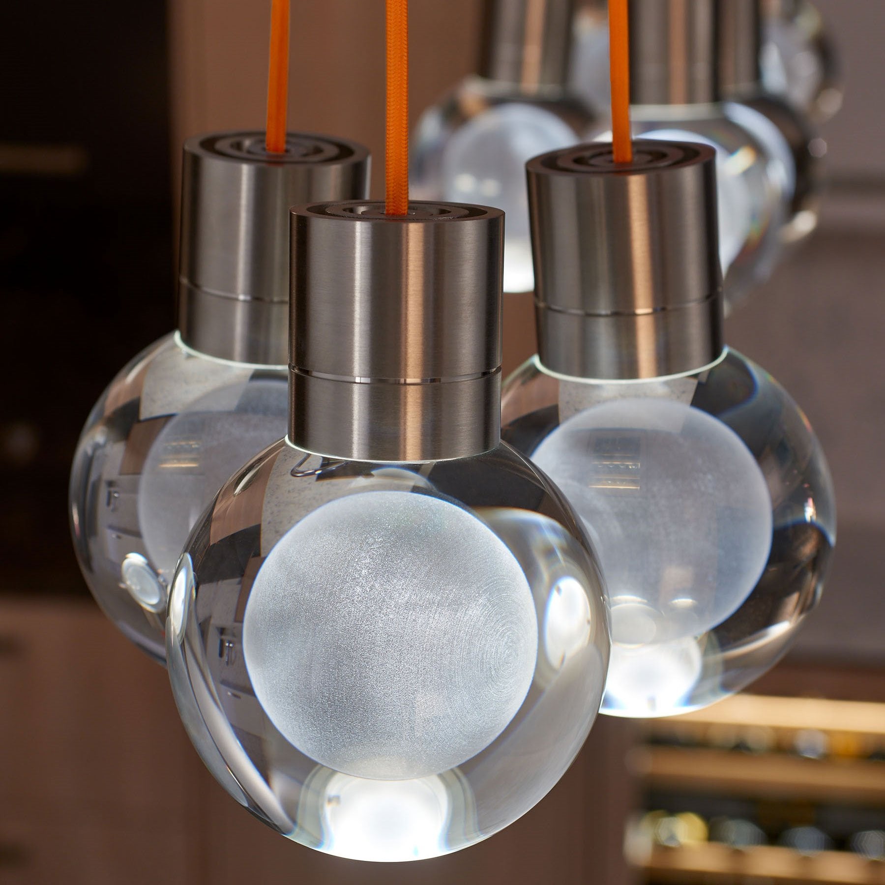 The Mina LED Multipoint Pendant Light by Sean Lavin for Visual Comfort Modern features an elegant sphere of pure optic crystal. This beautiful floating orb is laser-etched and further illuminated by a powerful downward-firing LED hidden within the socket. Although smaller in diameter, the Mina brilliantly provides a bounty of task light onto surfaces below. Highly customizable, the Mina LED Multipoint Pendant Light features 8 cord colors and three on-trend finish options. The Mina ships with your choice of fully dimmable LED lamping. In addition to the wide range of customizable options, the Mina Pendant also comes with two complementary accessory options. Swag Hooks and the Locus accessory. Due to its contemporary yet raw style, the Mina can be used in a range of consumer and commercial lighting applications.