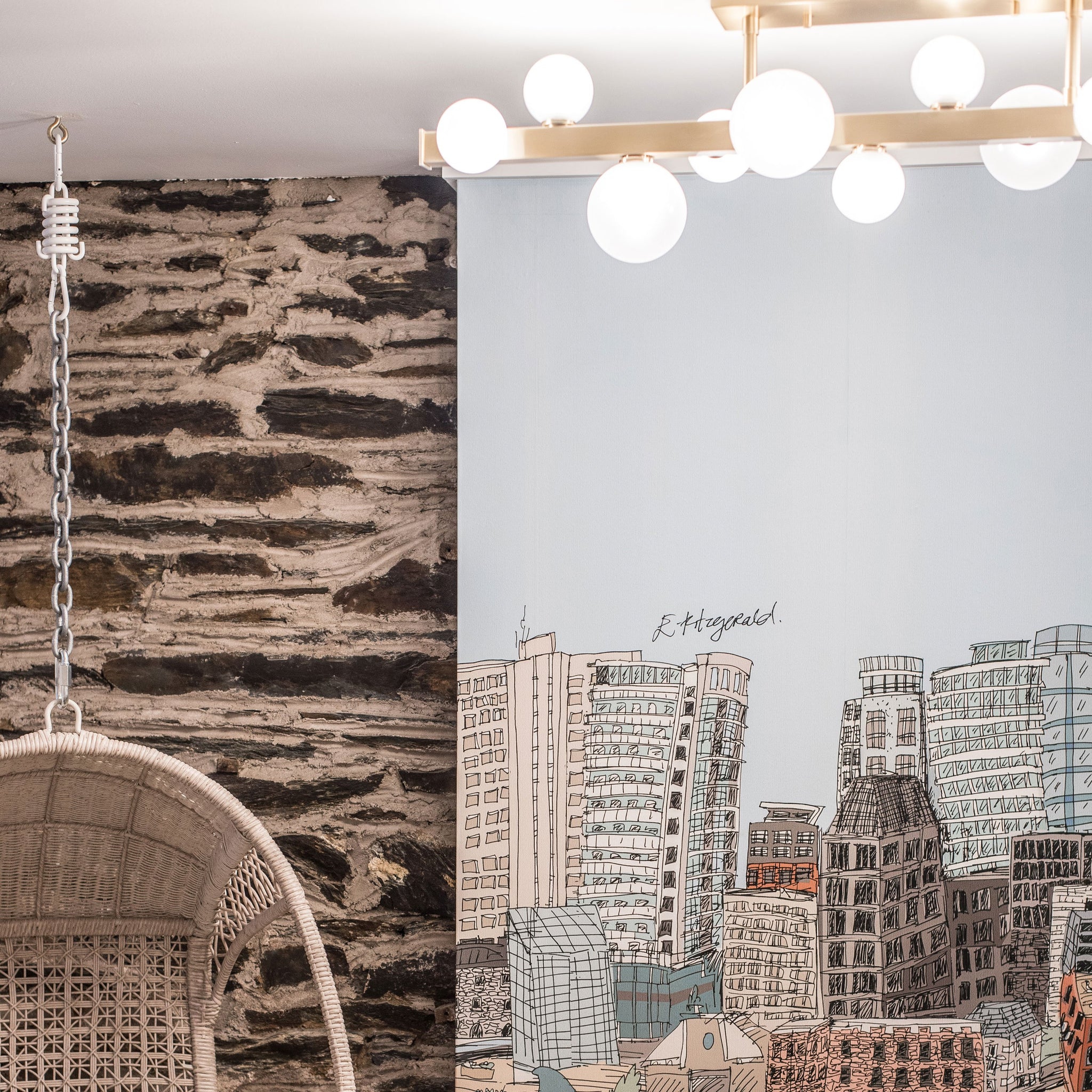 Playful and minimal, orbs of light cluster around a square metal beam as if some unseen magnetism were at work. Hand-blown glass spheres are finely etched inside while maintaining a clear glossy sheen on the outside. The result is a pleasing diffusion of light. Hinsdale exhibits sophistication and confidence.