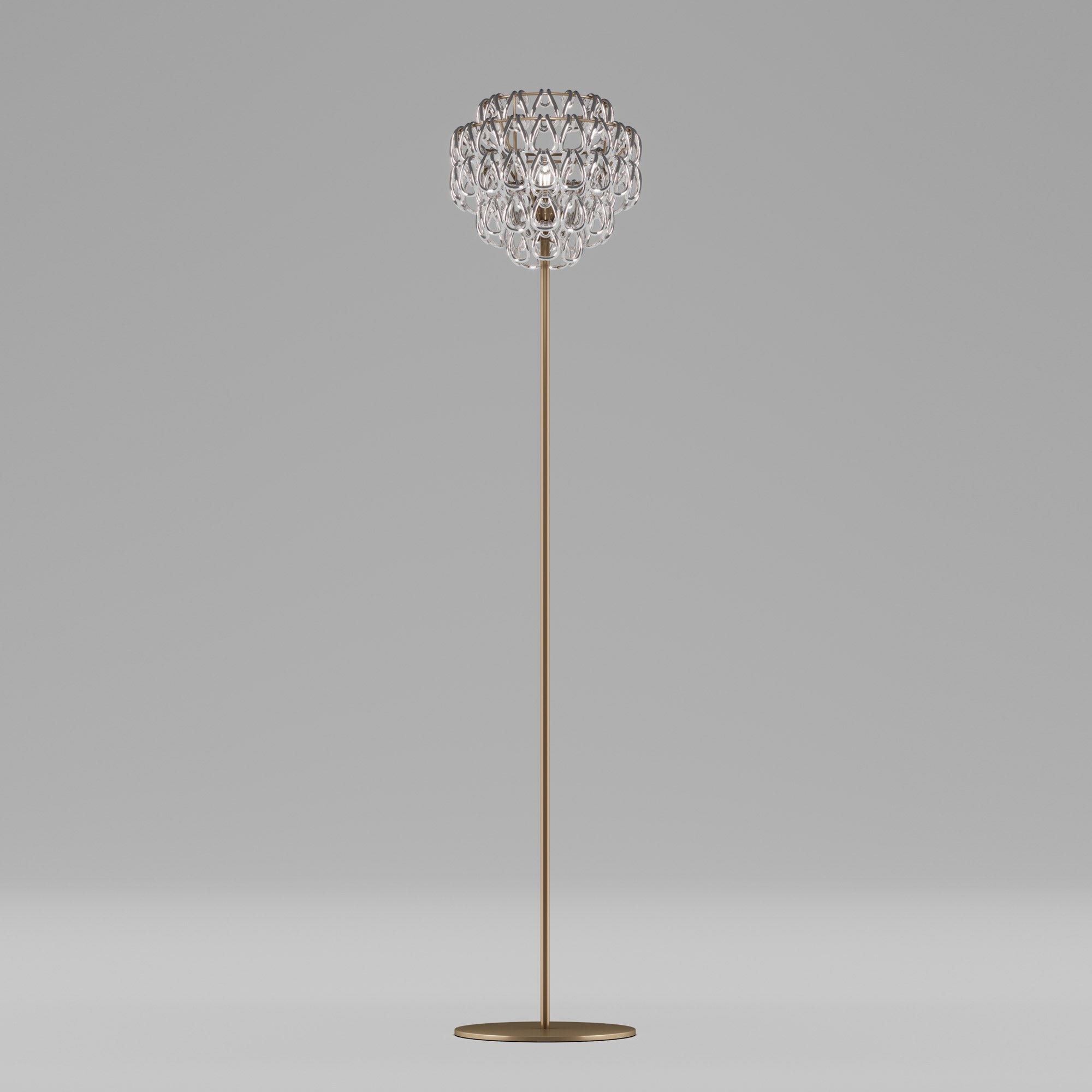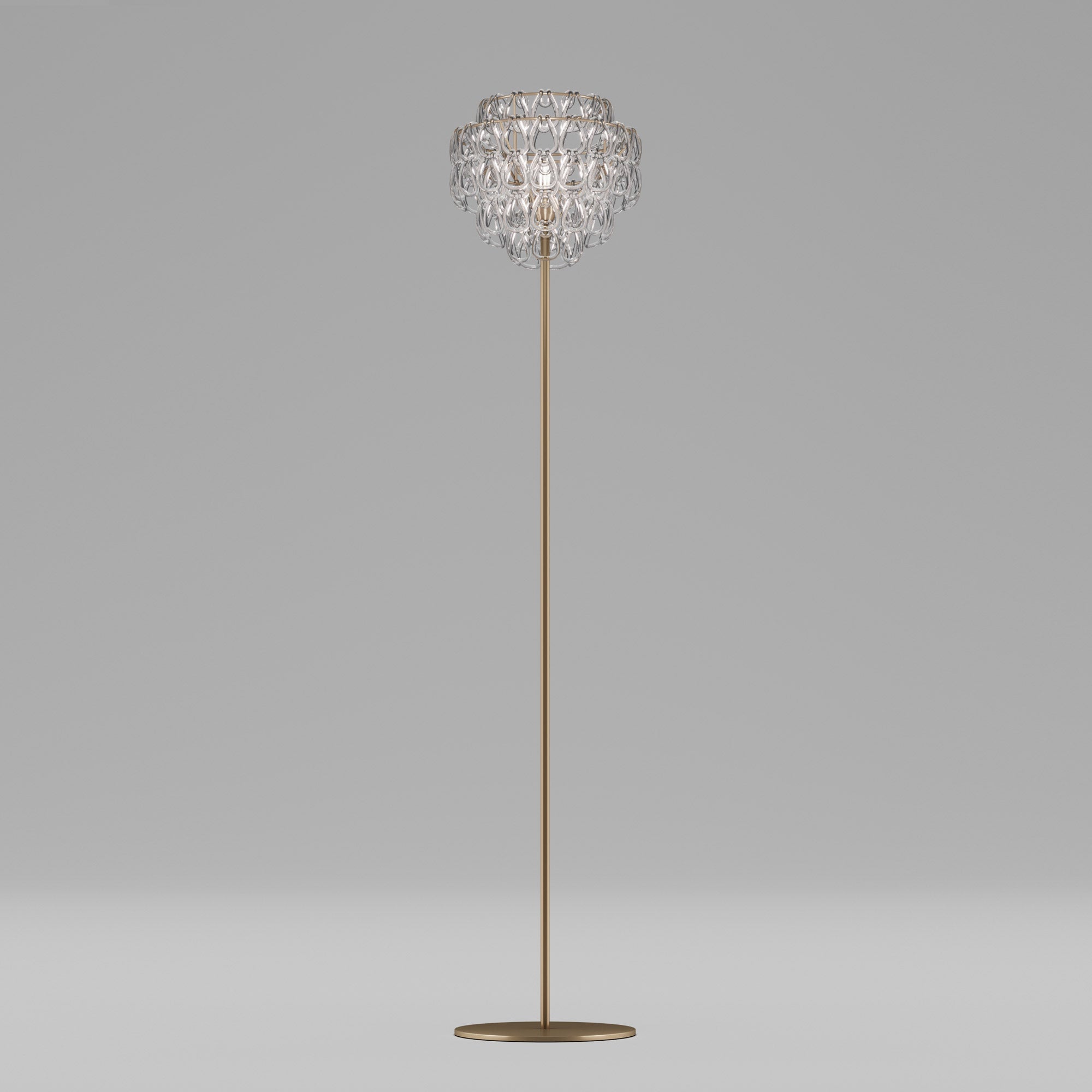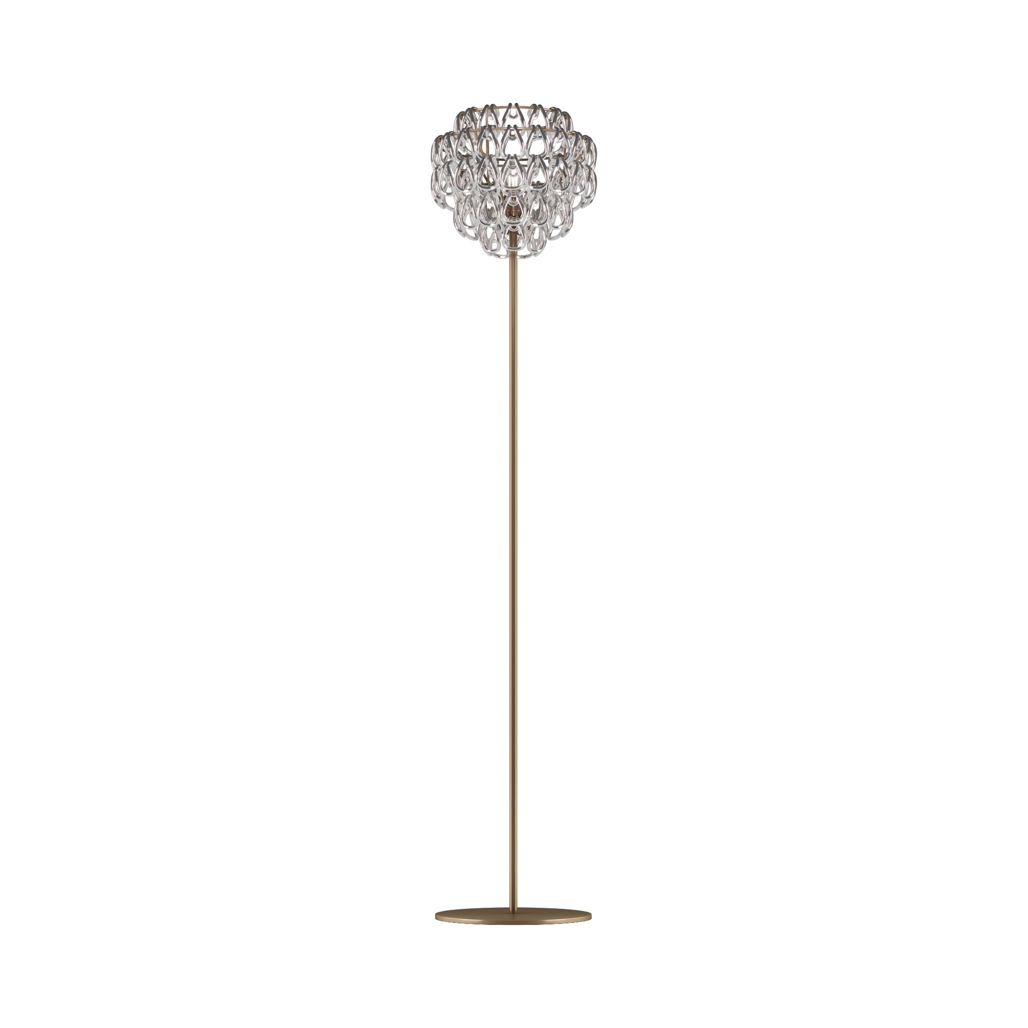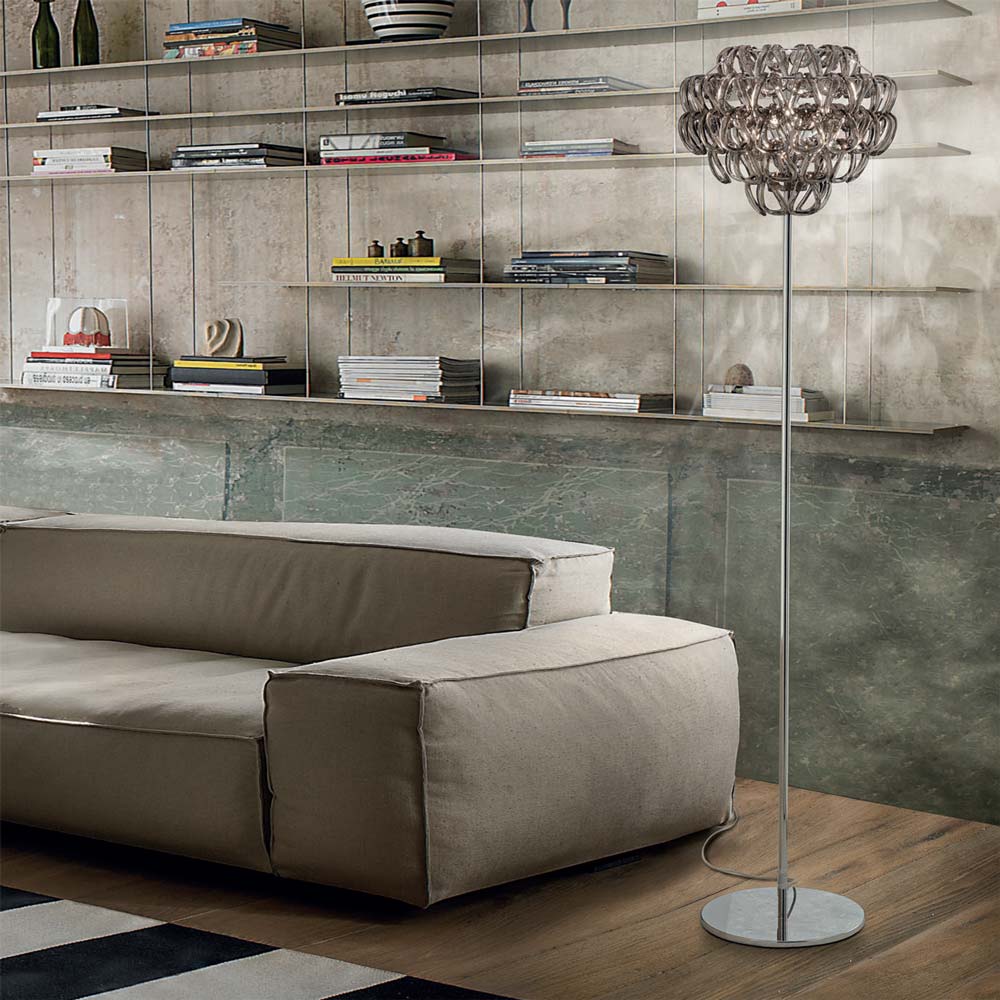 Indulgent with an artisan glass feel, the Minigiogali Floor Lamp from Vistosi contributes to a chic interior design scheme as it offers soft lighting for ambient illumination. This decadent lamp delivers careful design strategy with layered rows of delicate glass hooks forming a demi-shade. A slender metal frame and base shift focus to the sophisticated gallery quality of a standout shade design.