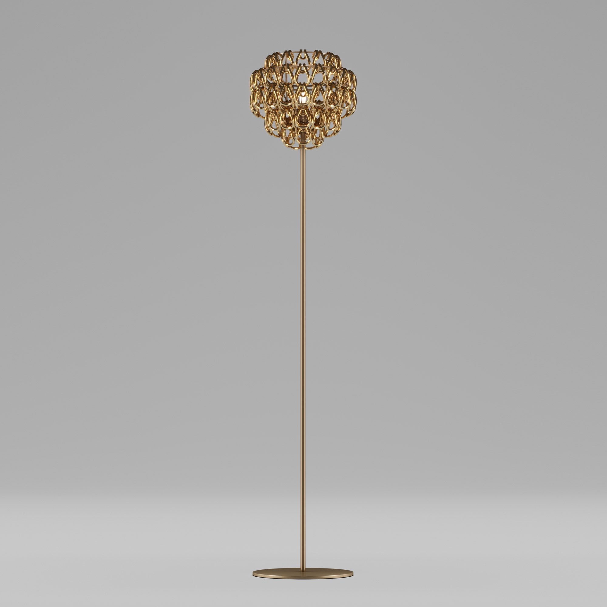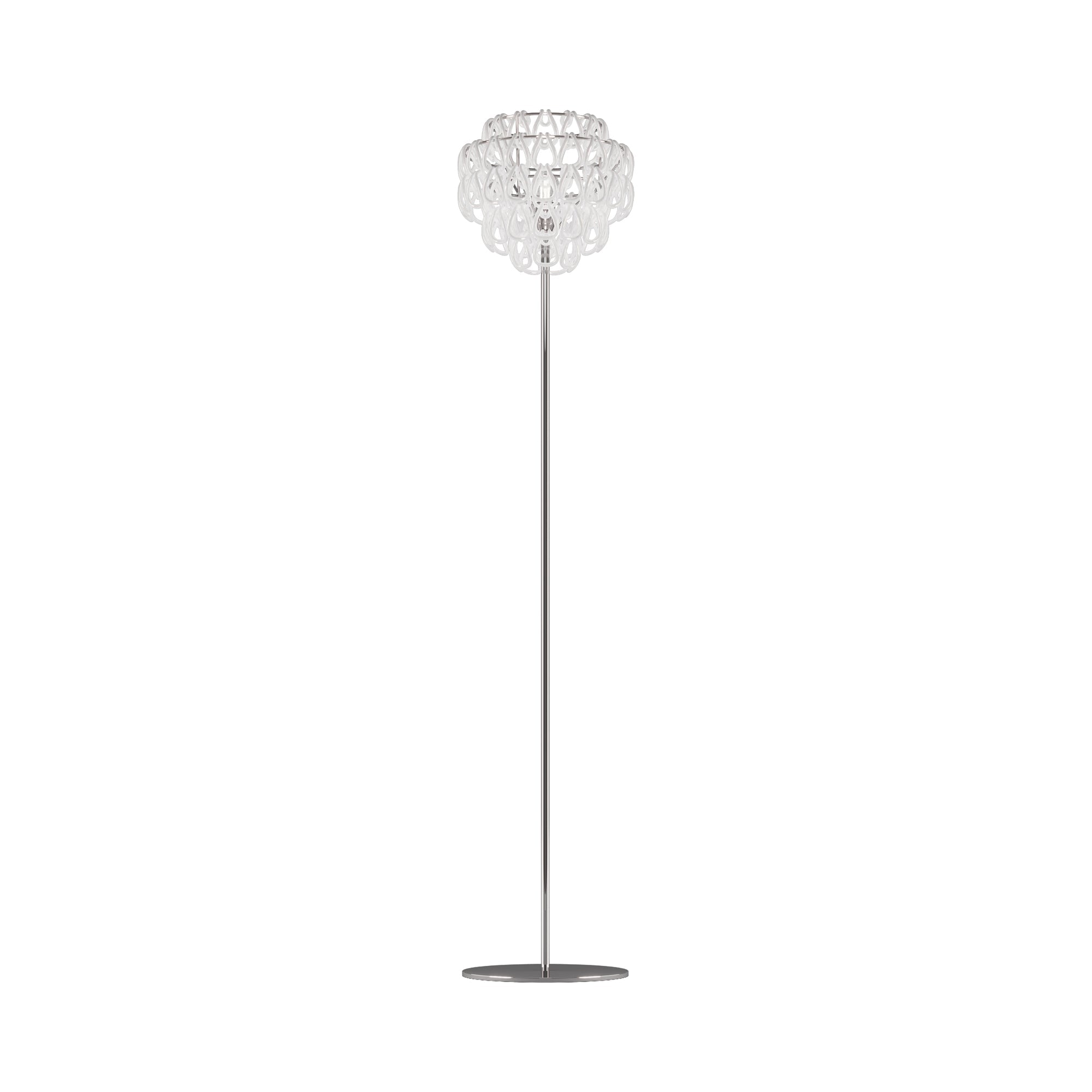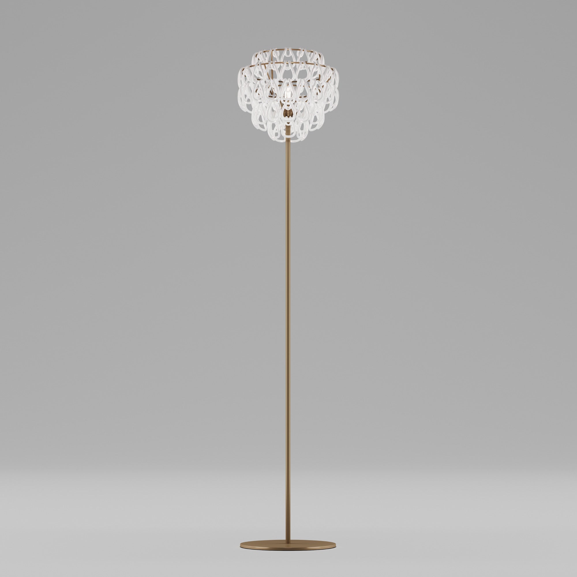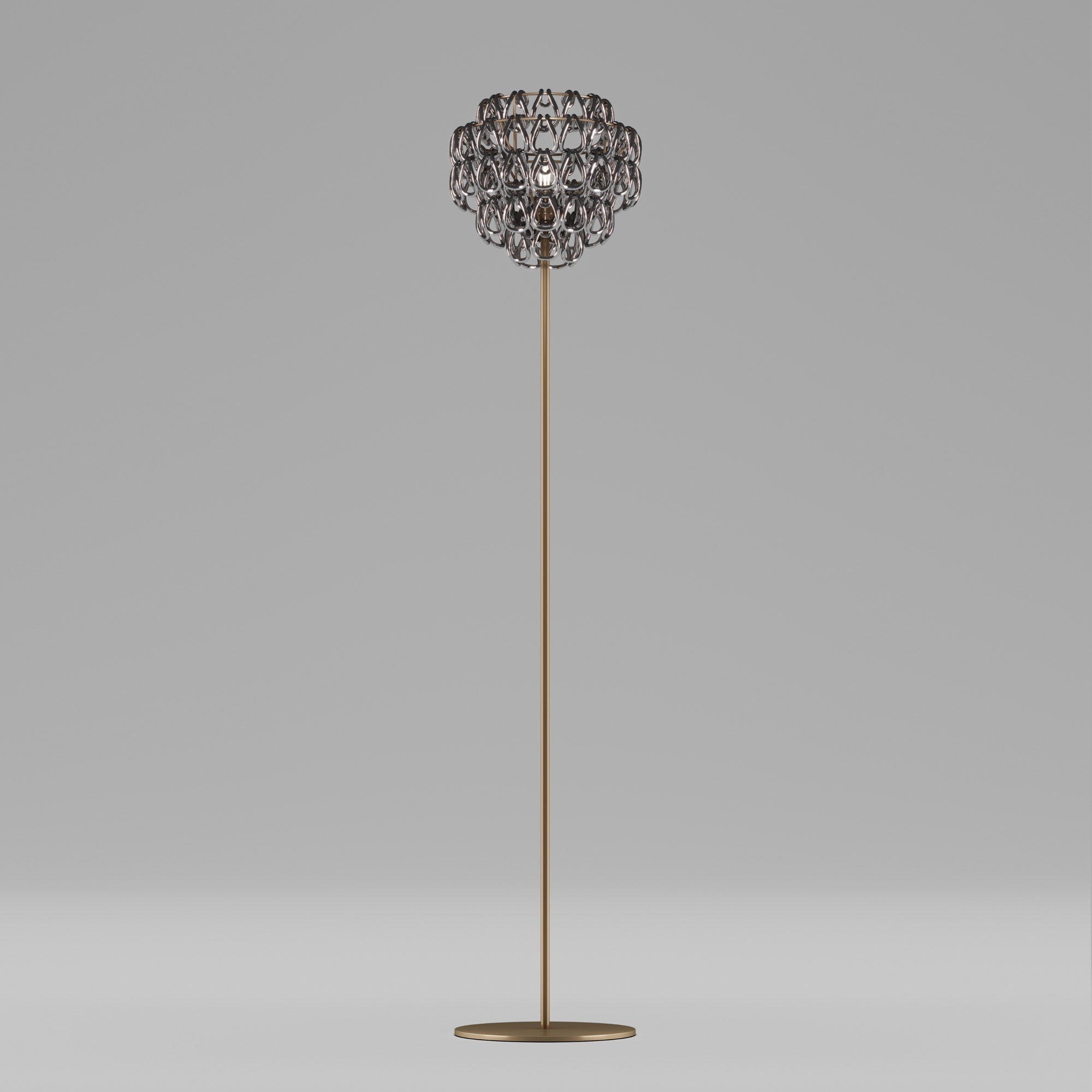 Indulgent with an artisan glass feel, the Minigiogali Floor Lamp from Vistosi contributes to a chic interior design scheme as it offers soft lighting for ambient illumination. This decadent lamp delivers careful design strategy with layered rows of delicate glass hooks forming a demi-shade. A slender metal frame and base shift focus to the sophisticated gallery quality of a standout shade design.