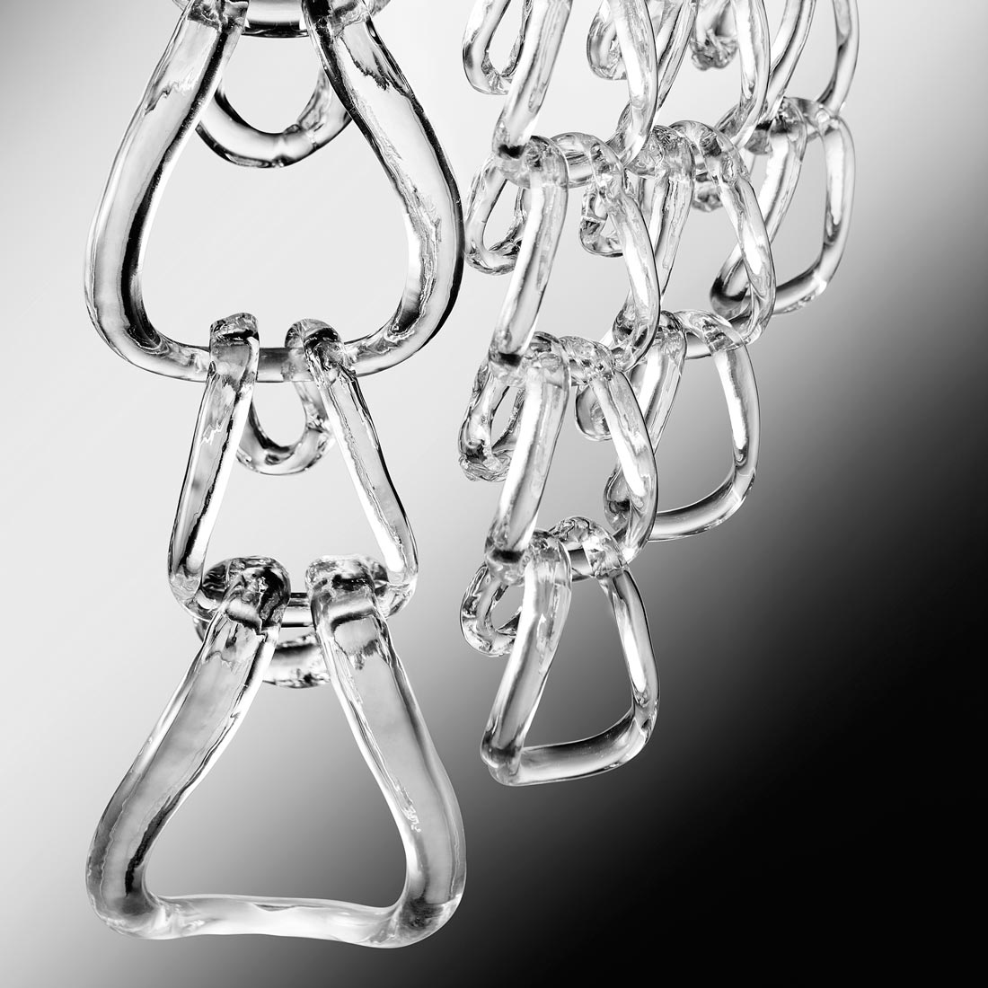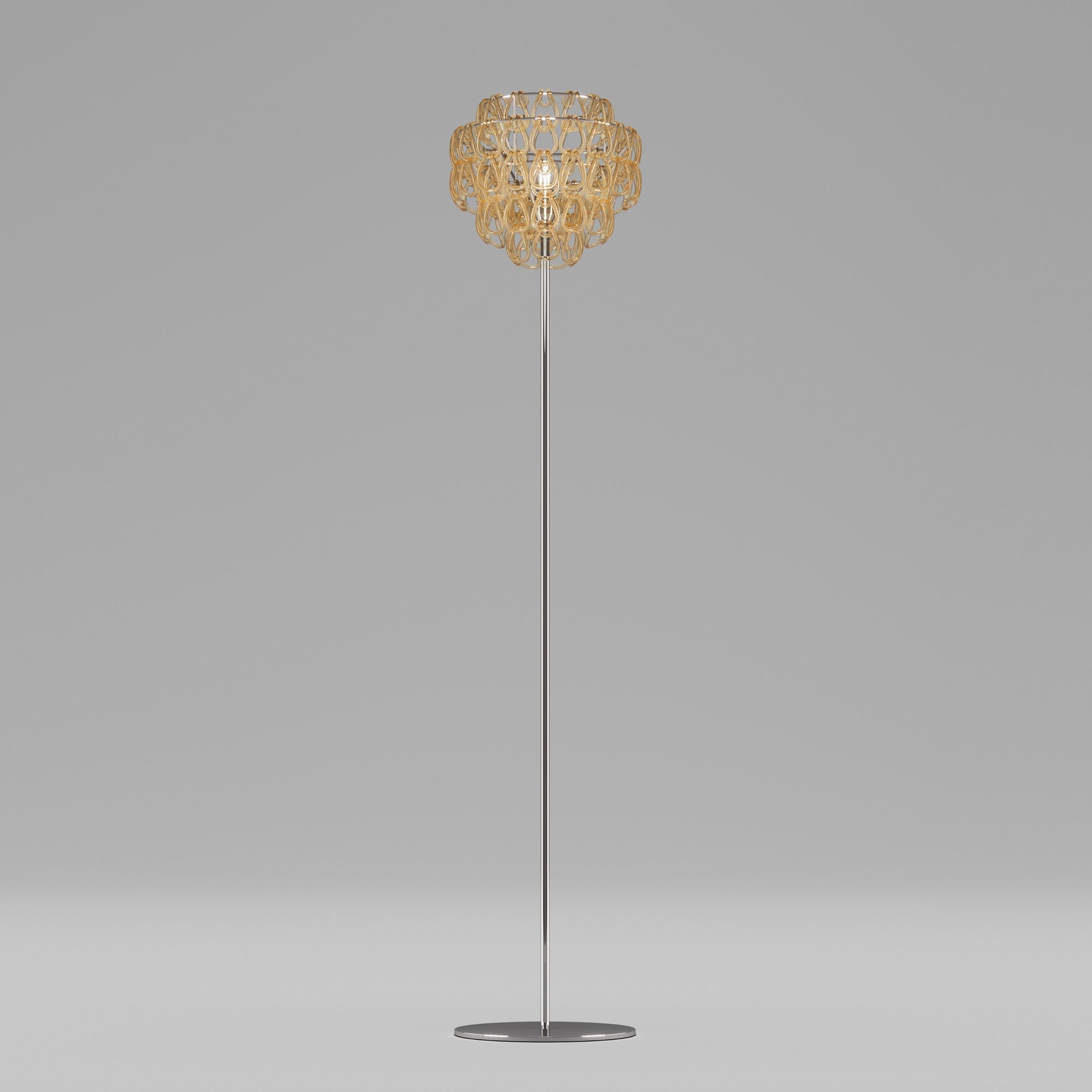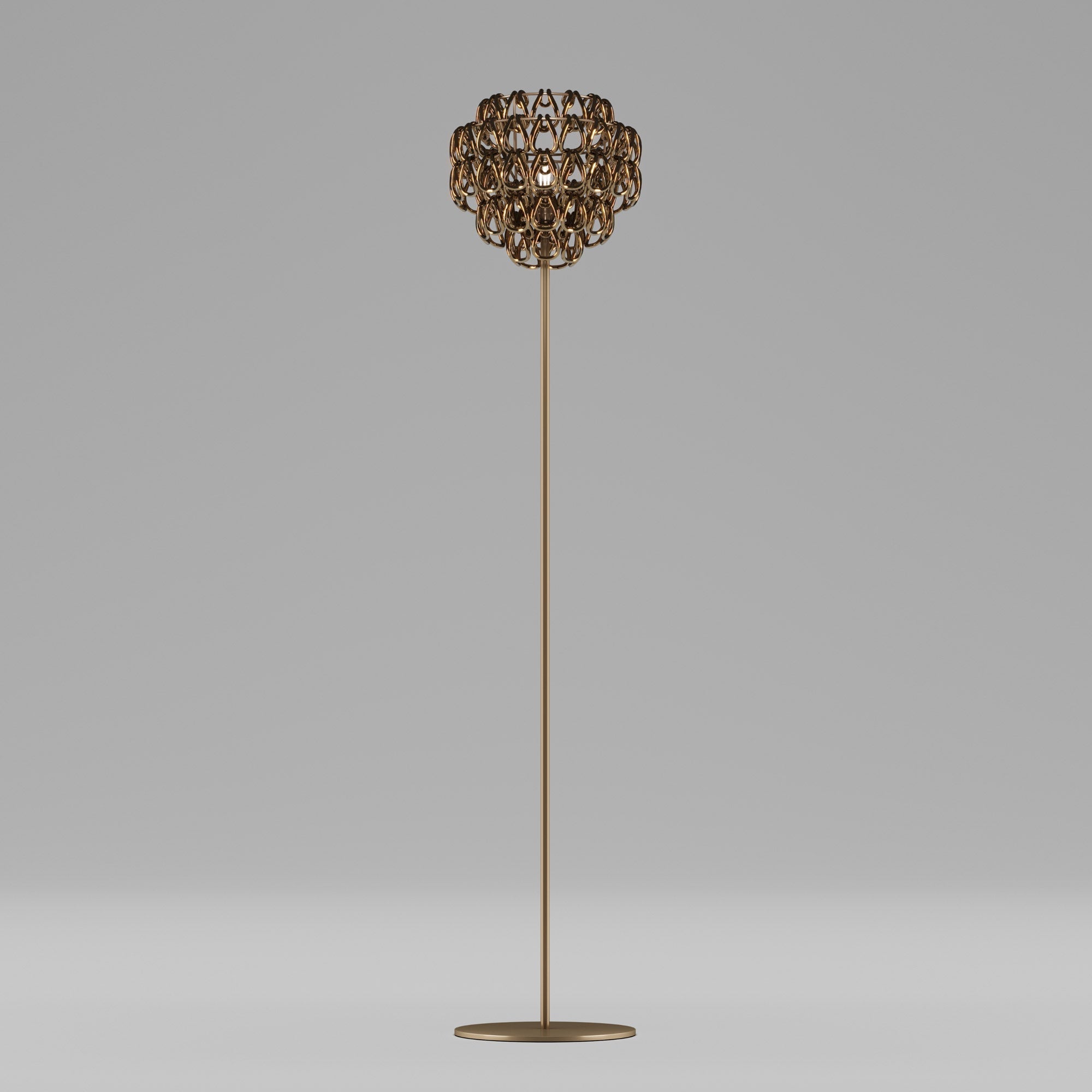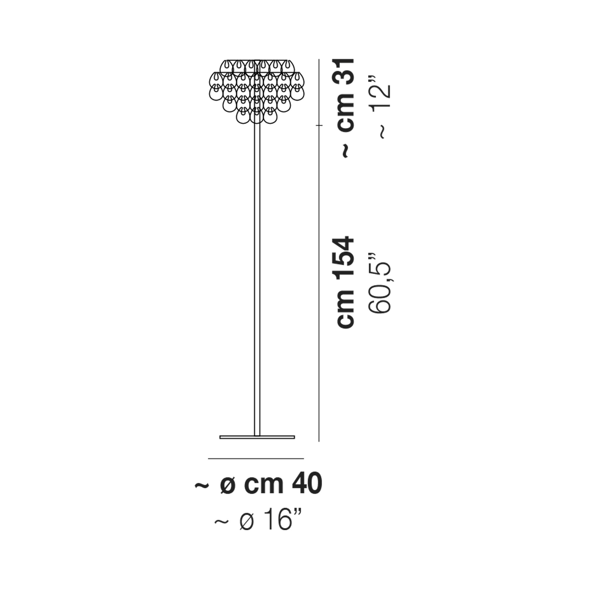 Indulgent with an artisan glass feel, the Minigiogali Floor Lamp from Vistosi contributes to a chic interior design scheme as it offers soft lighting for ambient illumination. This decadent lamp delivers careful design strategy with layered rows of delicate glass hooks forming a demi-shade. A slender metal frame and base shift focus to the sophisticated gallery quality of a standout shade design.