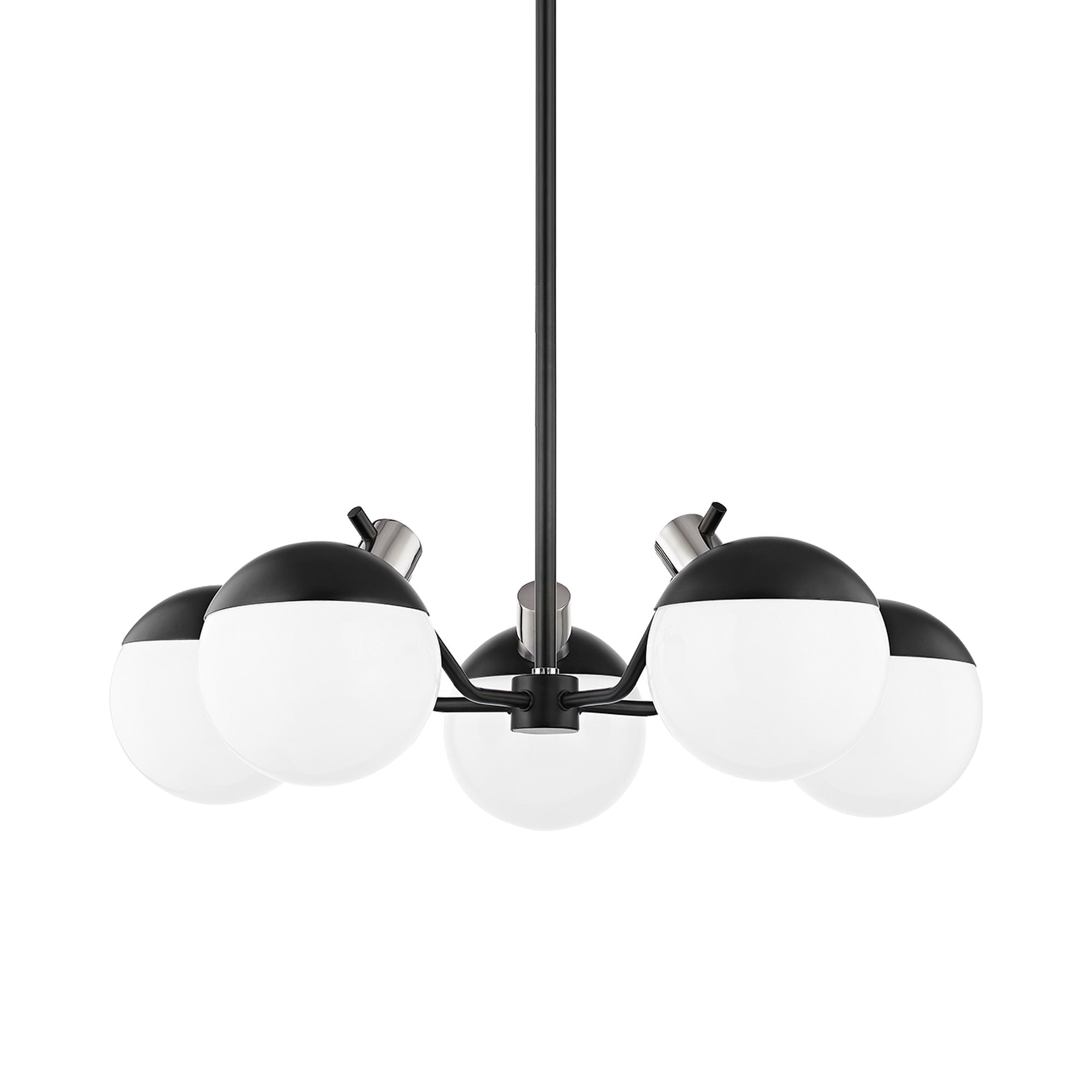 Miranda is a master of mod, serving up high contrast and perfect form in her delightfully polished silhouette. A soft black frame and globe cap are the constant, complemented by either aged brass or polished nickel. Available as a wall sconce, flush mount, chandelier, and table lamp.