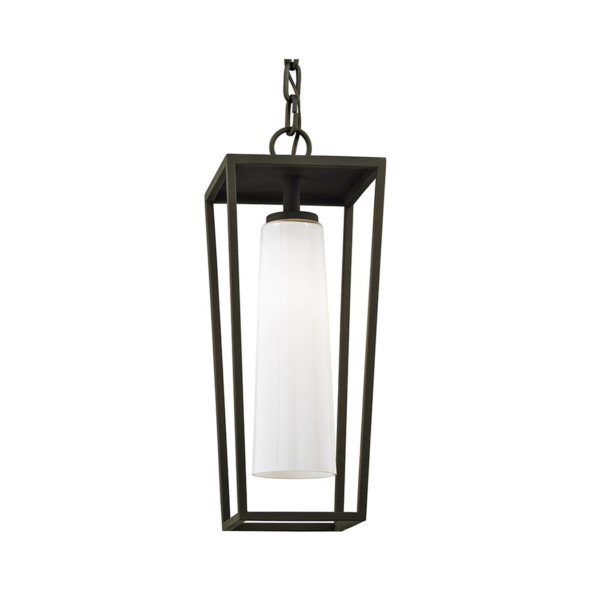 The Mission Beach Outdoor Pendant Light from Troy Lighting leans on slick tapered styling in a textured black finish metal open frame and a cylinder shade fashioned of sleek opal white glass.