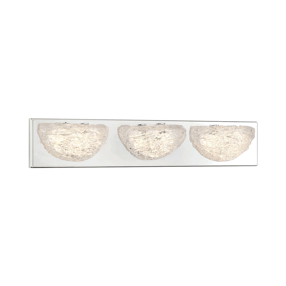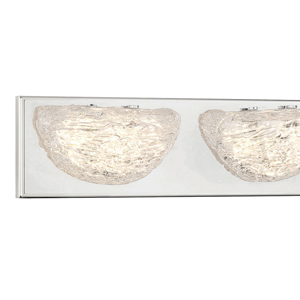 The glam look of frosty ambiance plays out in sophisticated style in a bath fixture with the power to captivate. The Modern Ice LED Vanity Wall Light from George Kovacs frames a vanity, adding decadence with its textured clear artisan glass shades and gleaming chrome finish metal backplate. Transform the entire aesthetic of a new or repurposed master suite with this exquisite, energy-efficient fixture.