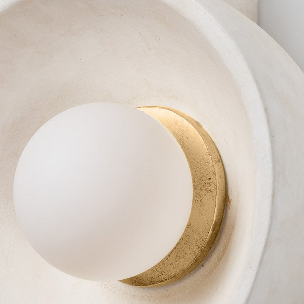 Explore the novelty of design and shaping in a casual space. The Modesto Wall Light from Troy Lighting adopts a hint of nautical fare with its finned dome shade fashioned of textural fossil white finish ceramic. A center socket rimmed with a heavenly vintage gold leaf finish ring suggests a pearl-in-clam motif if a recommended globe bulb is chosen to finish a romantic look.