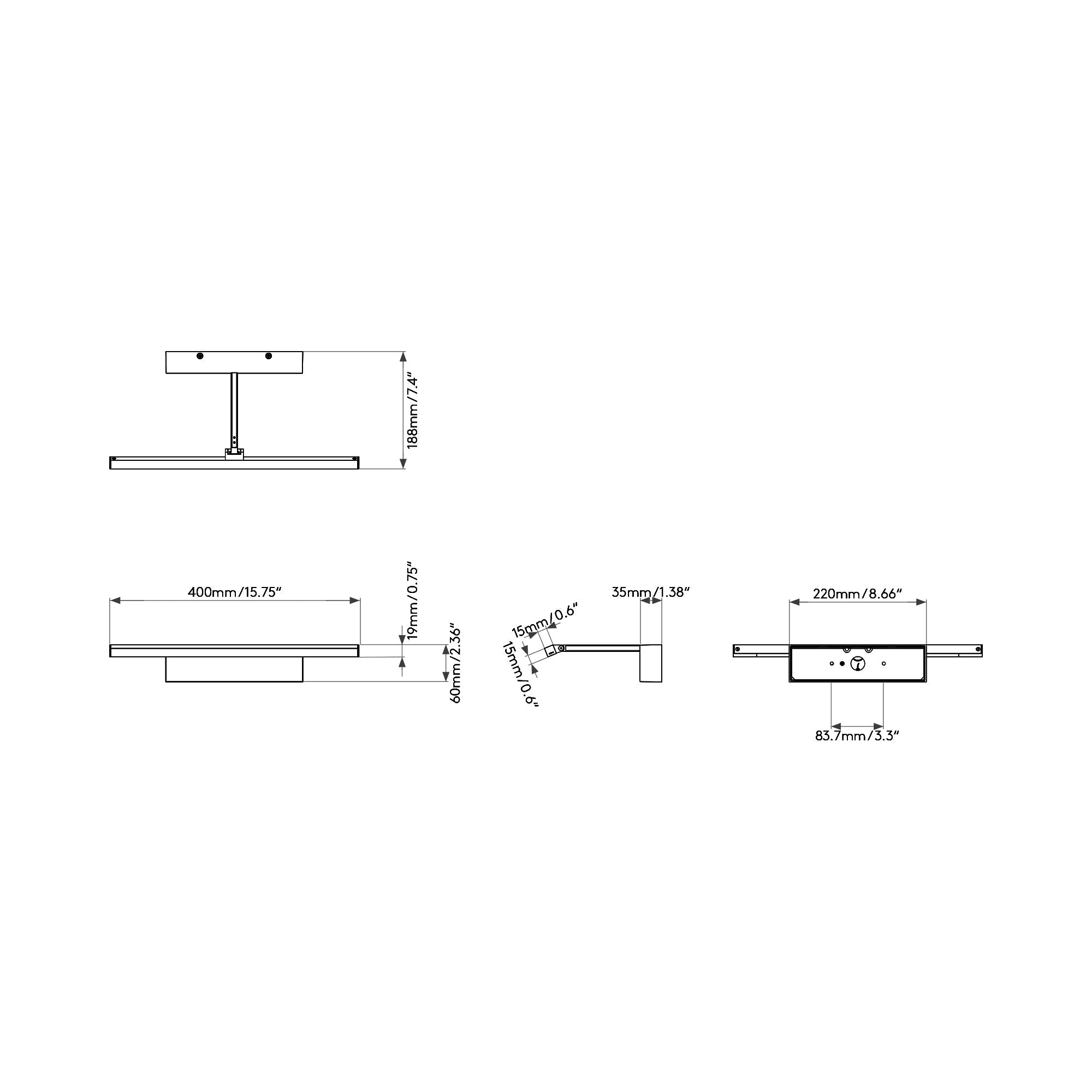 - 15.75-Inch: 15.75"W X 2.36"H; 7.4" Extension