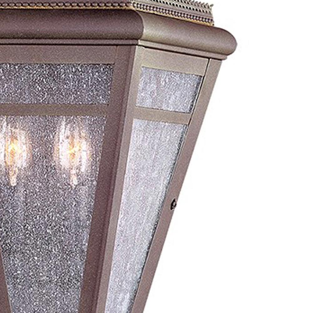 The Morgan Hill Outdoor Wall Lantern from Troy Lighting offers a charming traditional village motif with a tapered lantern frame made of natural rust finish metal and a clear seeded glass shade, with an ornate emblem gracing its top.