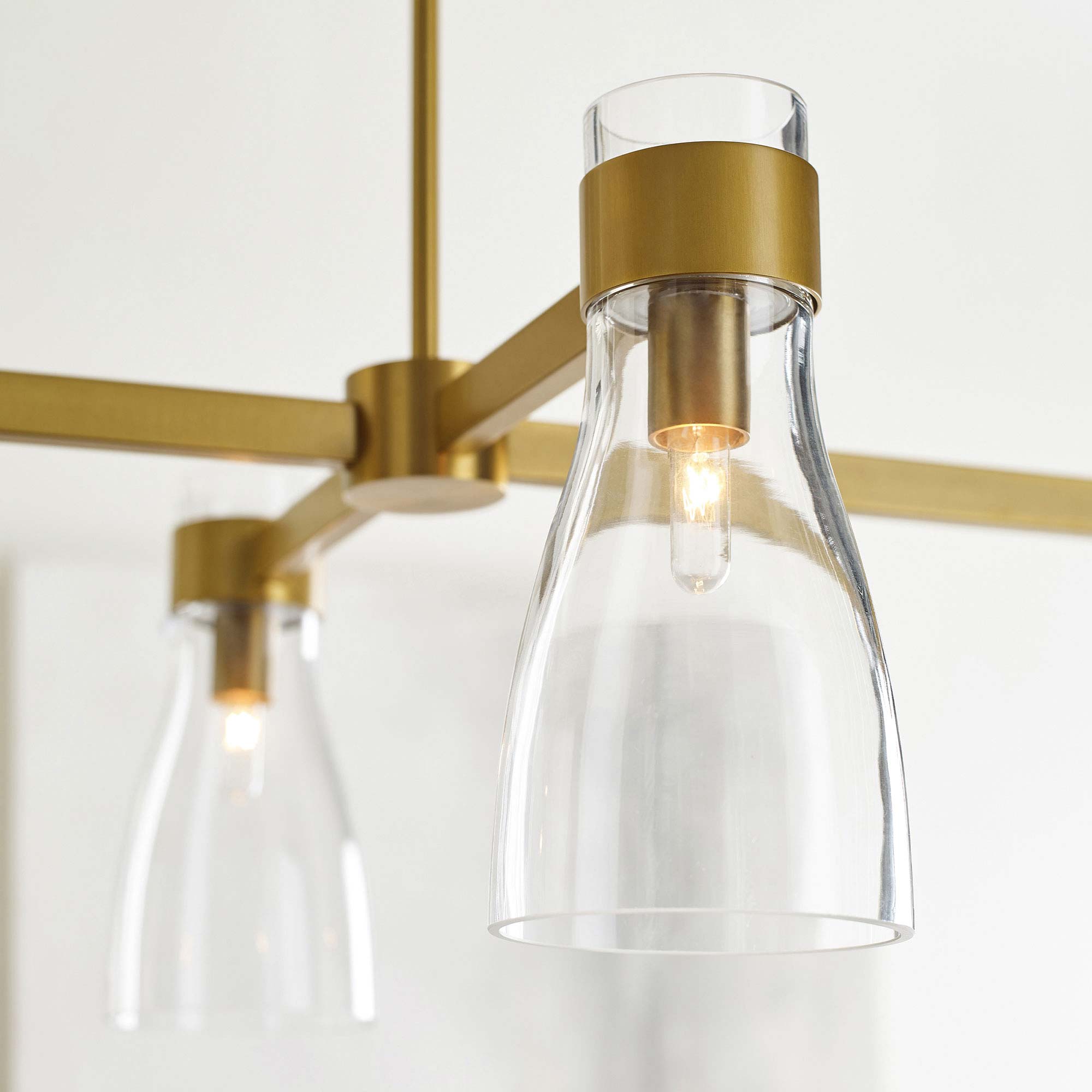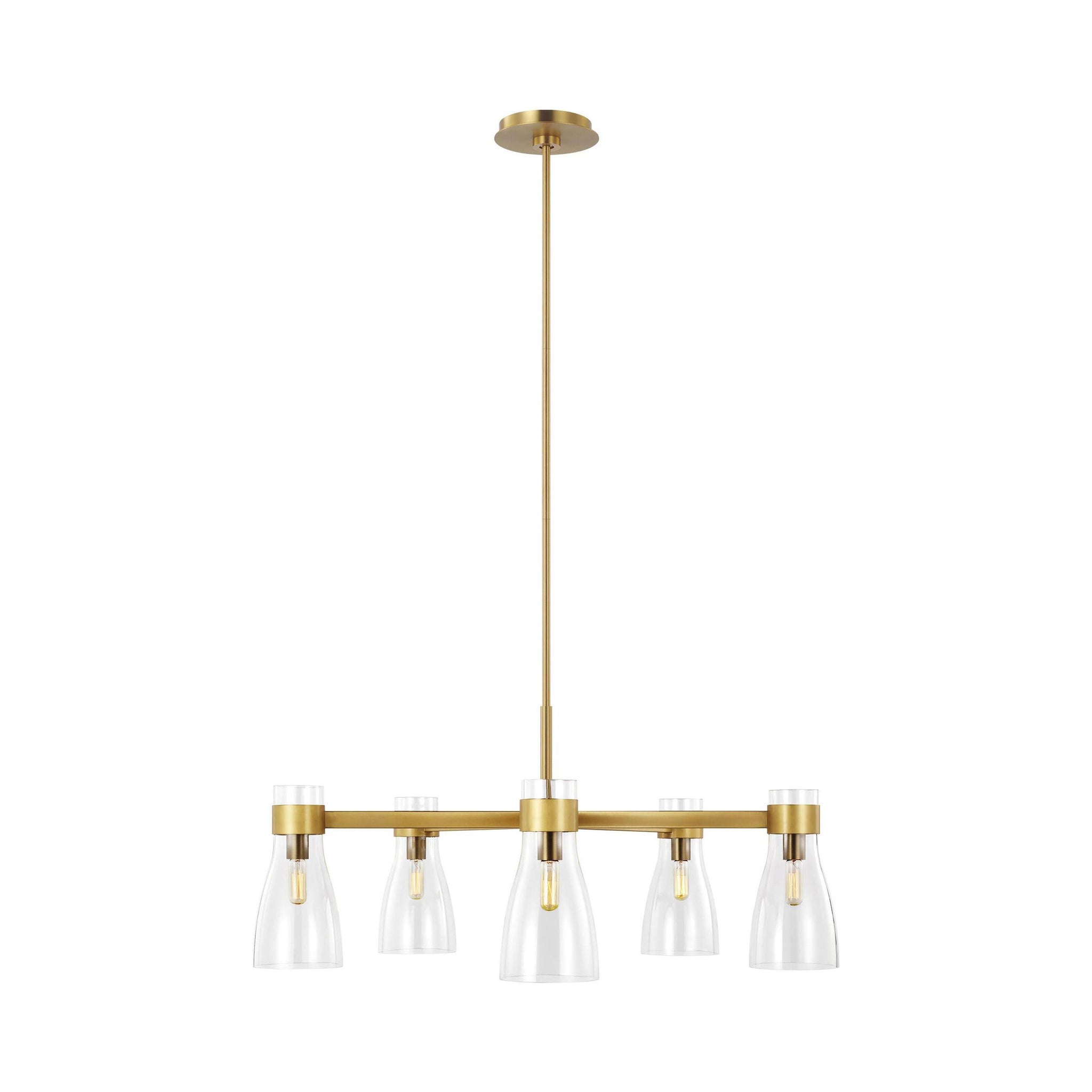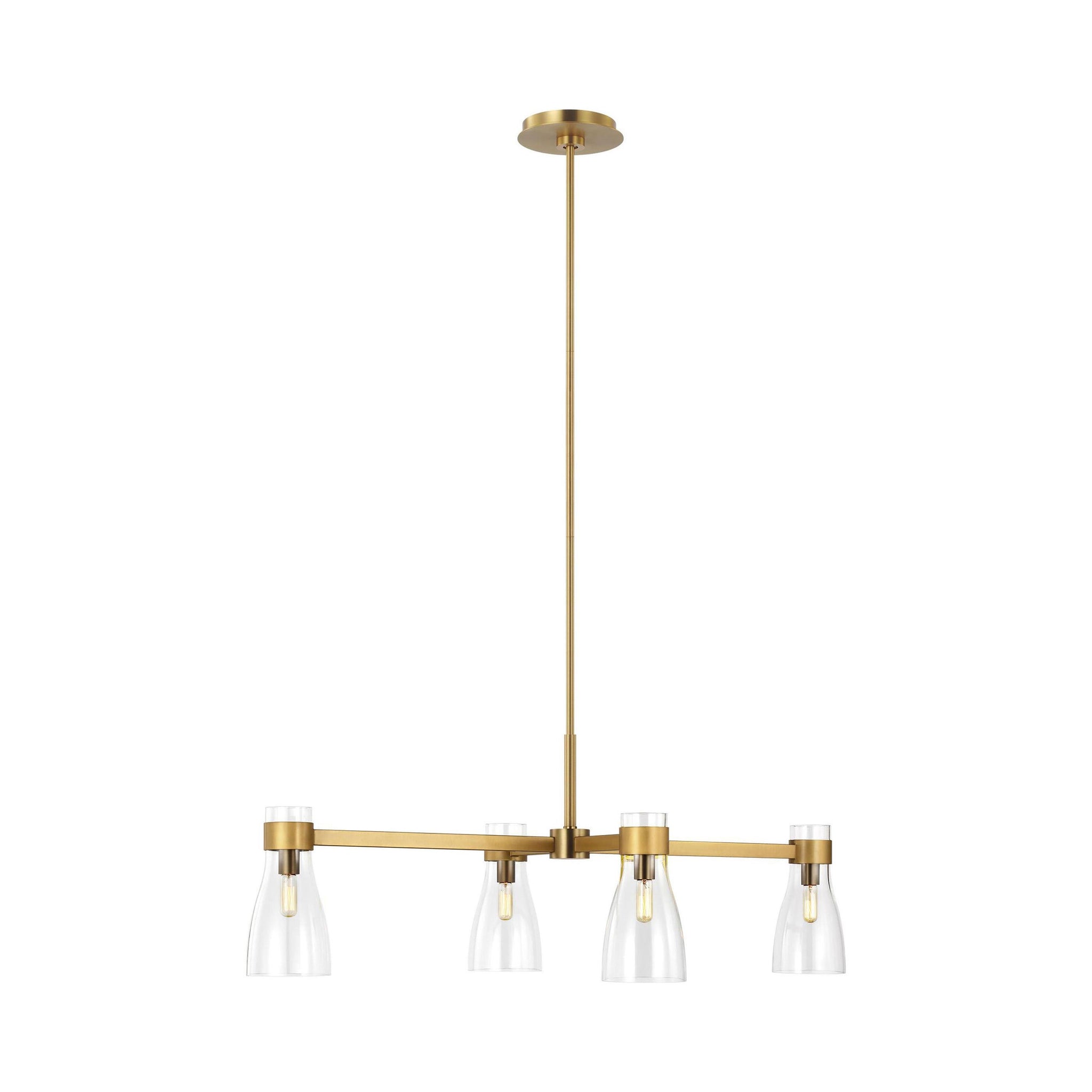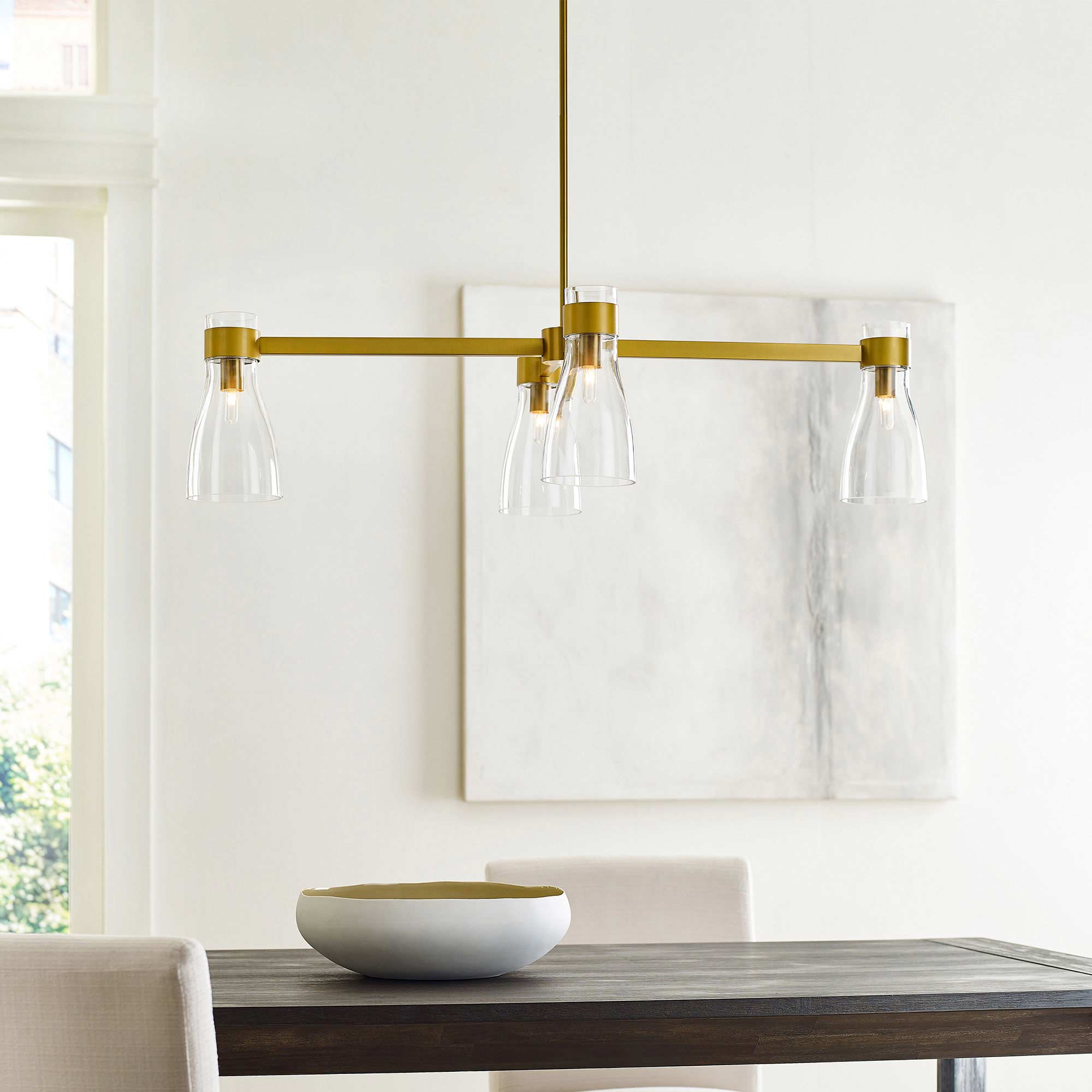 The Moritz four light single tier chandelier in burnished brass is created around a linear frame includes five glass shades originally inspired by the form of classic task lamps, giving it a contemporary twist. A beautiful focal point in living and dining rooms.