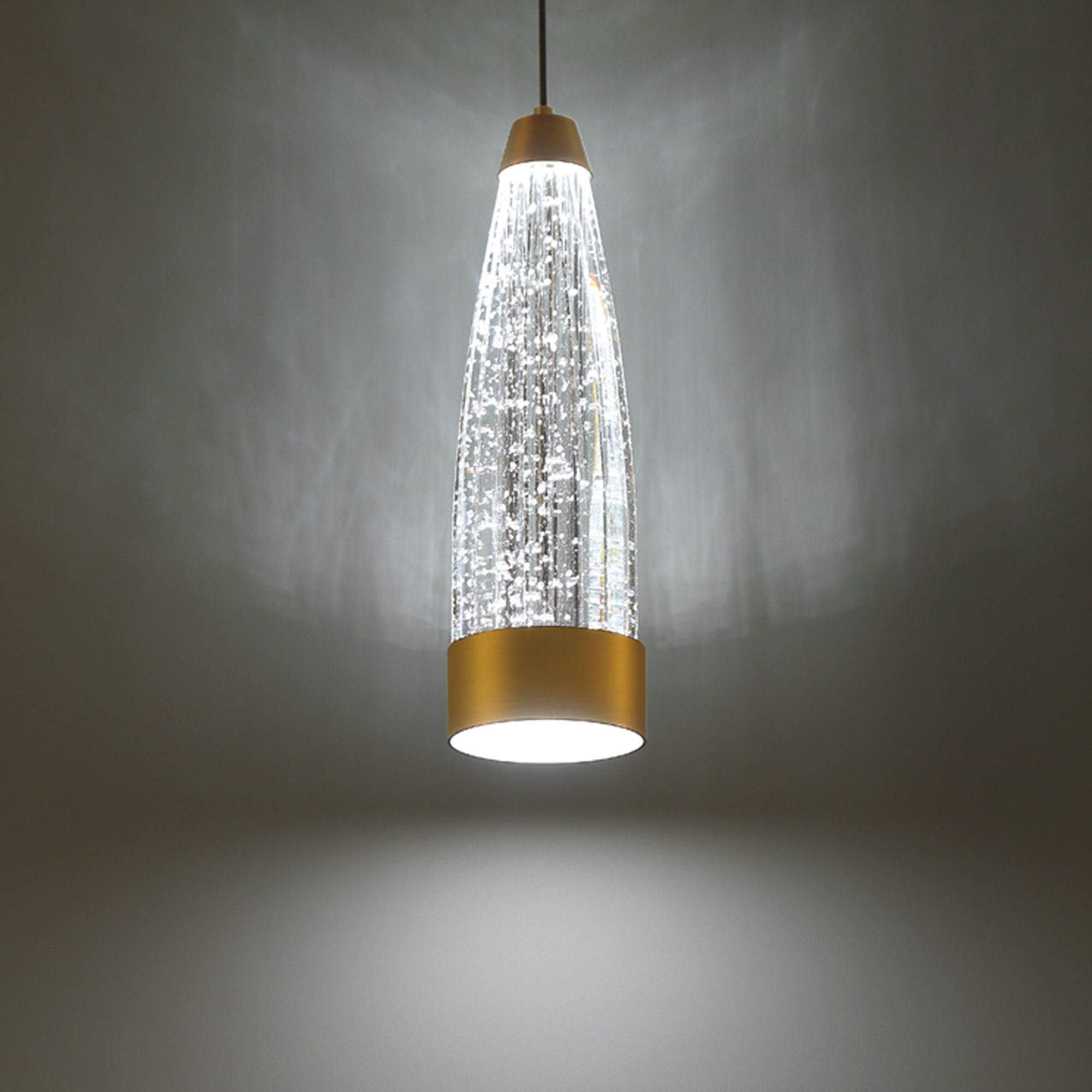 Aged brass finished hardware encases stunning seeded crystal glass that sparkles bright. A fluted grooved diffuser softens powerful LED illumination and fills the room with warm, even illumination. Install Mystic in multiples to make a dramatic design statement.