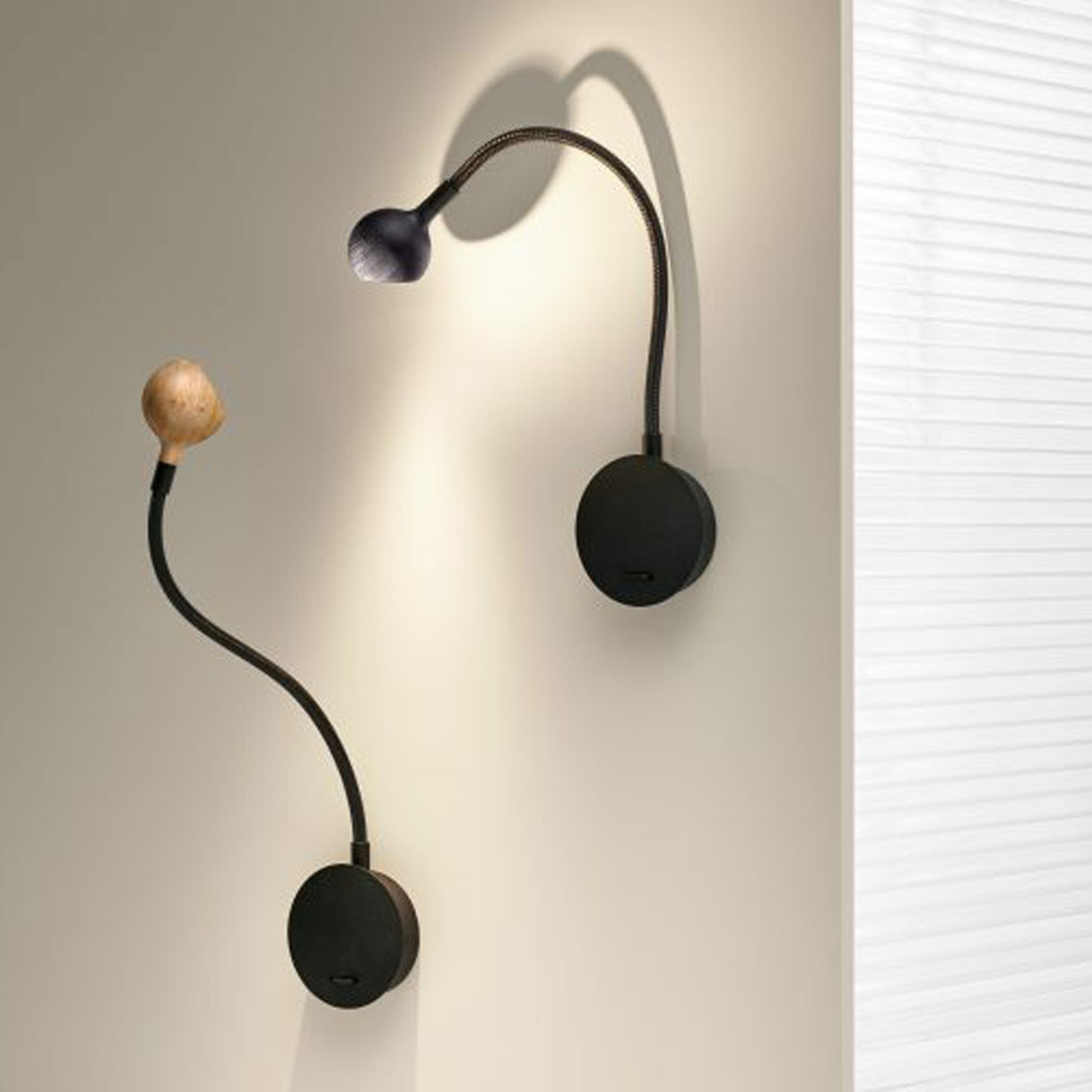 The N. Ocho LED Wall Light from Marset is a must-have fixture for bedrooms doubling as functional and fashionable places to relax and read. A cool asymmetrical silhouette sets it apart, showcasing a round wall mount, flexi-curved braided arm, and earthy round demi-shade made of wood with natural grain markings.