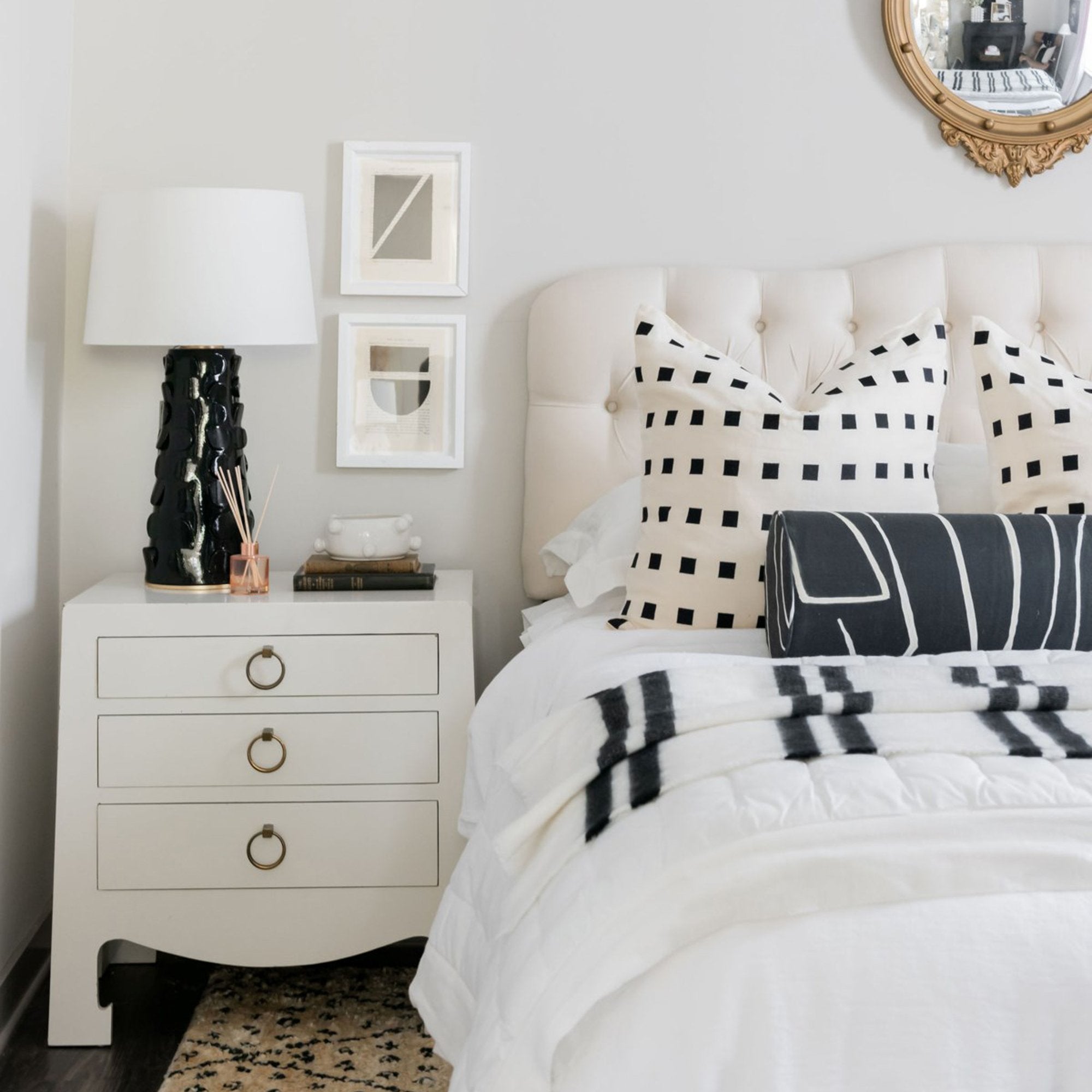 Chunky midcentury modern meets eclectic yet cheeky post-modern design in this Naomi Table Lamp from Mitzi. The textural design lends a retro feel to any room, with the Belgian linen shade and two-tone finish featuring gold leaf accents give it a glam factor that lights up any room.