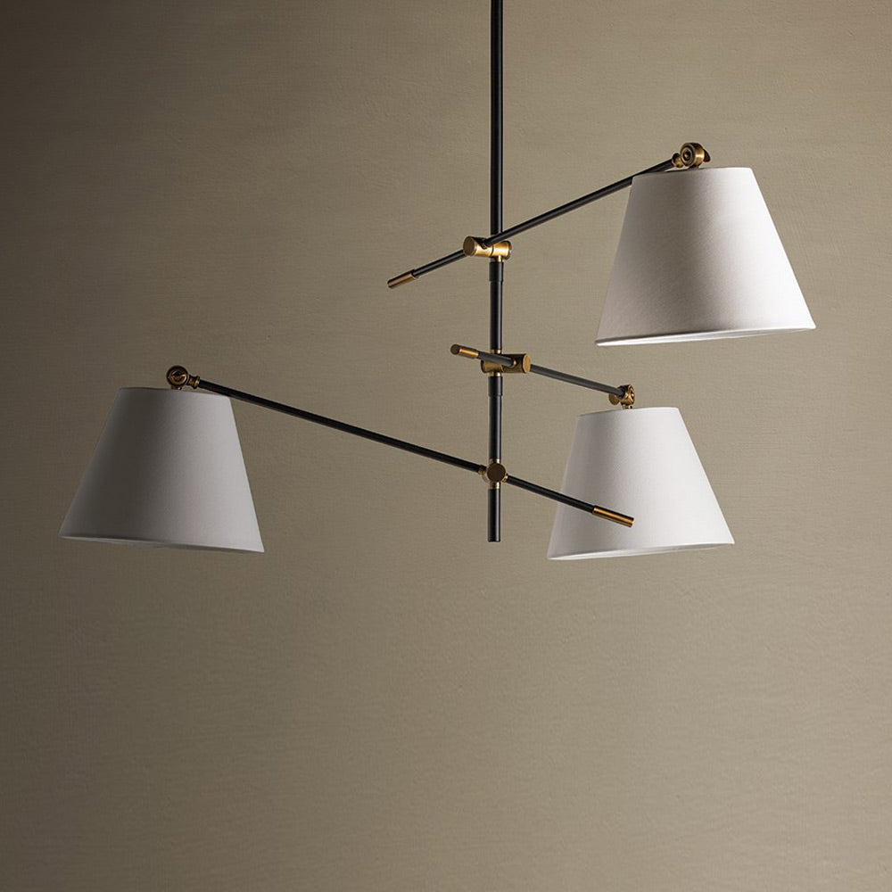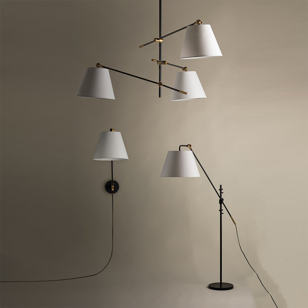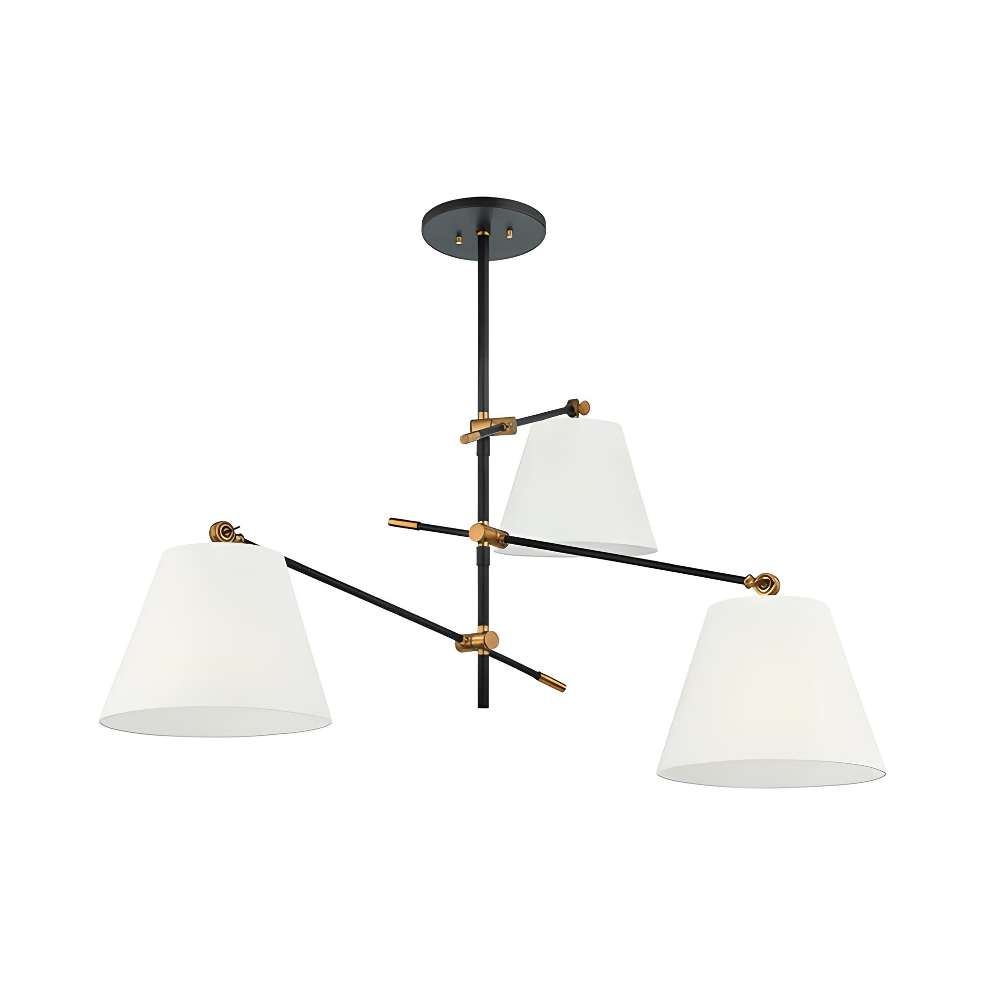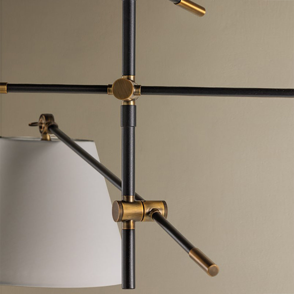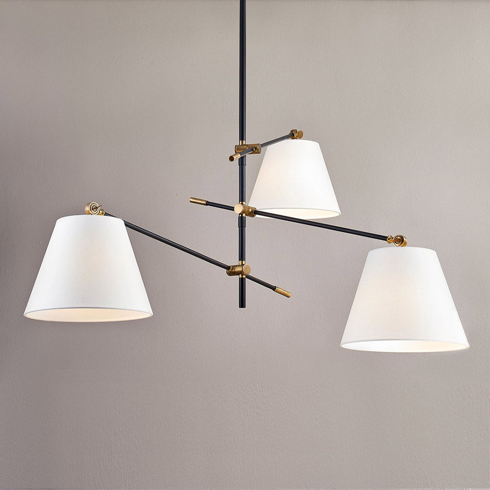 Turn toward an industrial motif with the Navin Chandelier from Troy Lighting and embrace a slightly chaotic silhouette with tons of personality. A fresh, crisp design blends intersecting textured black metal arms with scattered, tapered white linen shades, all embellished with charming patina brass accents. Create a conversation piece as you infuse ambient illumination over a dining ensemble or living room setting.