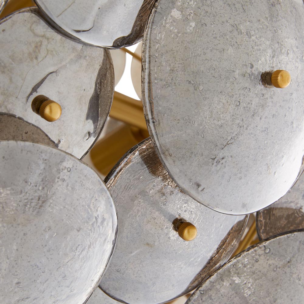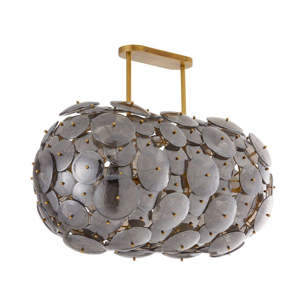 Experiment with industrial influence and art simultaneously with the Nebula Chandelier from Arteriors. Modern with a hint of Deco vibes, this novel fixture features an oval shape made up of slump glass discs with a smoke luster finish, as antique brass framing provides an intriguing contrast. Light escapes between the disc configuration, reflecting beautifully against shining glass.