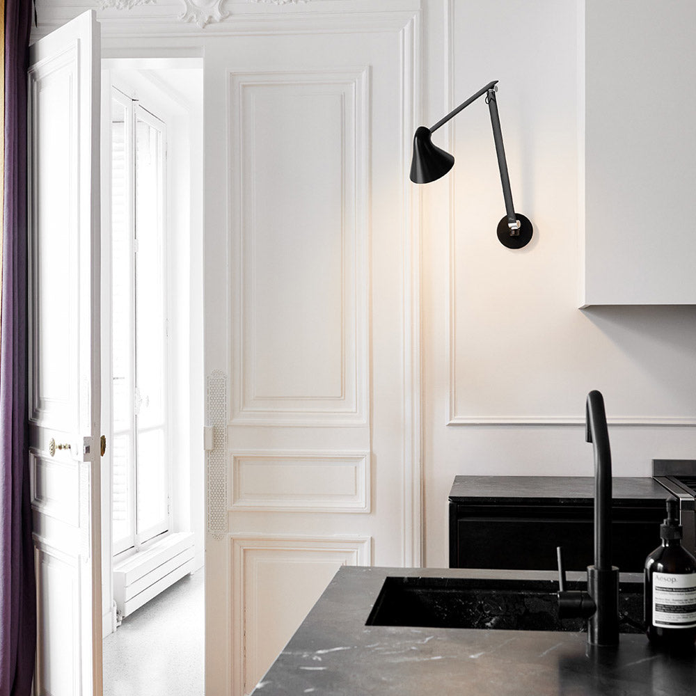 Lighten the look in a bedroom or home office with the NJP Adjustable LED Wall Light from Louis Poulsen. Multiple adjustment points allow for precision illumination, ideal for a desk, workbench or cozy reading nook. A classic shade receives a refreshing update, delivering a compelling silhouette and rich downlighting that's ideal for tasks and ambiance.