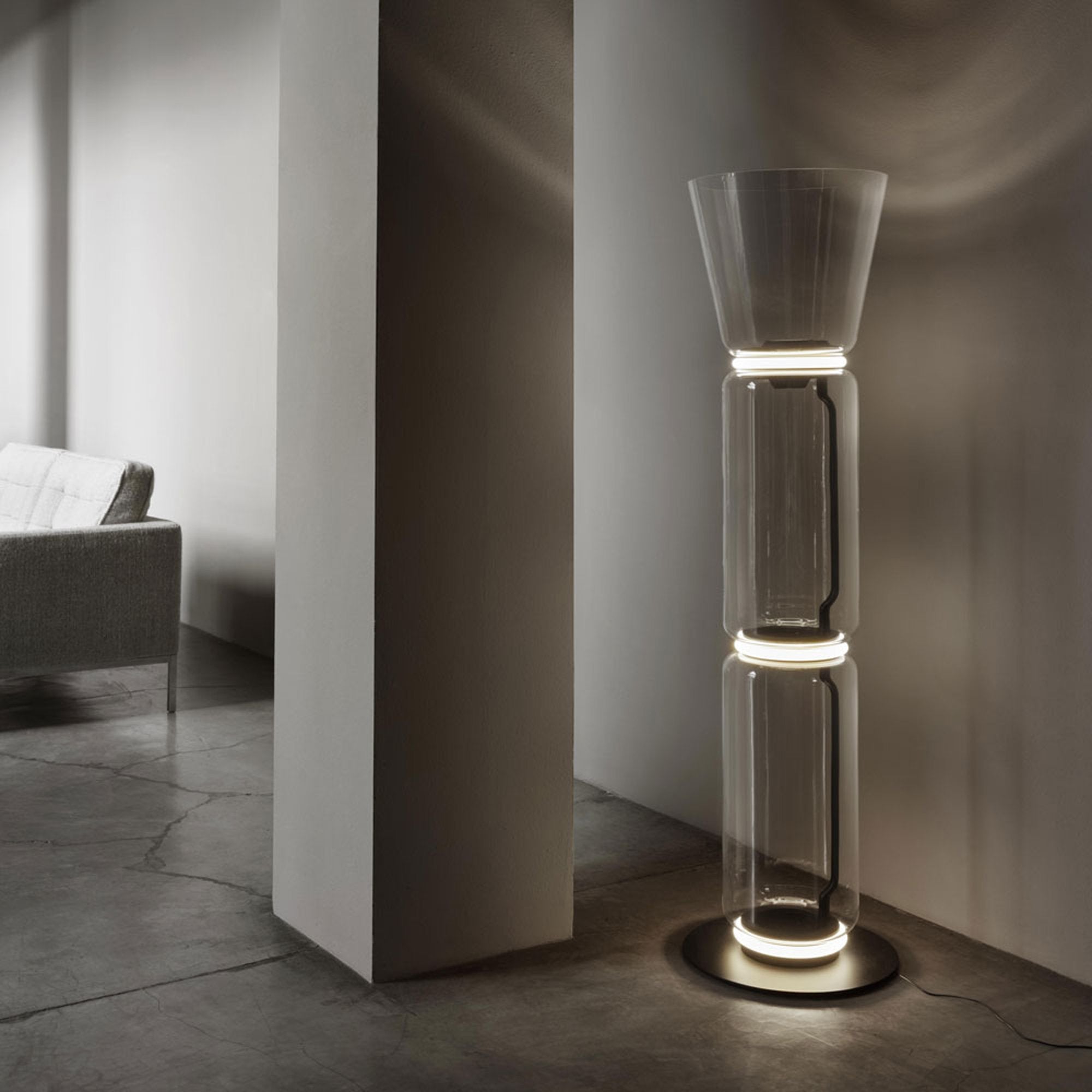 The unique craftsmanship of the Noctambule High Cylinder and Cone LED Floor Lamp from FLOS creates an artful reflection of light.