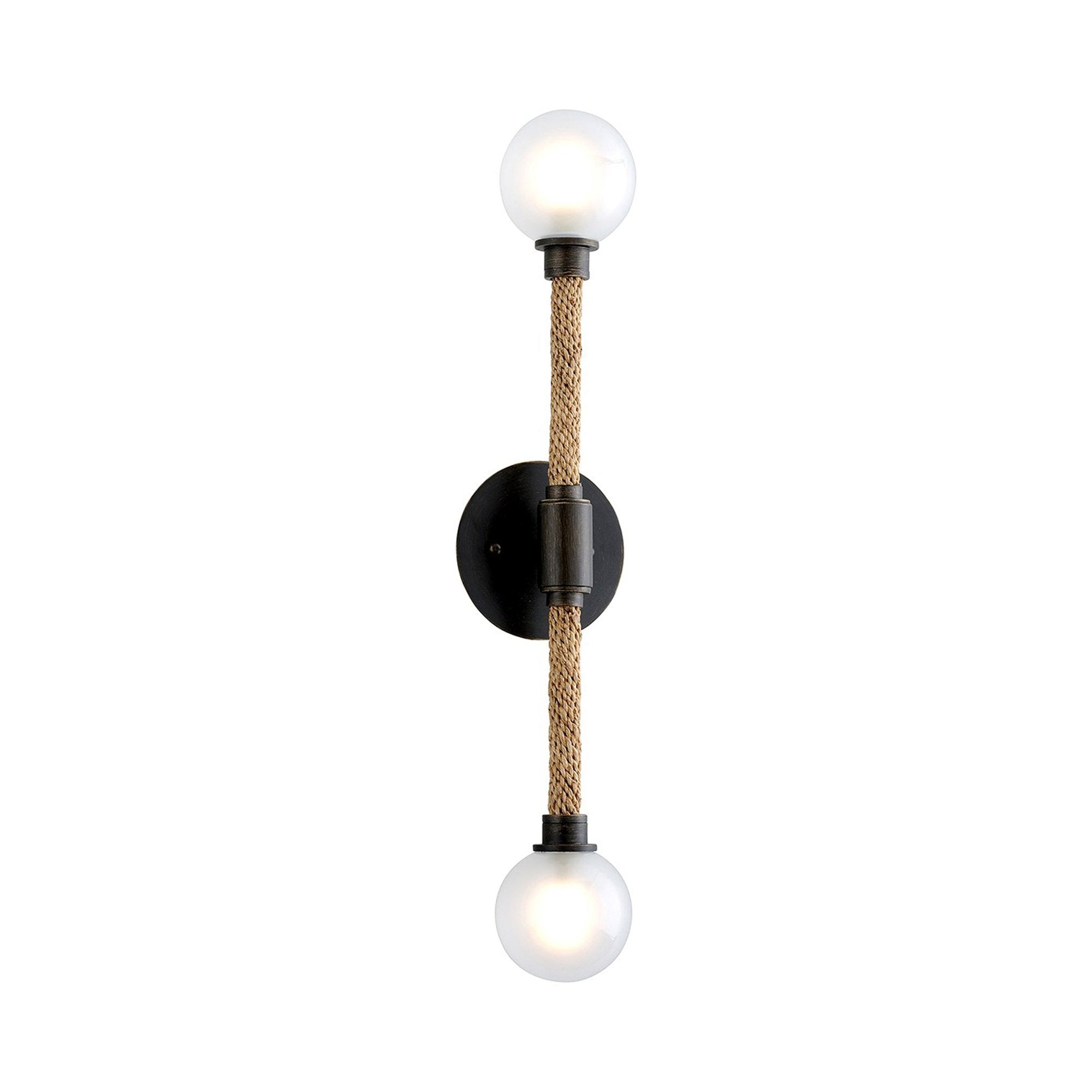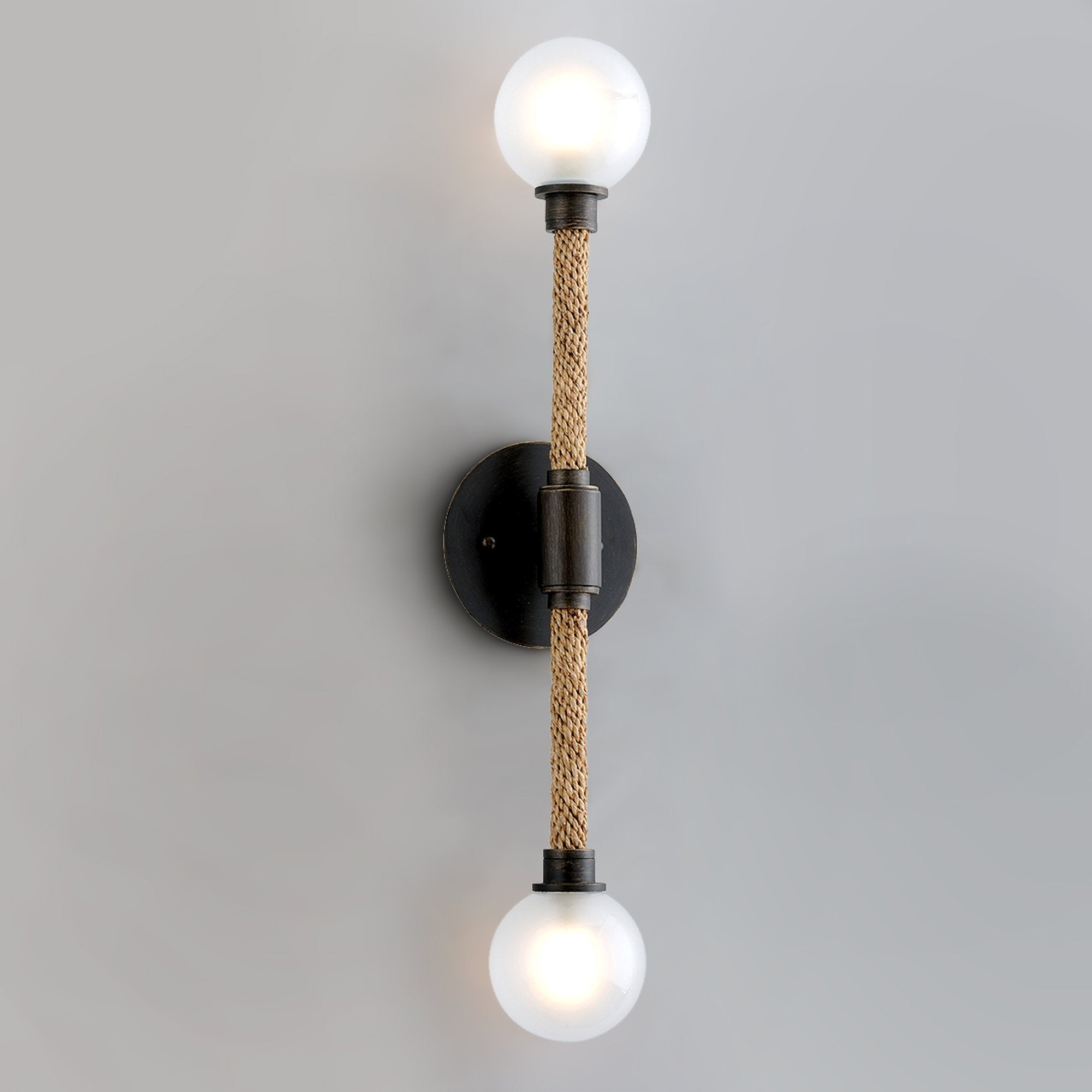 Linear styling creates a crisp silhouette with industrial vibes in the Nomad LED Wall Light, blending a classic bronze finish metal frame and mount with nature-inspired abaca rope wraps and end caps featuring opal white glass globe bulbs.