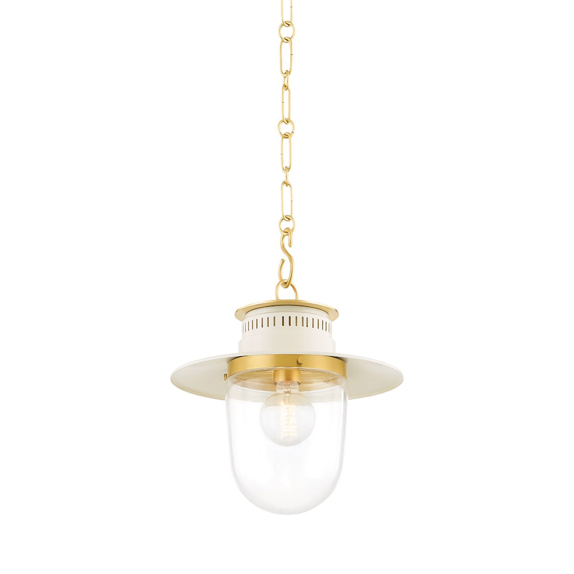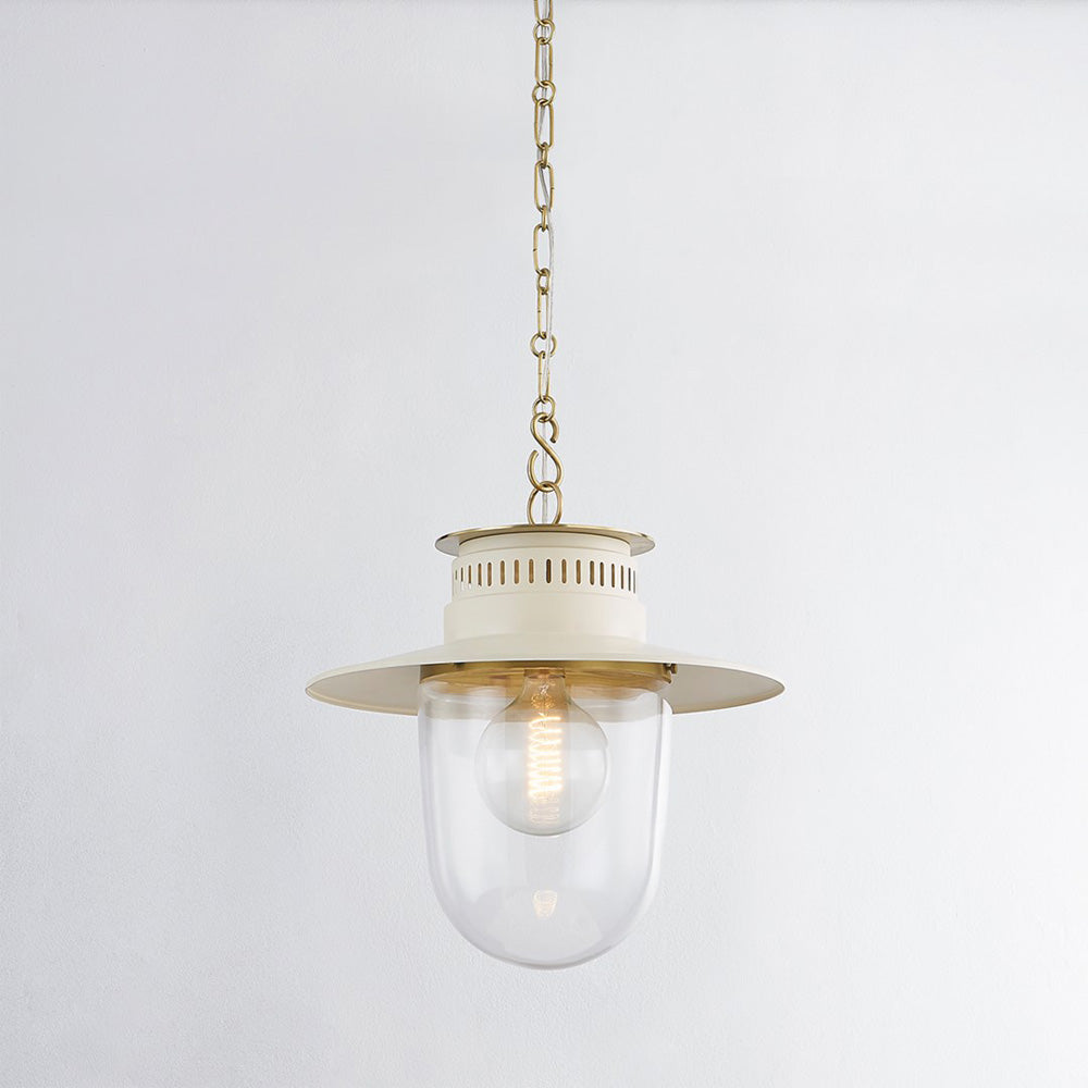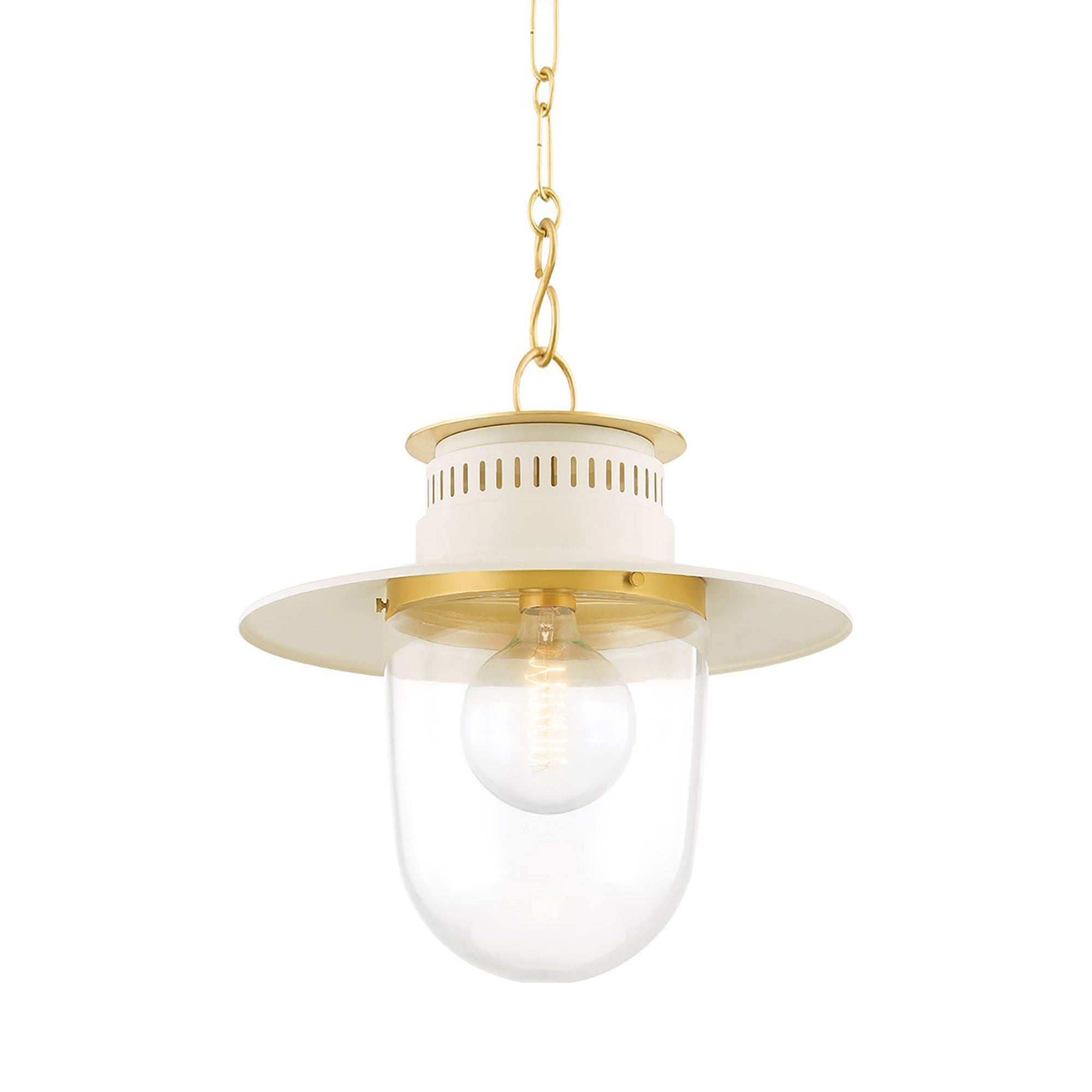 Repurposed industrial attitude creates immediate soft style with a nod to vintage lore as the Nori Pendant Light from Mitzi adds a baseline level of charm to a living area or entryway. Focused on detailing, its wide-brim shade sports a light, creamy finish compatible with a host of room palettes and adds livable radiance. Lovely aged brass creates a link chain to support a lantern-inspired configuration capped by an elongated clear glass dome.