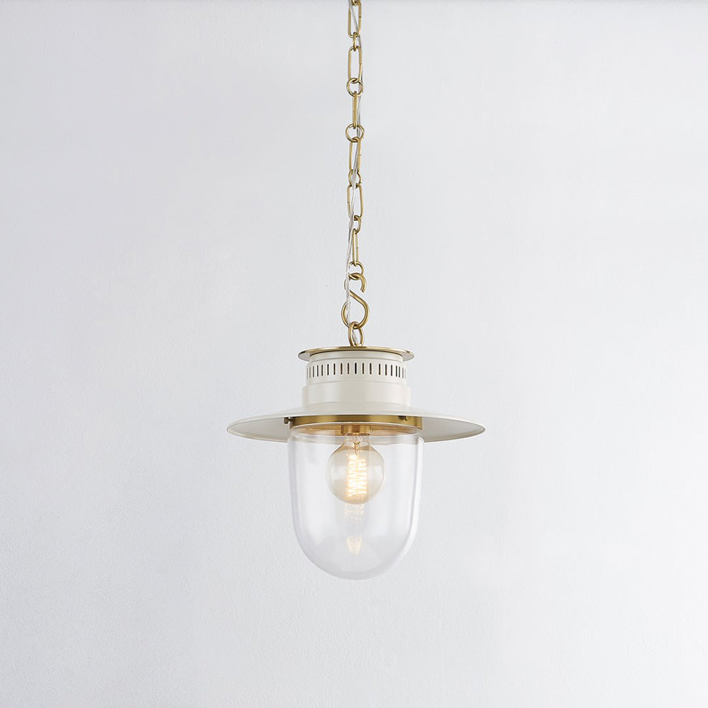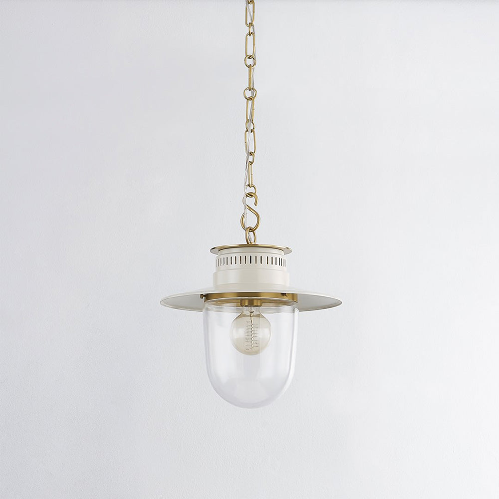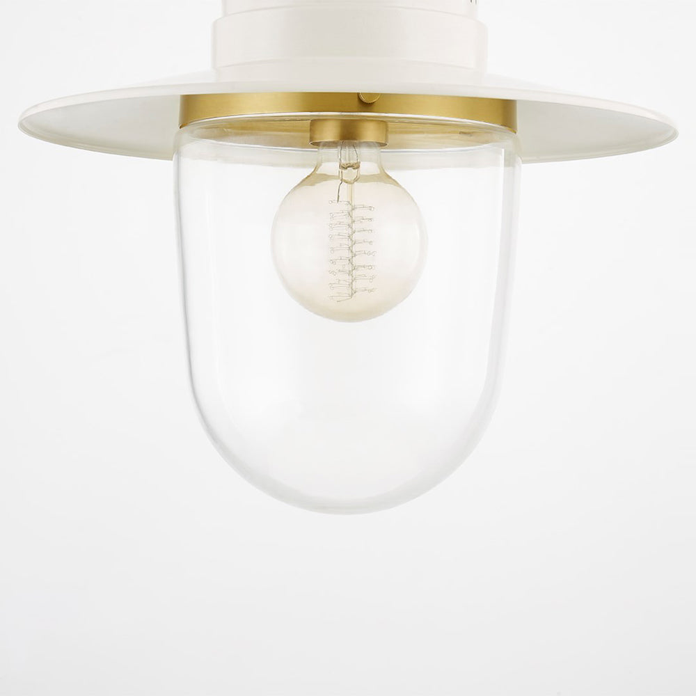 Repurposed industrial attitude creates immediate soft style with a nod to vintage lore as the Nori Pendant Light from Mitzi adds a baseline level of charm to a living area or entryway. Focused on detailing, its wide-brim shade sports a light, creamy finish compatible with a host of room palettes and adds livable radiance. Lovely aged brass creates a link chain to support a lantern-inspired configuration capped by an elongated clear glass dome.