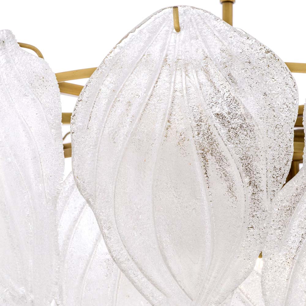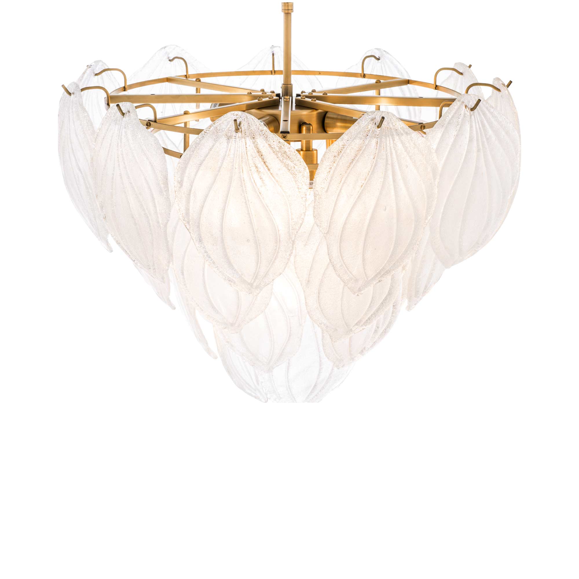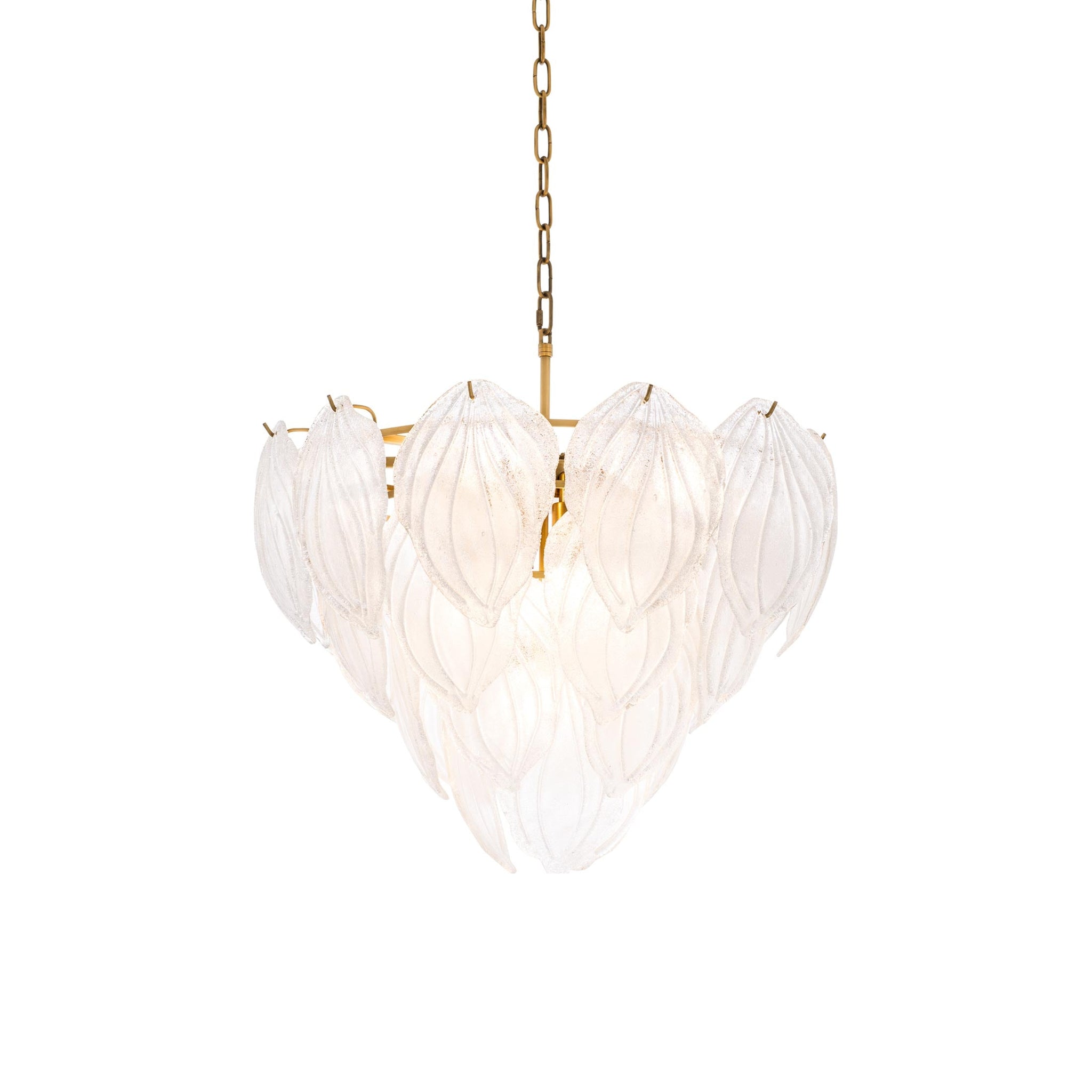Inspired by beauty found only in nature, the Novida Chandelier from EICHHOLTZ Lighting express an organic silhouette brought to light by a cluster of hand blown leaves. This elegant round chandelier bursts with sophisticated details once illuminated, showcasing intricate leaf veining and golden hued hardware for an elevated luxe look.