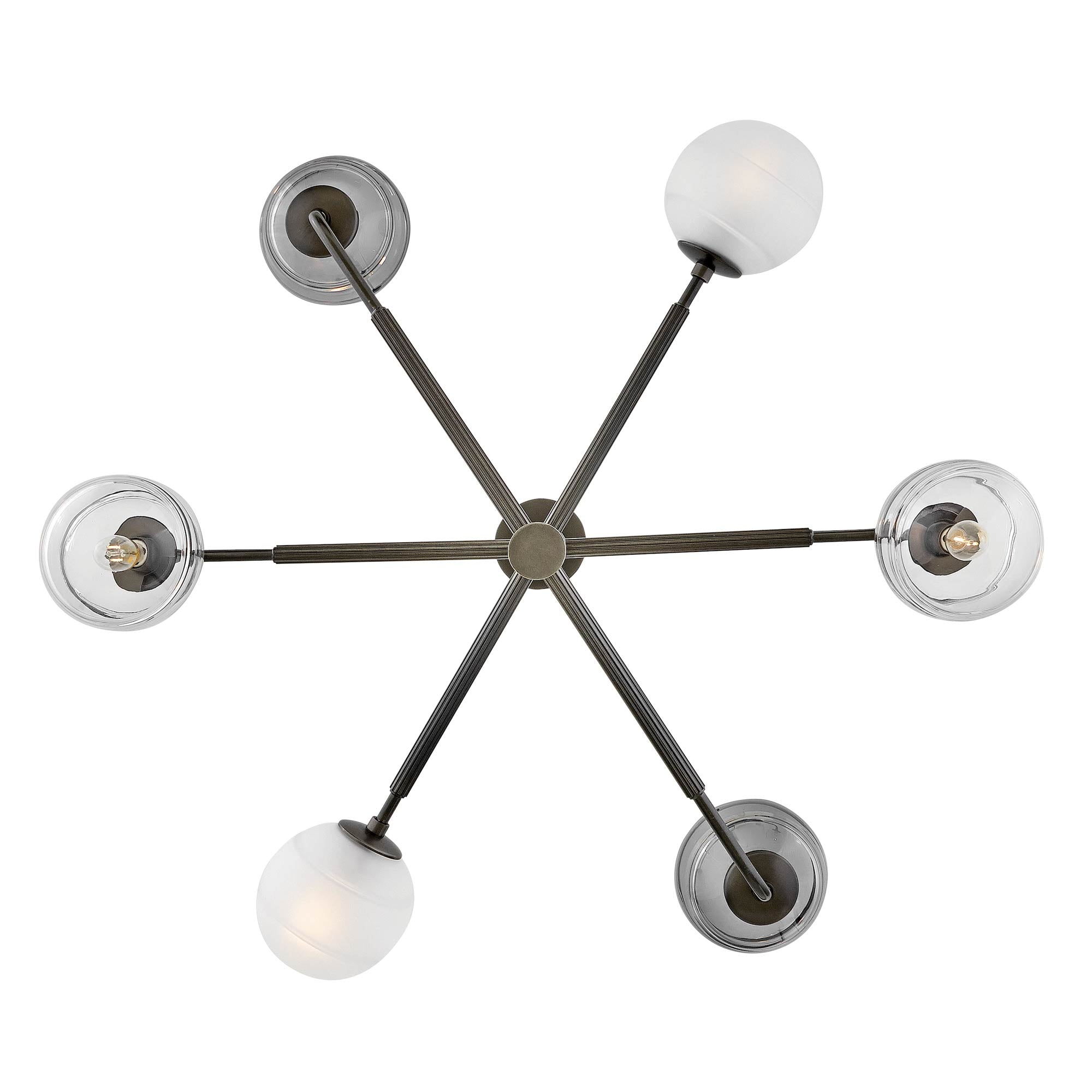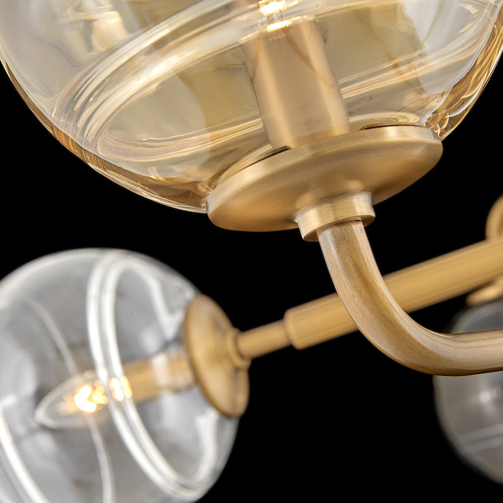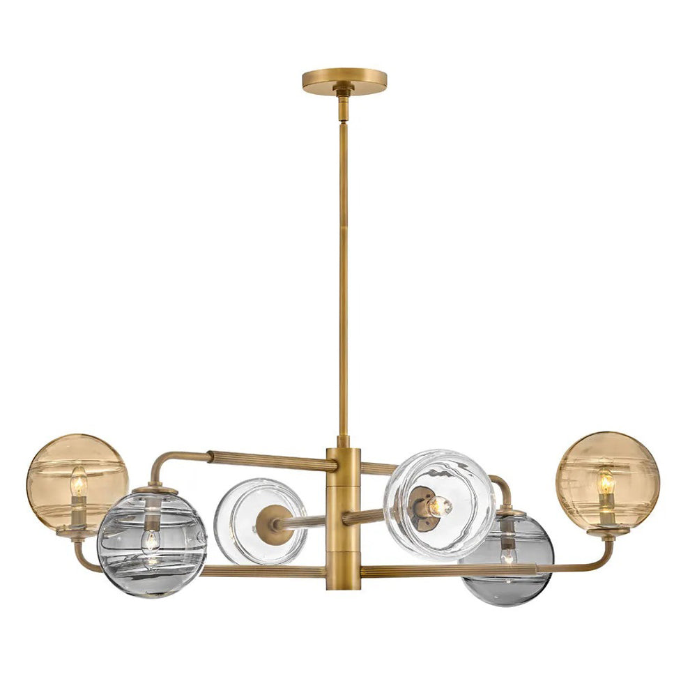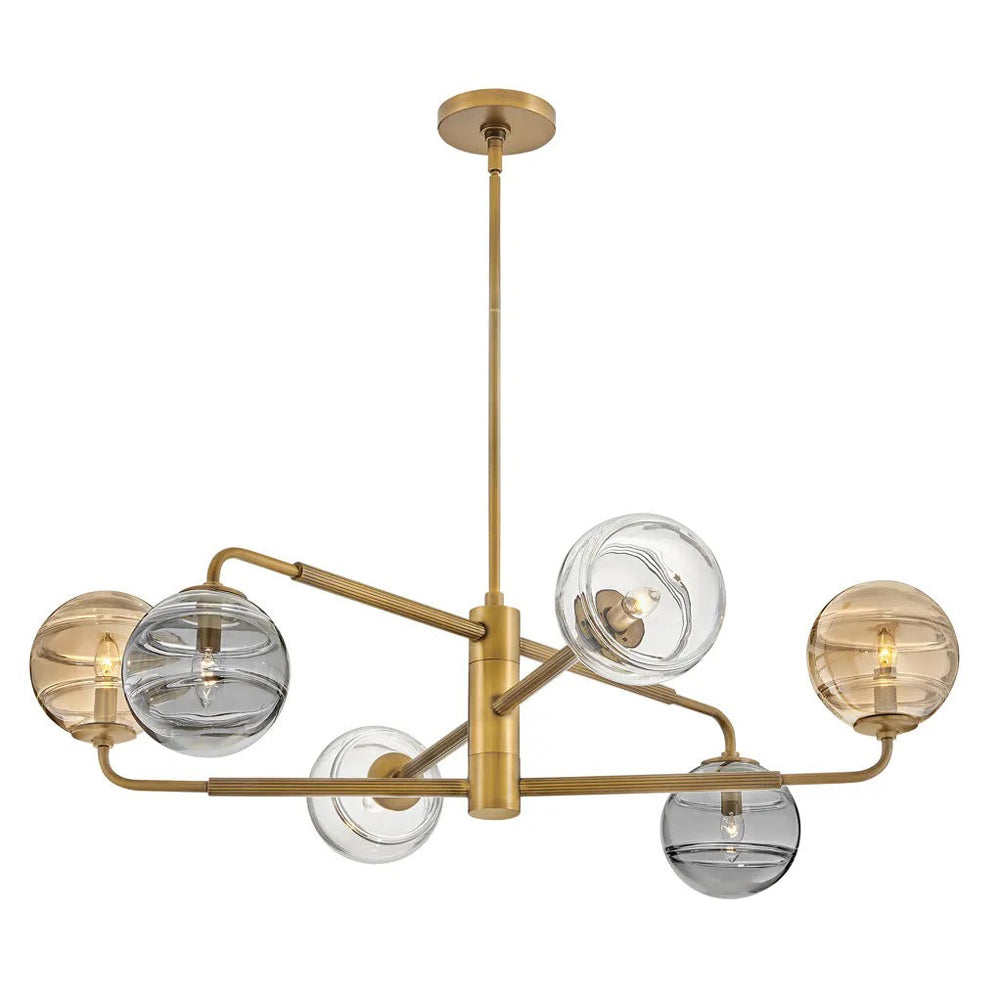 An updated play on a classically inspired silhouette, the Oberon Chandelier from Fredrick Ramond is a dynamic, engaging addition to any room. Imparting rugged sophistication that teeters toward industrial, the chandelier pairs articulating arms with a heritage brass finish and swirled glass globe shades in a trio of colors that create superb depth and dimension.