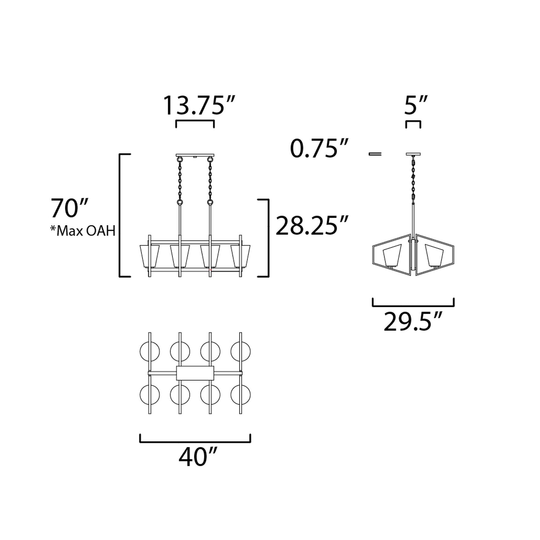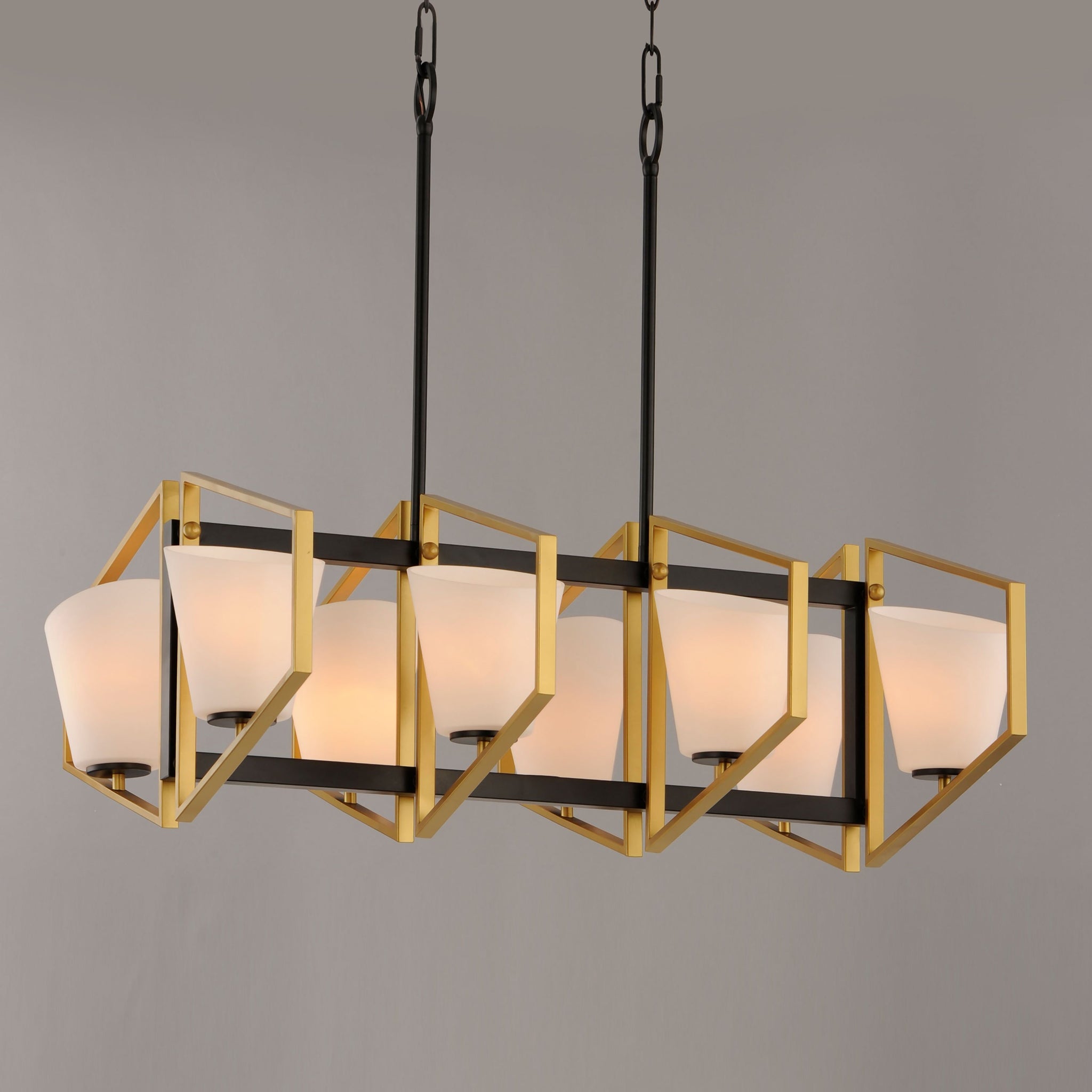 The Oblique Linear Suspension Light from Maxim Lighting features angular edges and a tendrillar frame that lend a stunning sculptural look floating above a dining table.