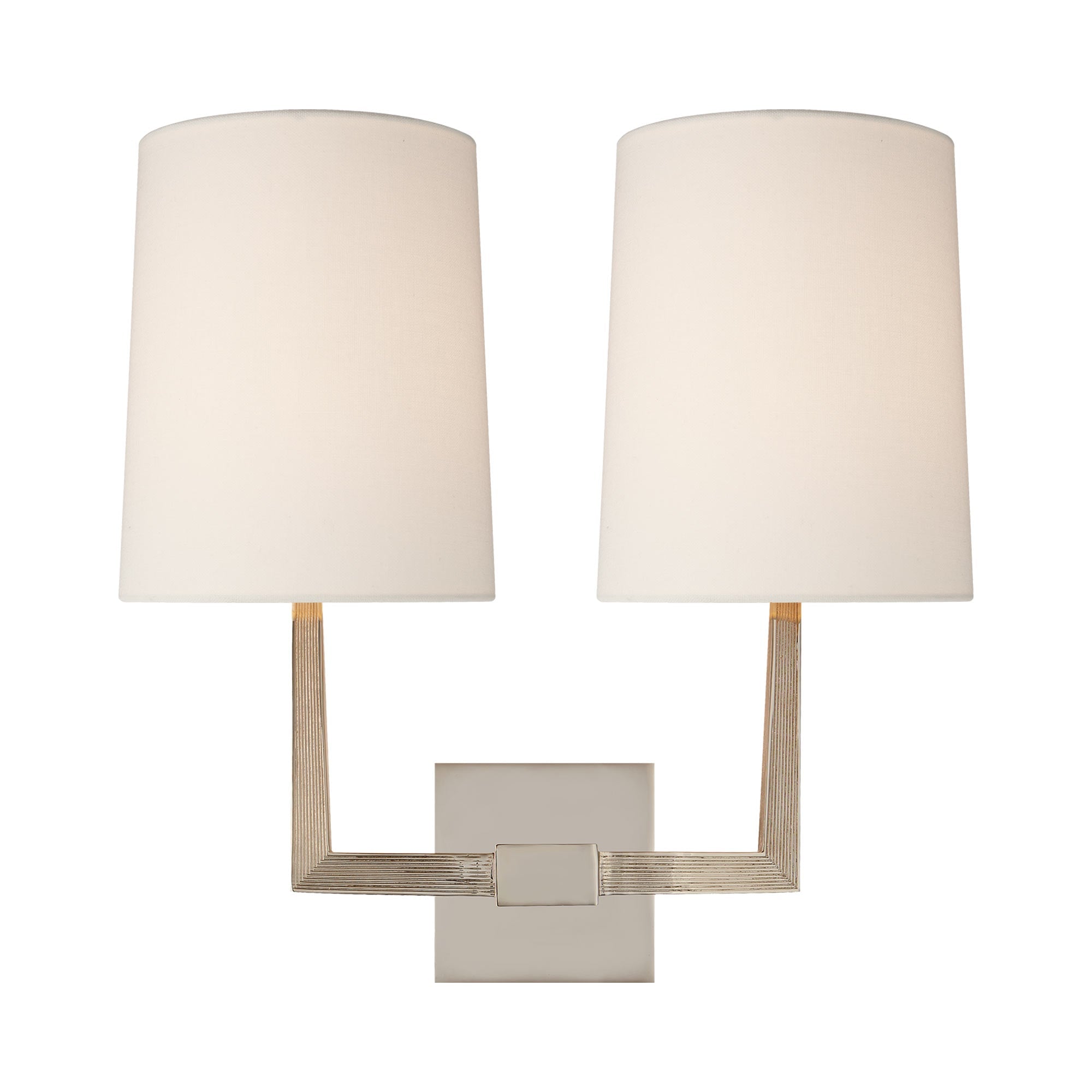 A dynamic geometric design with crisp linear elements calls out the sophisticated design of a classic. Dual shades top lights on the Ojai Double Wall Light from Visual Comfort Signature, adding a storied conventional feel to sleek modern metal framing.