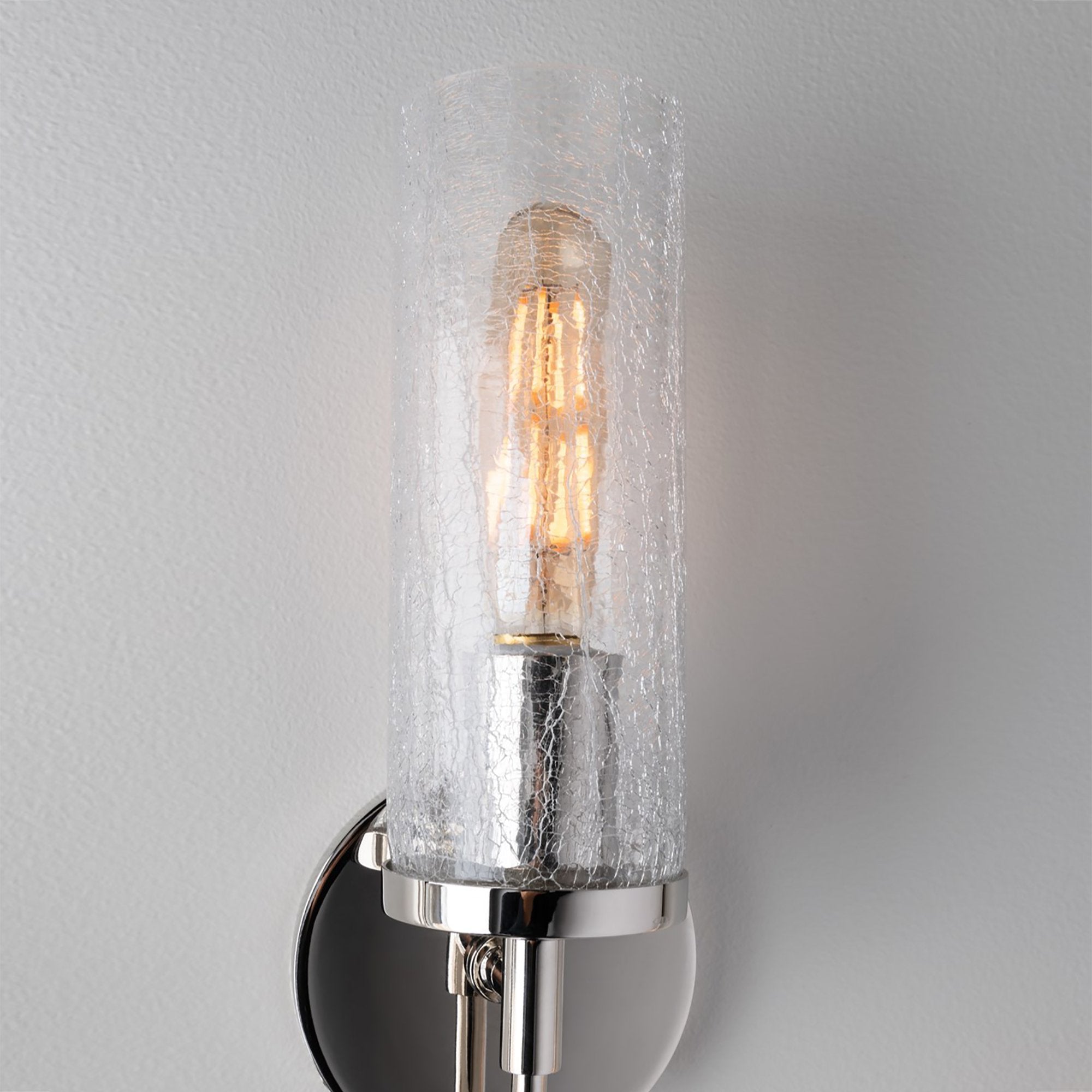 Give your home lighting an elegant yet edgy feel with this Olivia Wall Light from Mitzi. The long metal arm design conveys a torch-like feel, while the crackle clear glass shade casts a bright candle-like glow that gives any space a vibrant ambiance.
