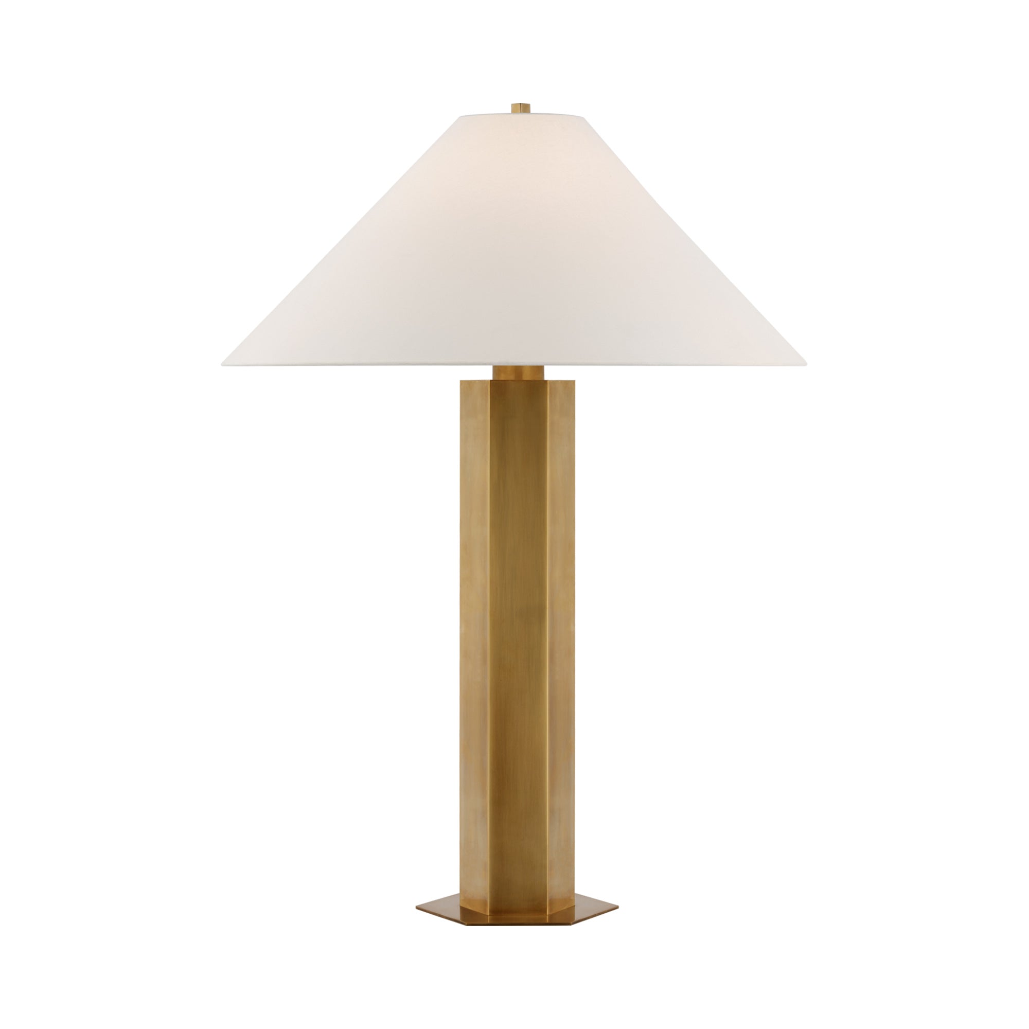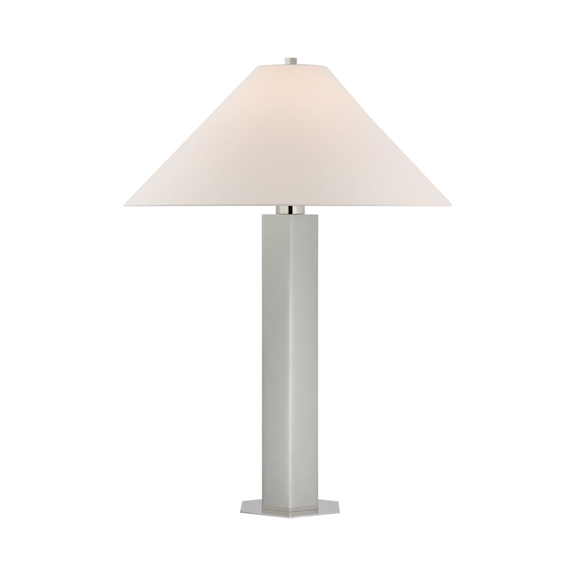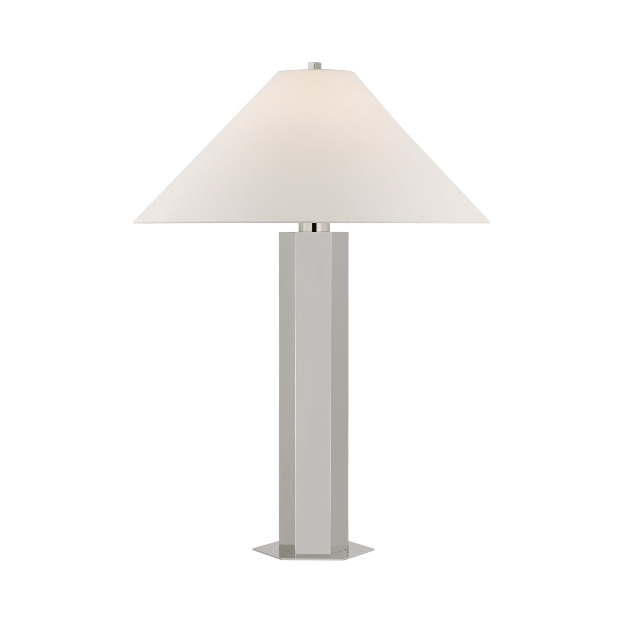 Faceting captures a bold elemental look of implied texture with metal construction maintaining an iconic vibe. The Olivier Table Lamp from Visual Comfort Signature offers intriguing embellishment for a contemporary setting, making the most of a geometric impact. An Asian-inspired linen shade follows its defined design aesthetic.