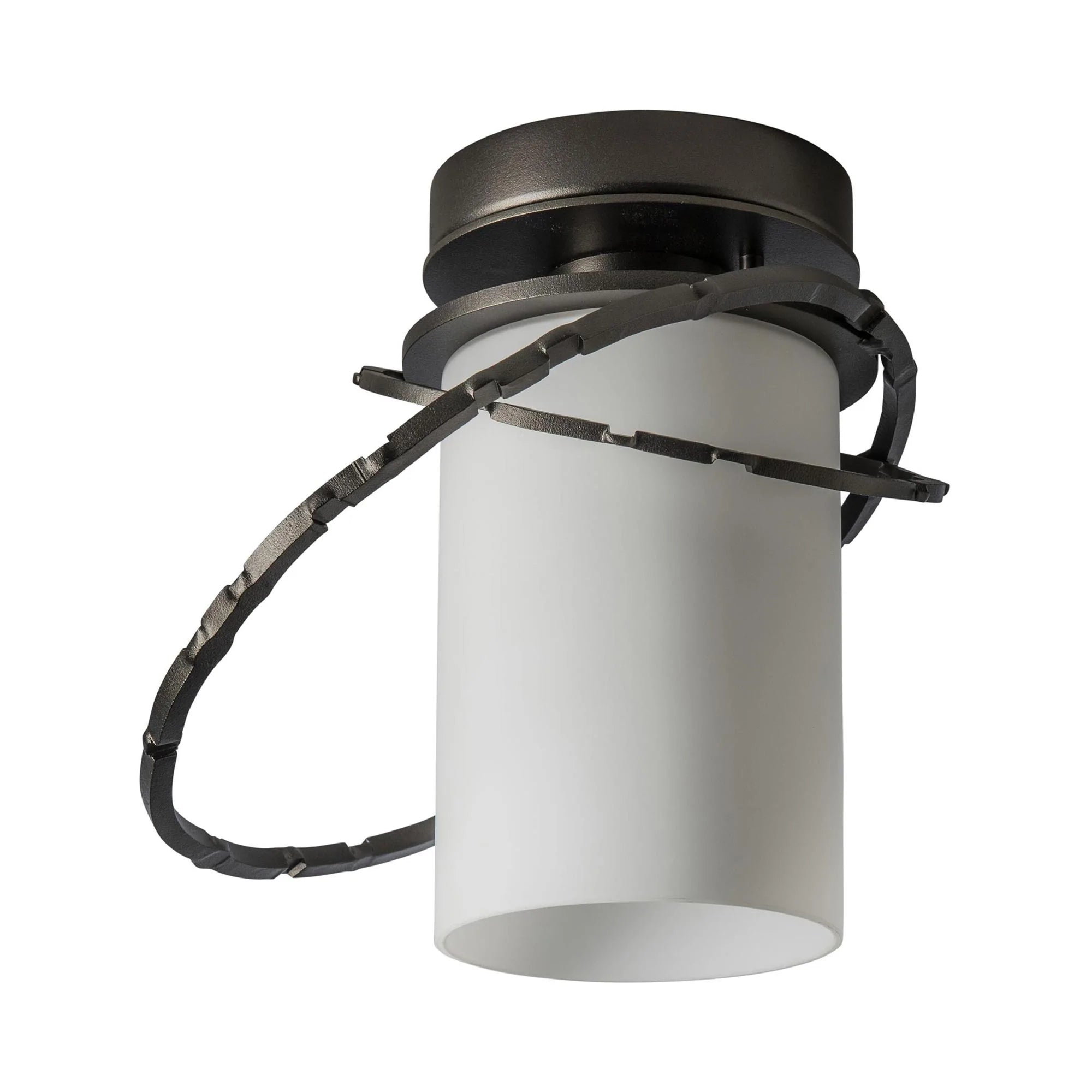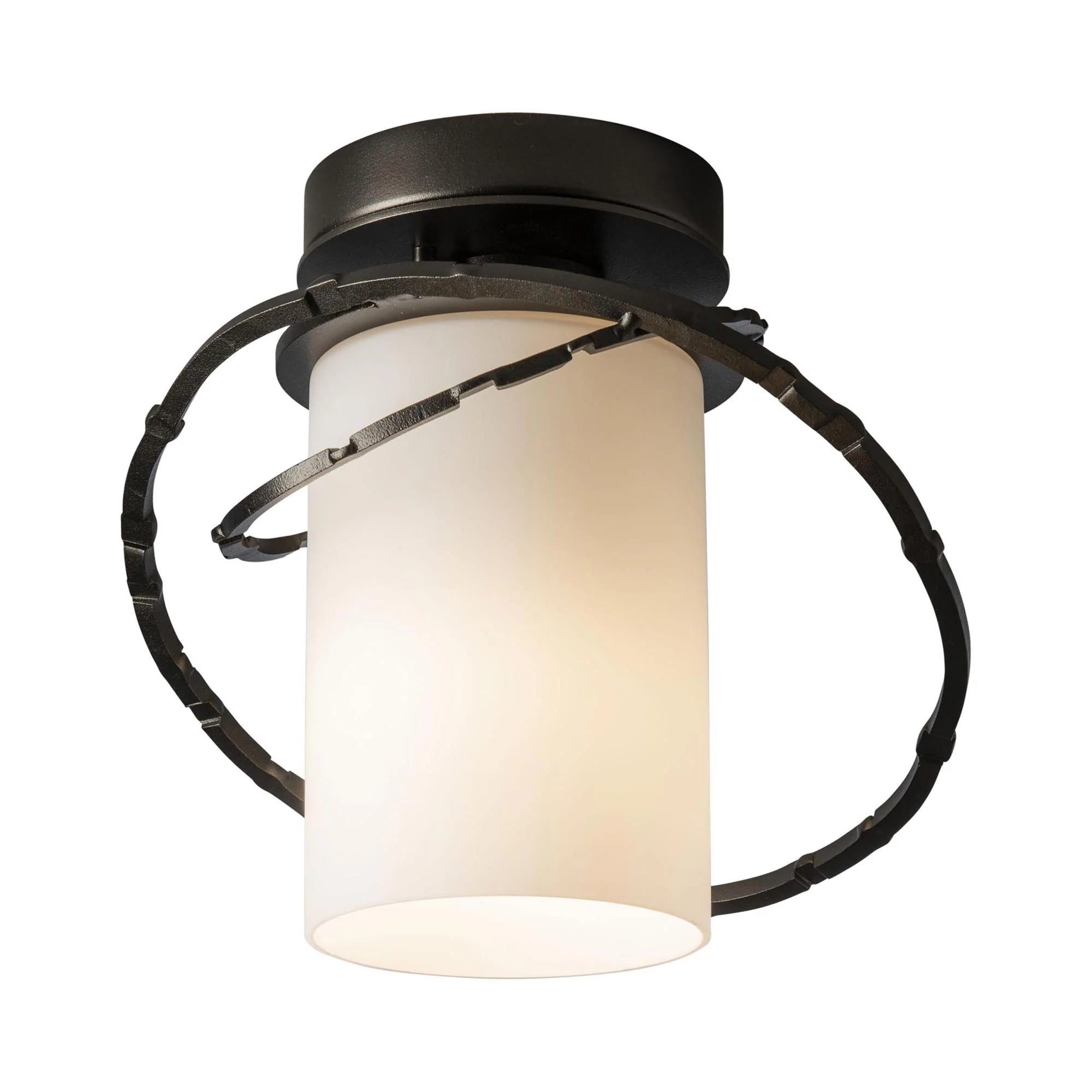 Dressed up with festive accents, the Olympus Outdoor Semi-Flush Mount Ceiling Light from Hubbardton Forge adds a dose of personality to exterior lighting in a patio or gazebo space. This fixture mixes modern with industrial in a design created by skilled artisans intent on bringing attitude to illumination. Metal framing and looped metal accent details lighten the mood, as a simple cylinder glass shade maintains levity.
