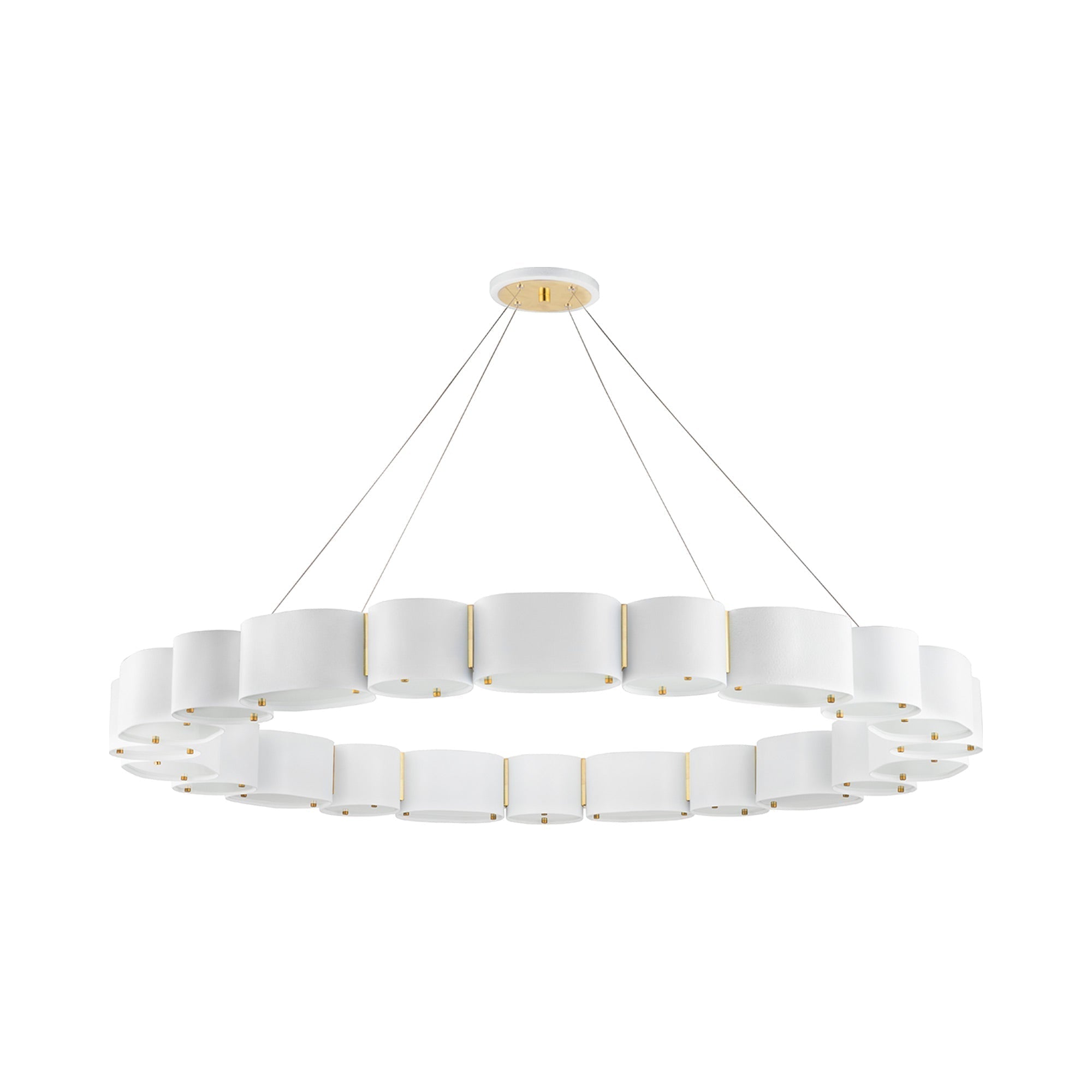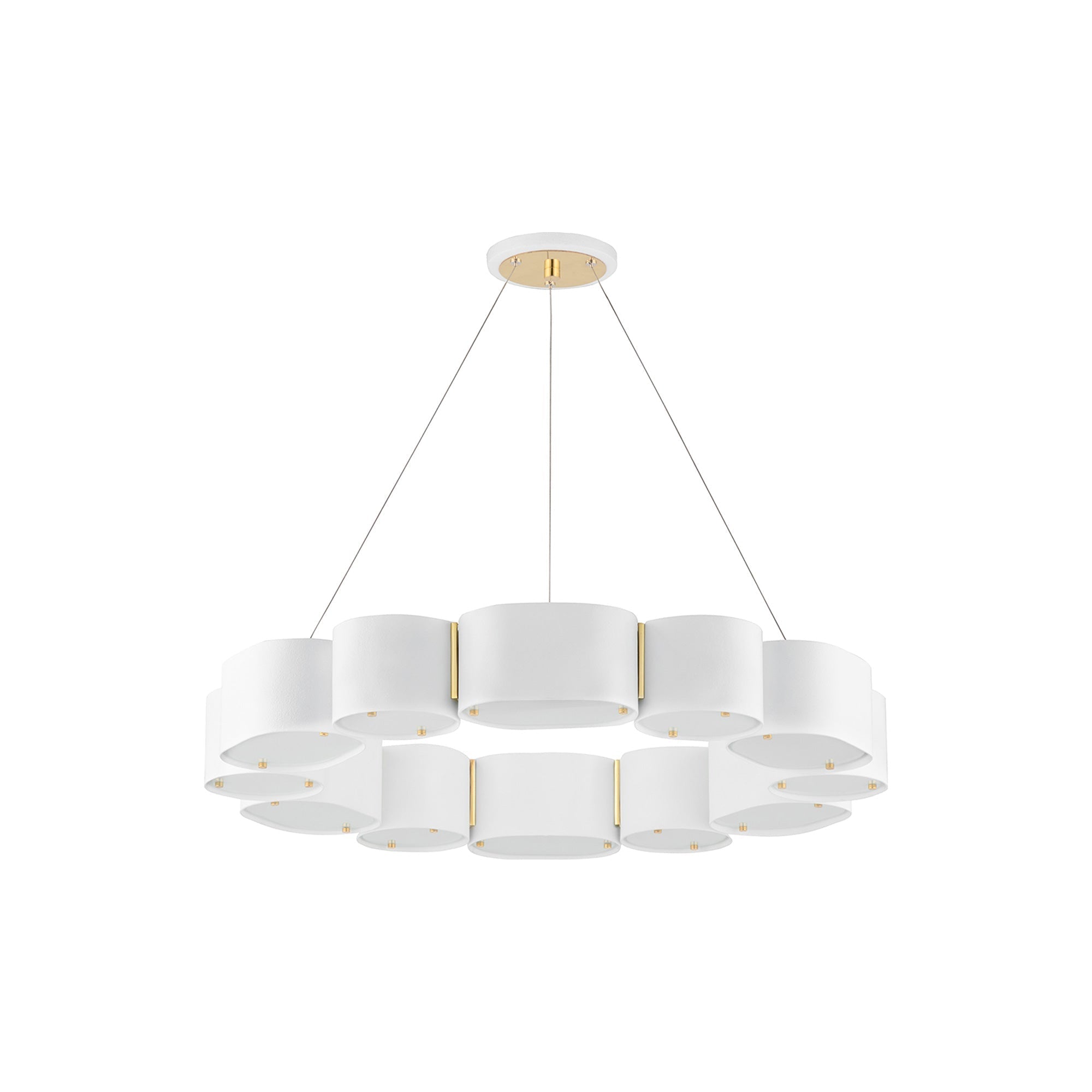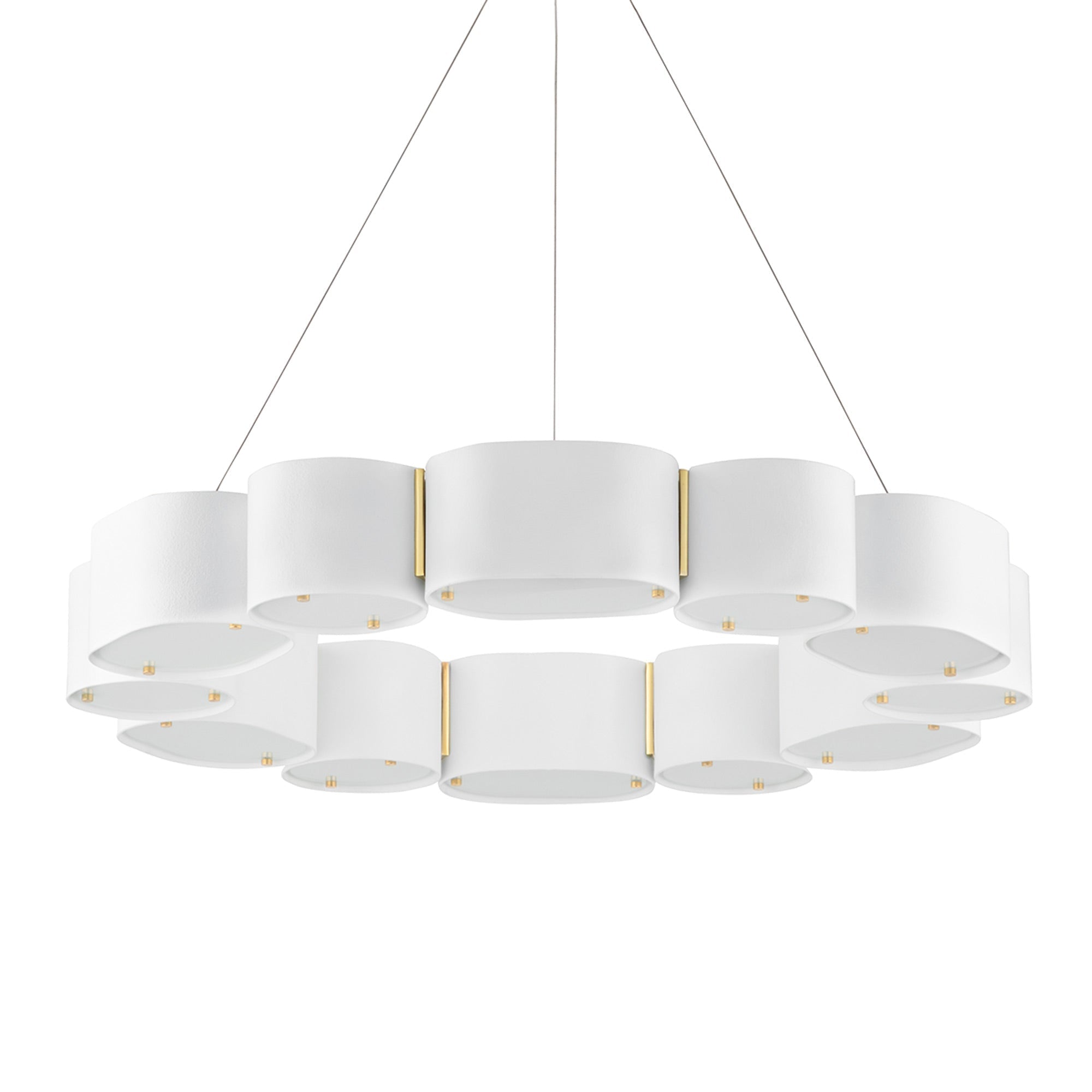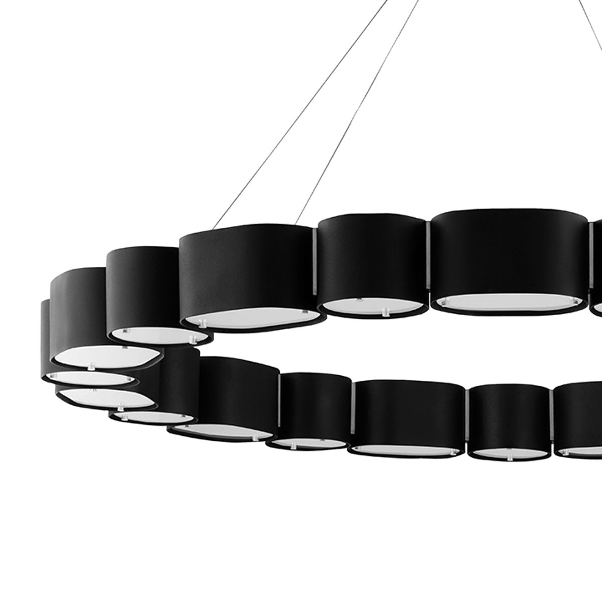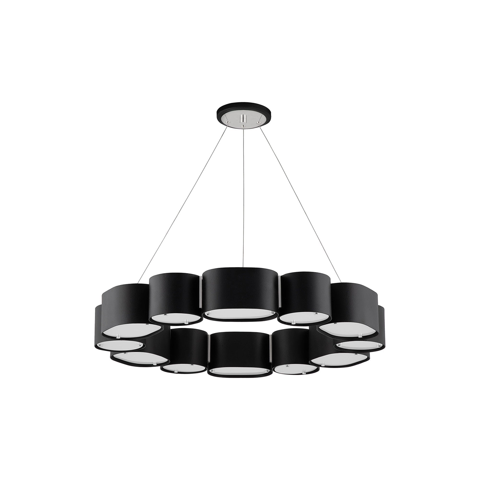 The ultra-modern aesthetic of the Opal Chandelier from Corbett Lighting makes a true statement wherever it is hung. Metallic accents including rivets and a slim suspension cable push an industrial space age revolution flair, matched in contrasted expression by the graceful, rounded edges and shapes clustered in a pod-like circle.