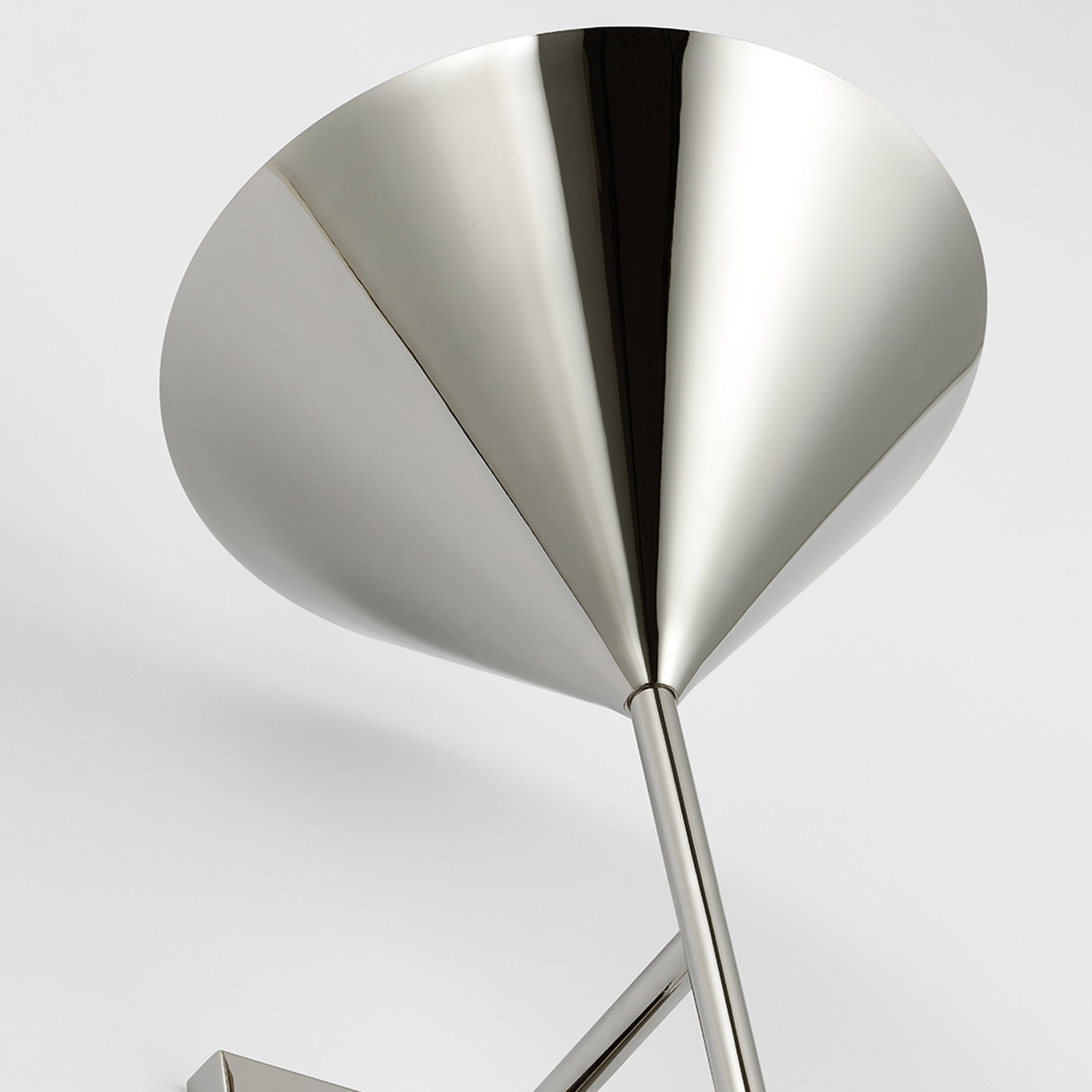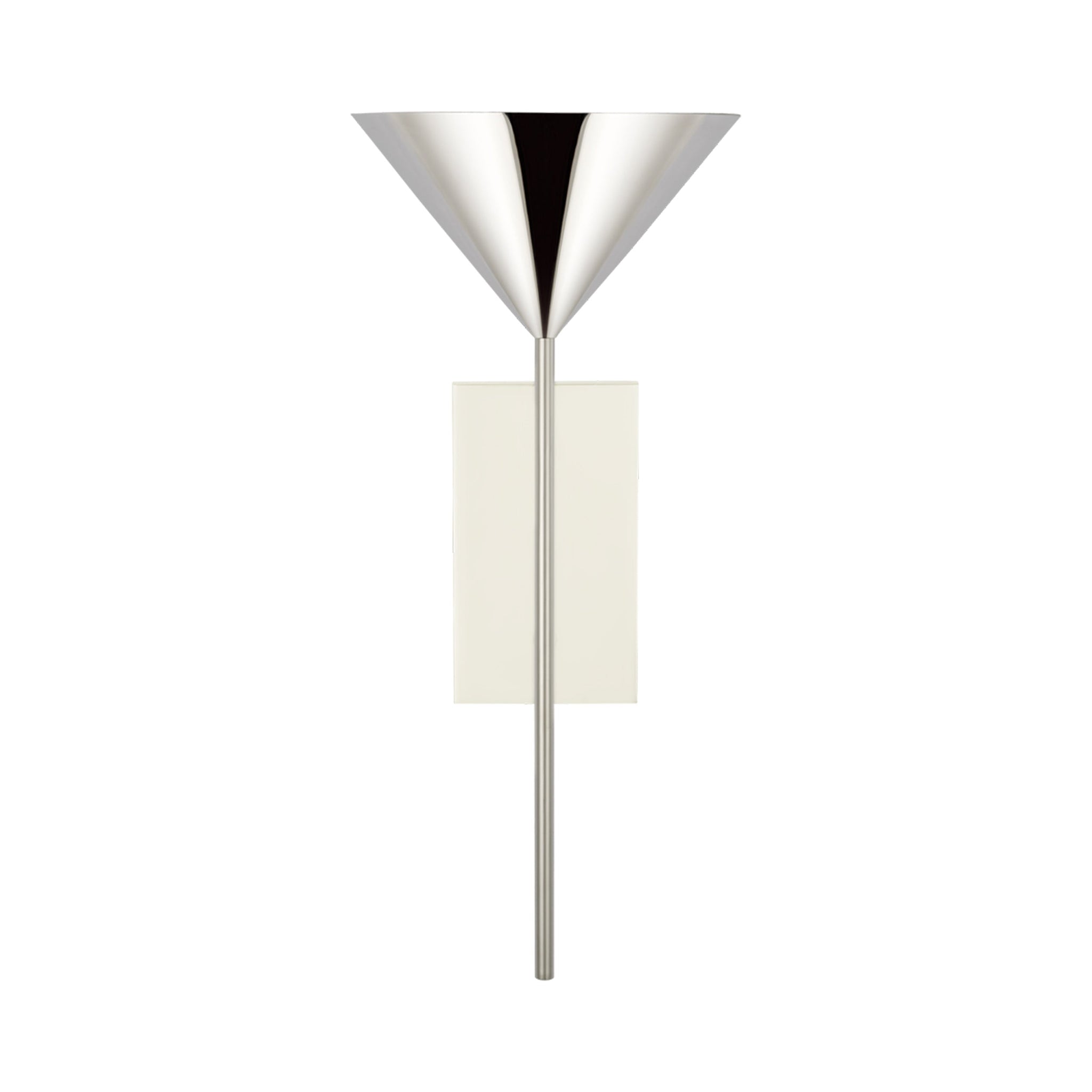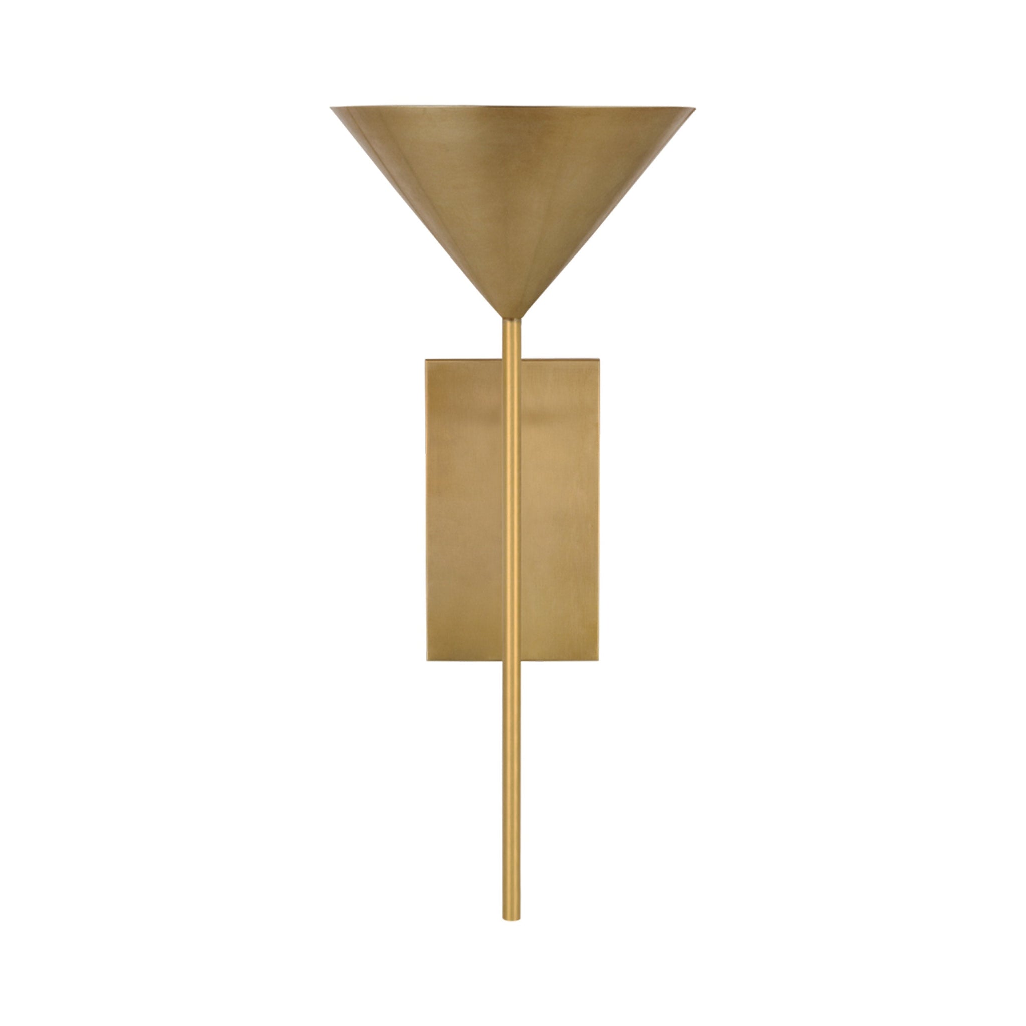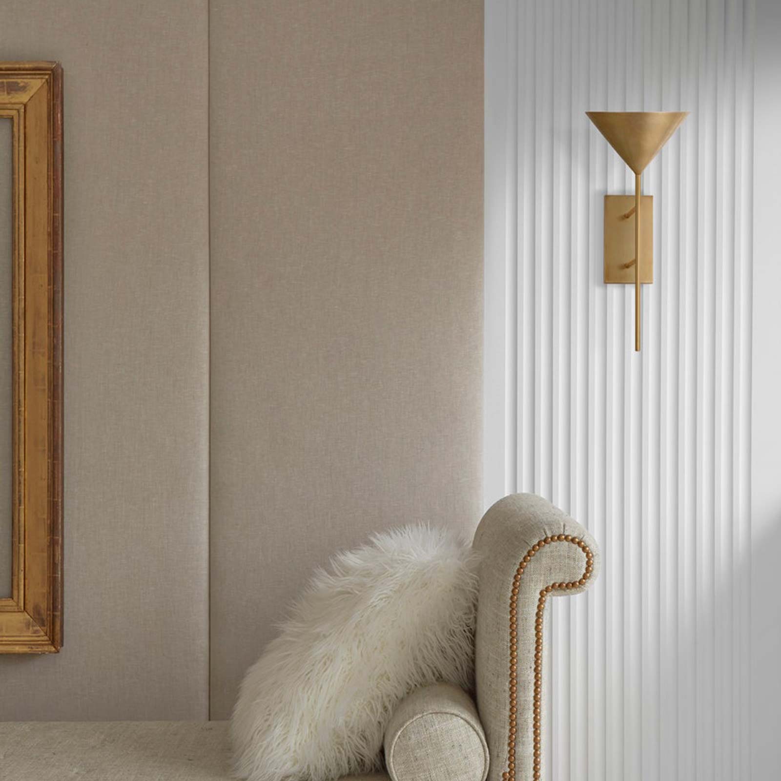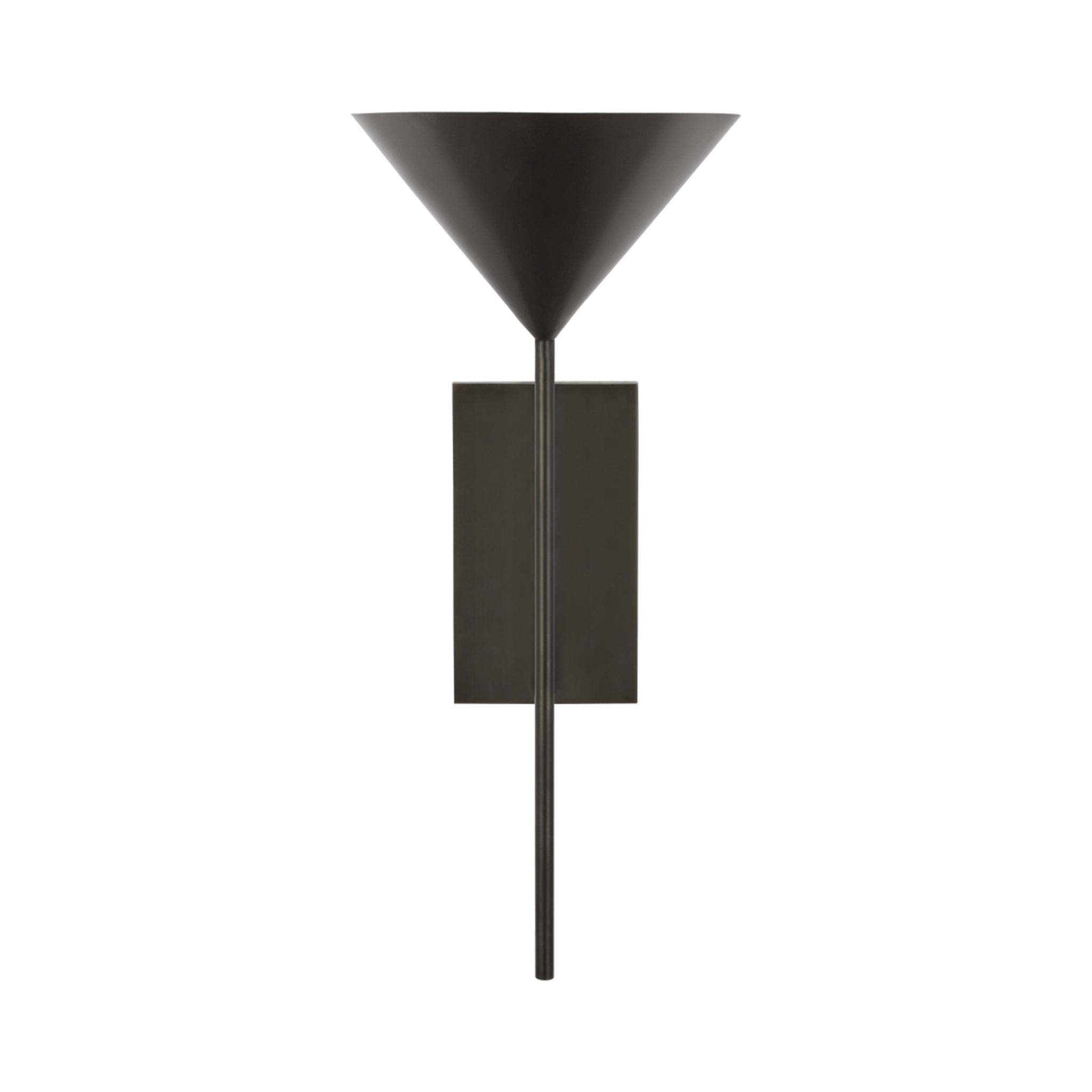 A strong statement follows minimalism turned dramatic in a light fixture with a custom look. Metal framing offers classic style to the Orsay Uplight Wall Light from Visual Comfort Signature, embellishing a modified torch motif with a prolific conical shade sending upward illumination to create special effects.