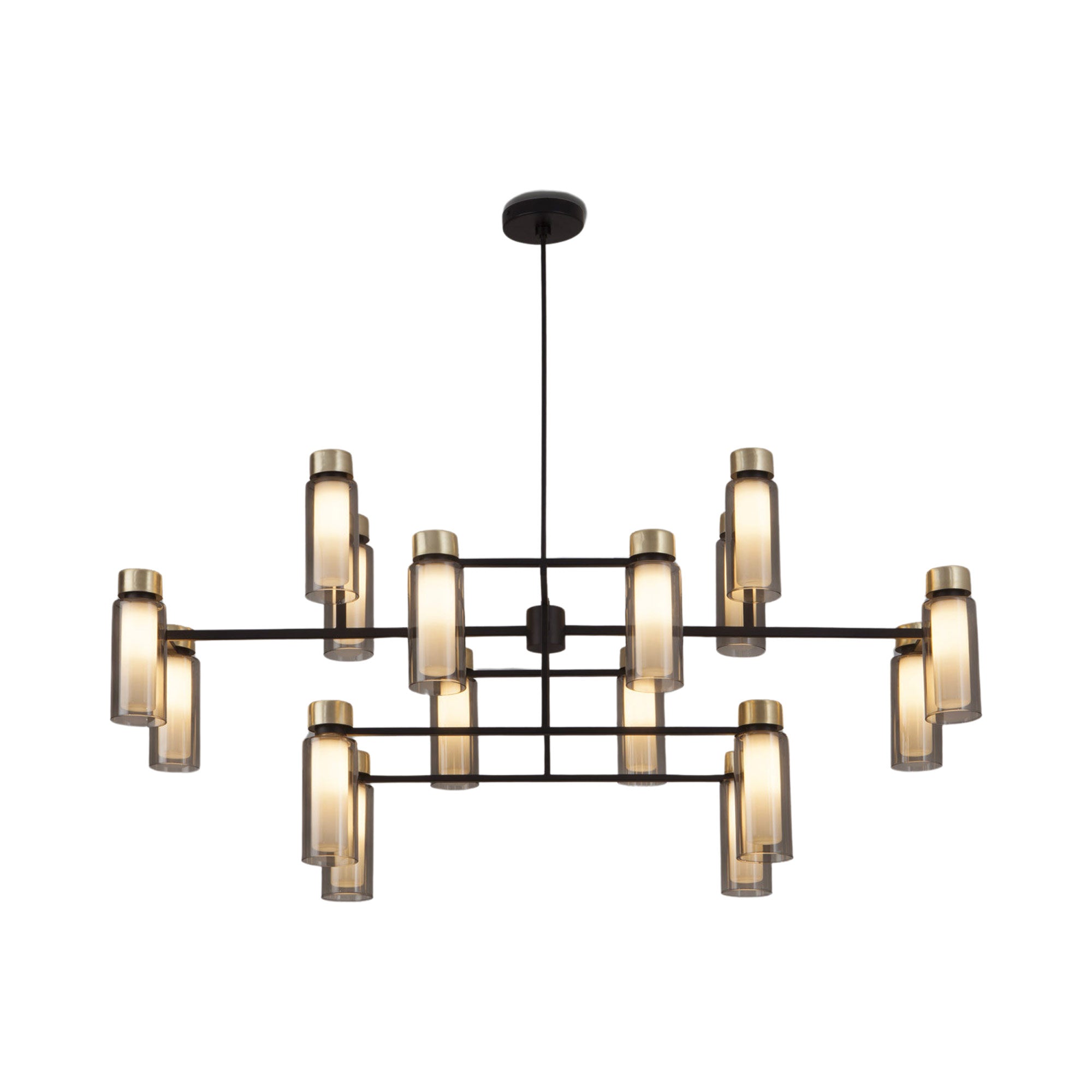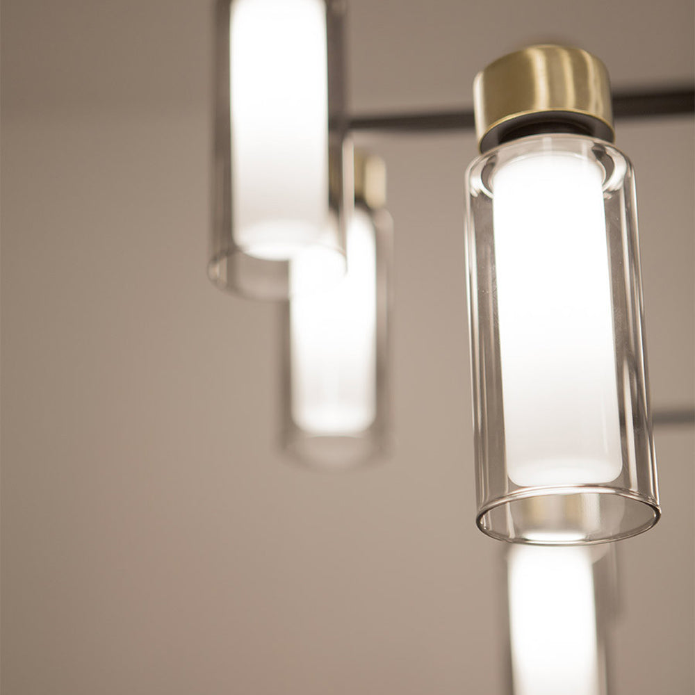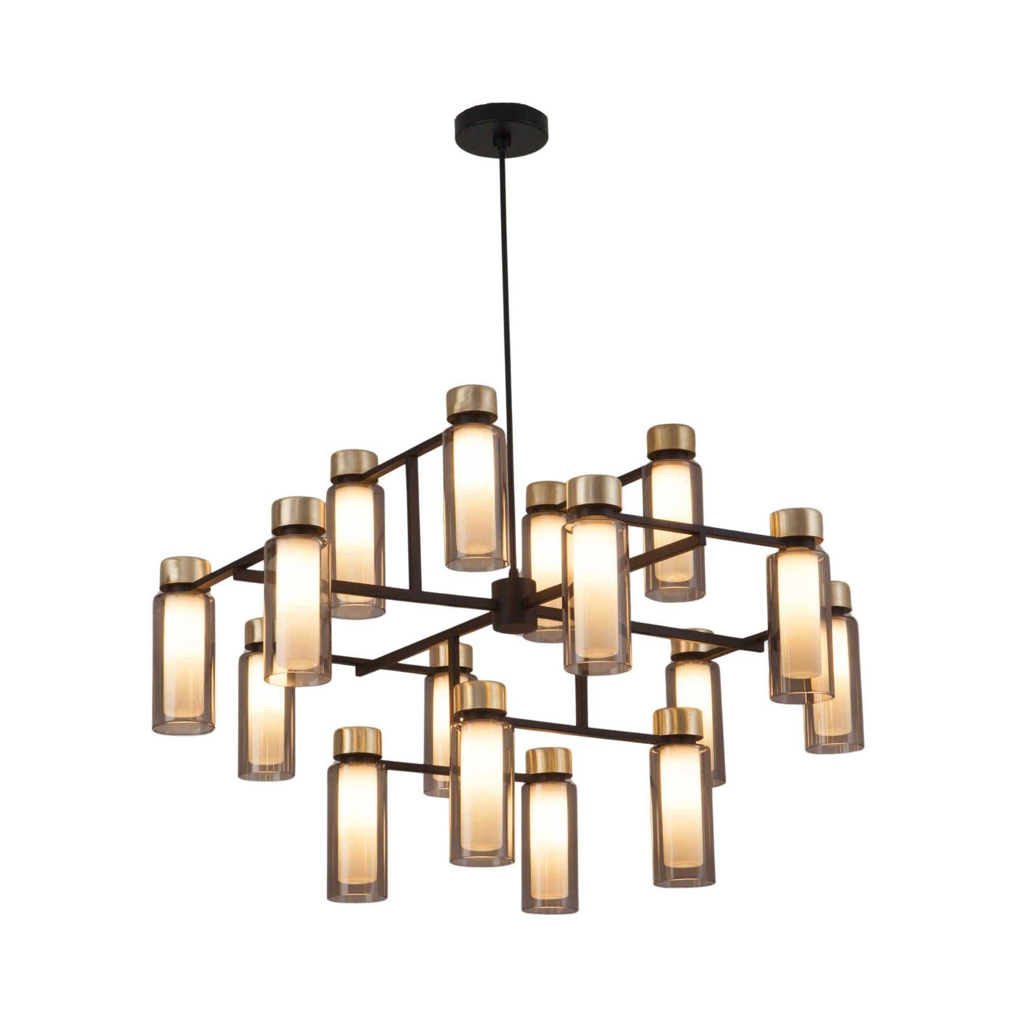 Celebrate structure reflecting a sheer industrial motif as the Osman Chandelier from Tooy makes a statement in a foyer, dining room, or living space. Glass shades complement tiered pipe-like metal caps as they affix to linear and angular metal framing, offering a veritable light show.