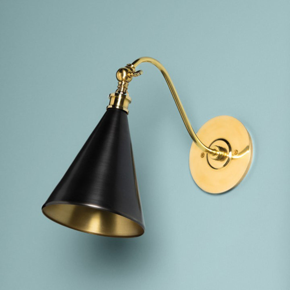 Romantic with an industrial vibe, the Osterley Wall Light from Hudson Valley Lighting plays with geometric silhouetting boosted by fluidity. Lush, warm tones of aged brass and distressed bronze embellish this chic fixture with a conical shade and curved metal arm. Adjustable lighting angles make this fixture an exceptional choice.