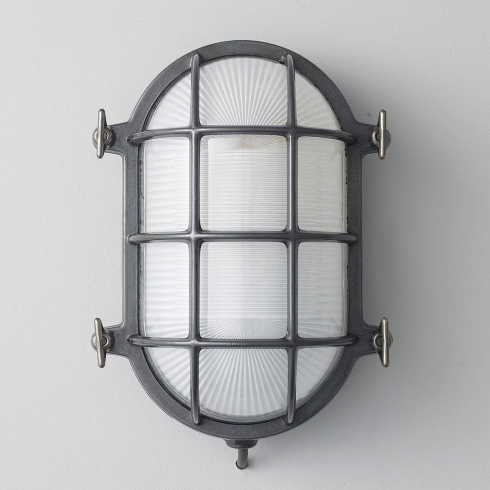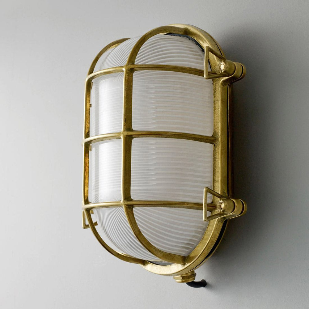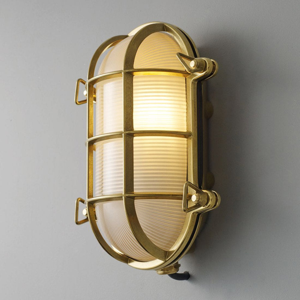 Dramatic emphasis on industrial influence revives the industrial era with retro charm, perfect for sprucing up a themed setting. The Oval Brass Bulkhead Indoor/Outdoor Wall Light from Original BTC and its iconic grid-like aluminum frame nestles ribbed glass creating a domed shade. For indoor or outdoor use, this energizing fixture makes a statement of impact.