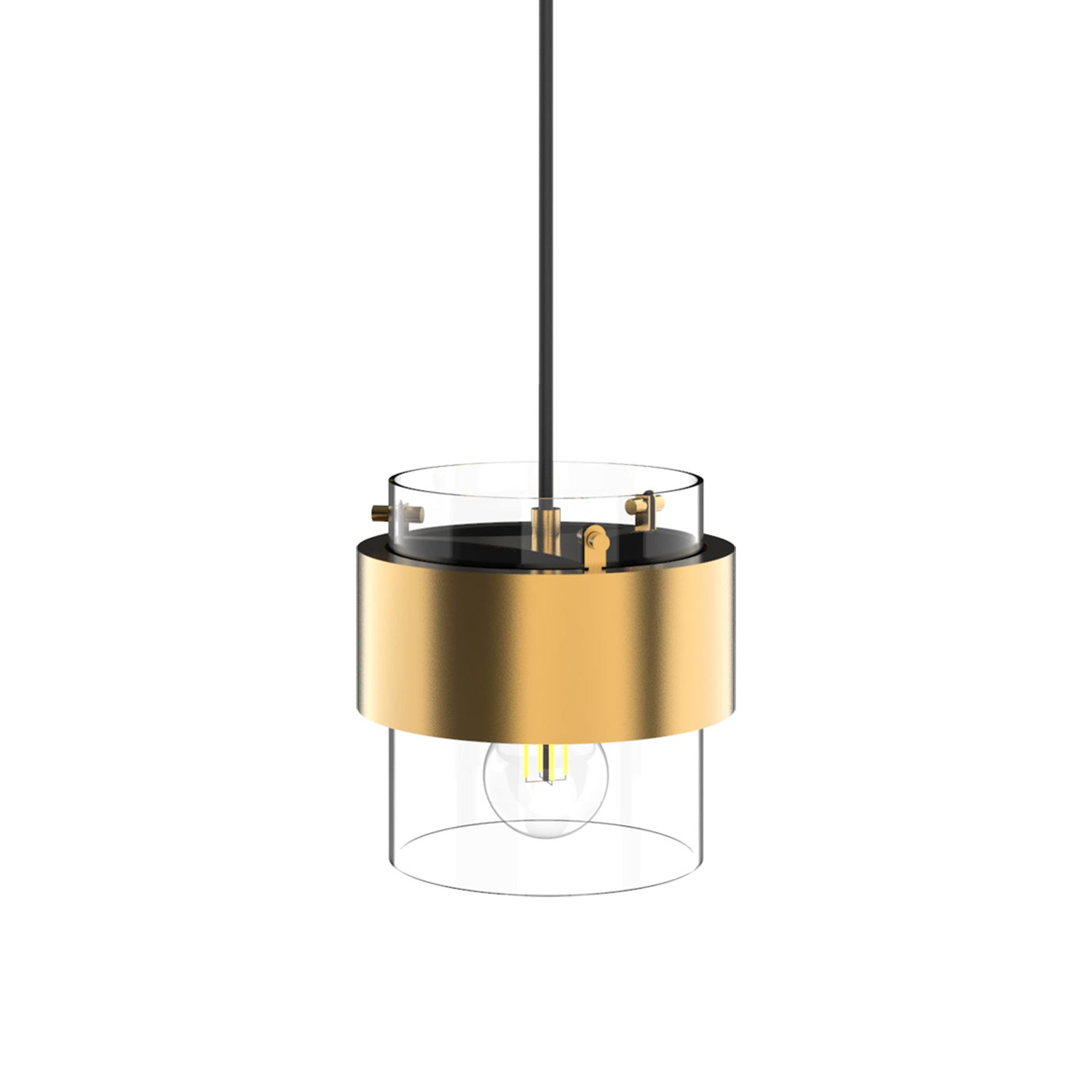 Layered elements and exquisite rivet details transform the P1404 Pendant Light from Vinci Lighting into an elegant modern industrial piece. A wide metal band suspends a cylindrical clear glass globe, revealing a glowing bare bulb inside for a utilitarian meets glam modern vibe.