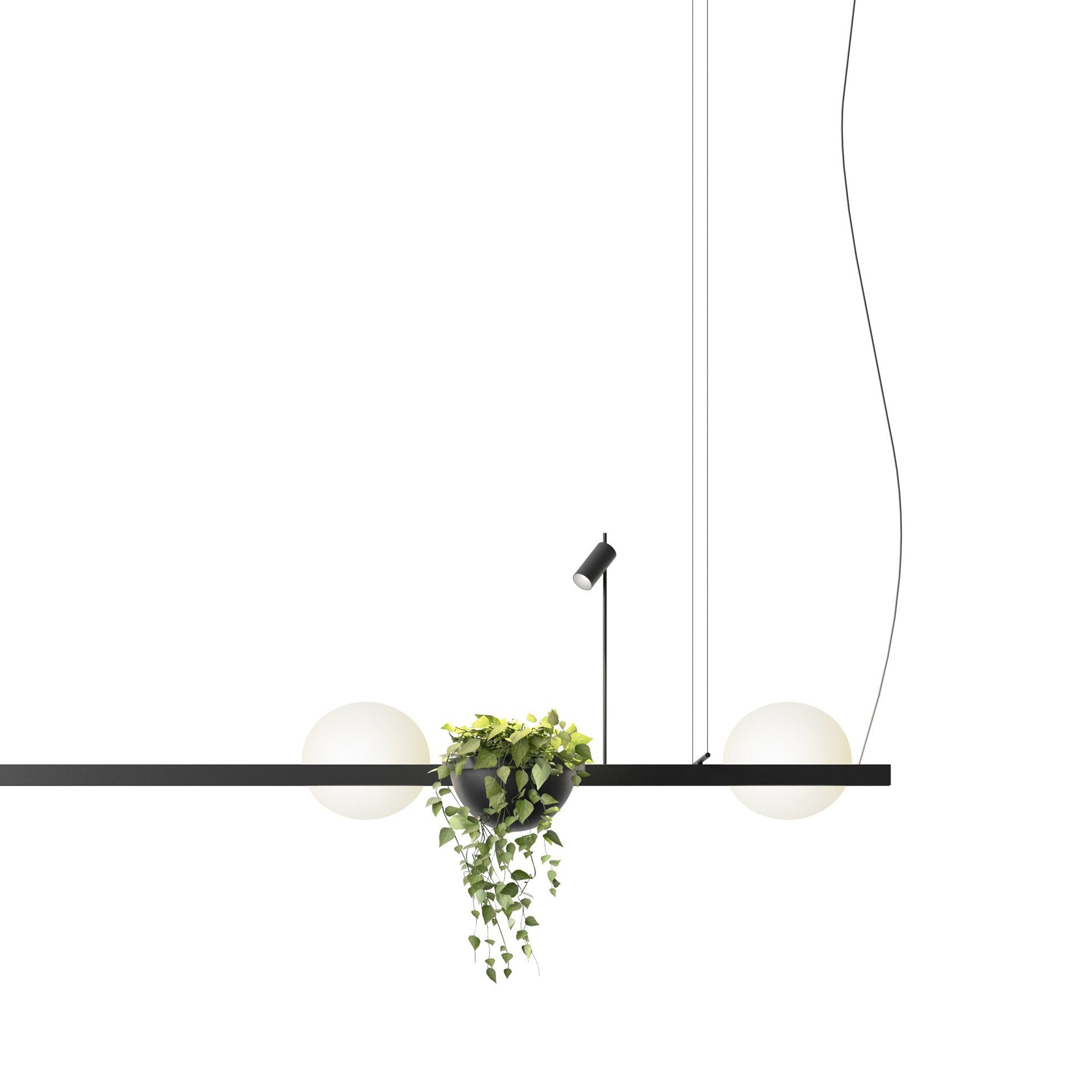 Highlight modern home décor with a dramatic statement piece. This bold, metal Palma 3736 LED Pendant Light from Vibia creates soft ambiance with two round, blown-glass diffusers as the attached spotlight puts the built-in flowerpot on elegant display.