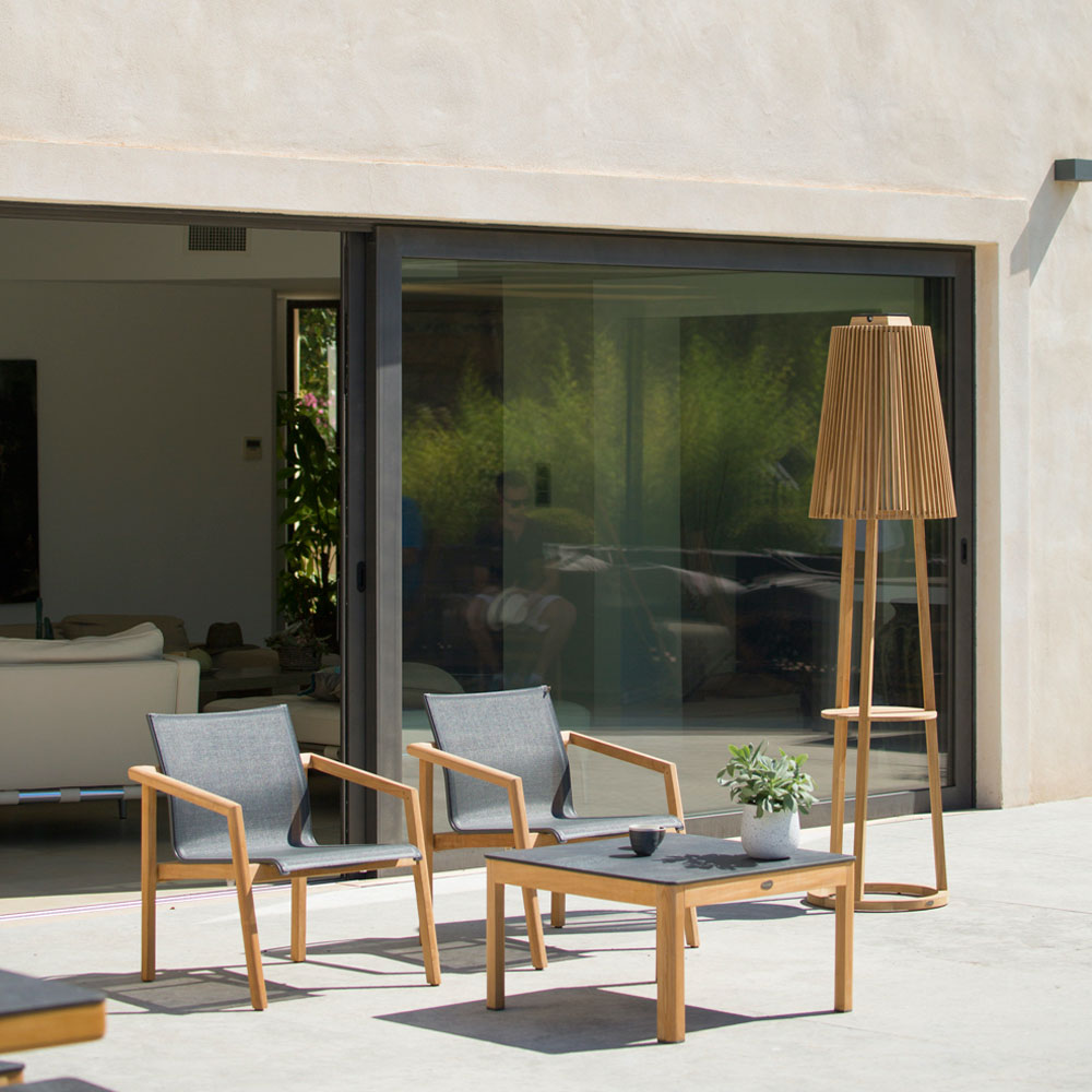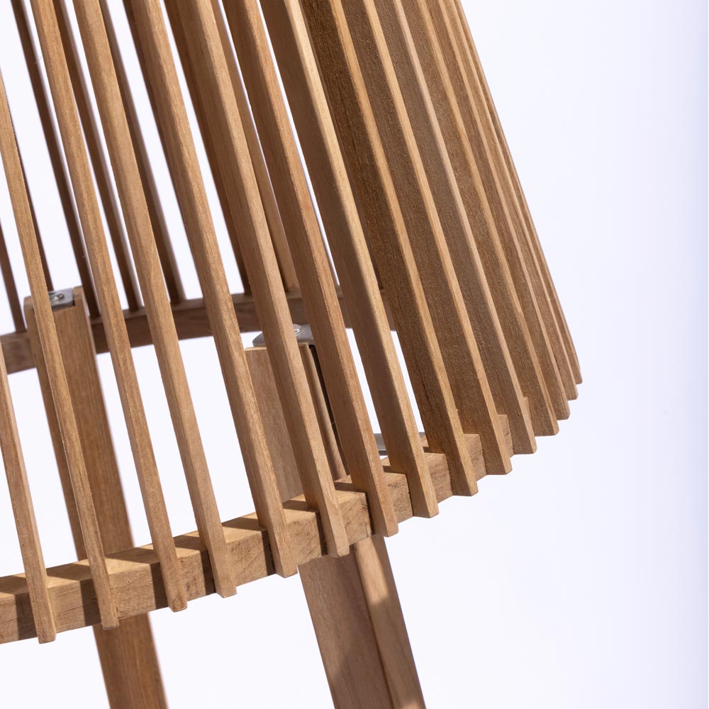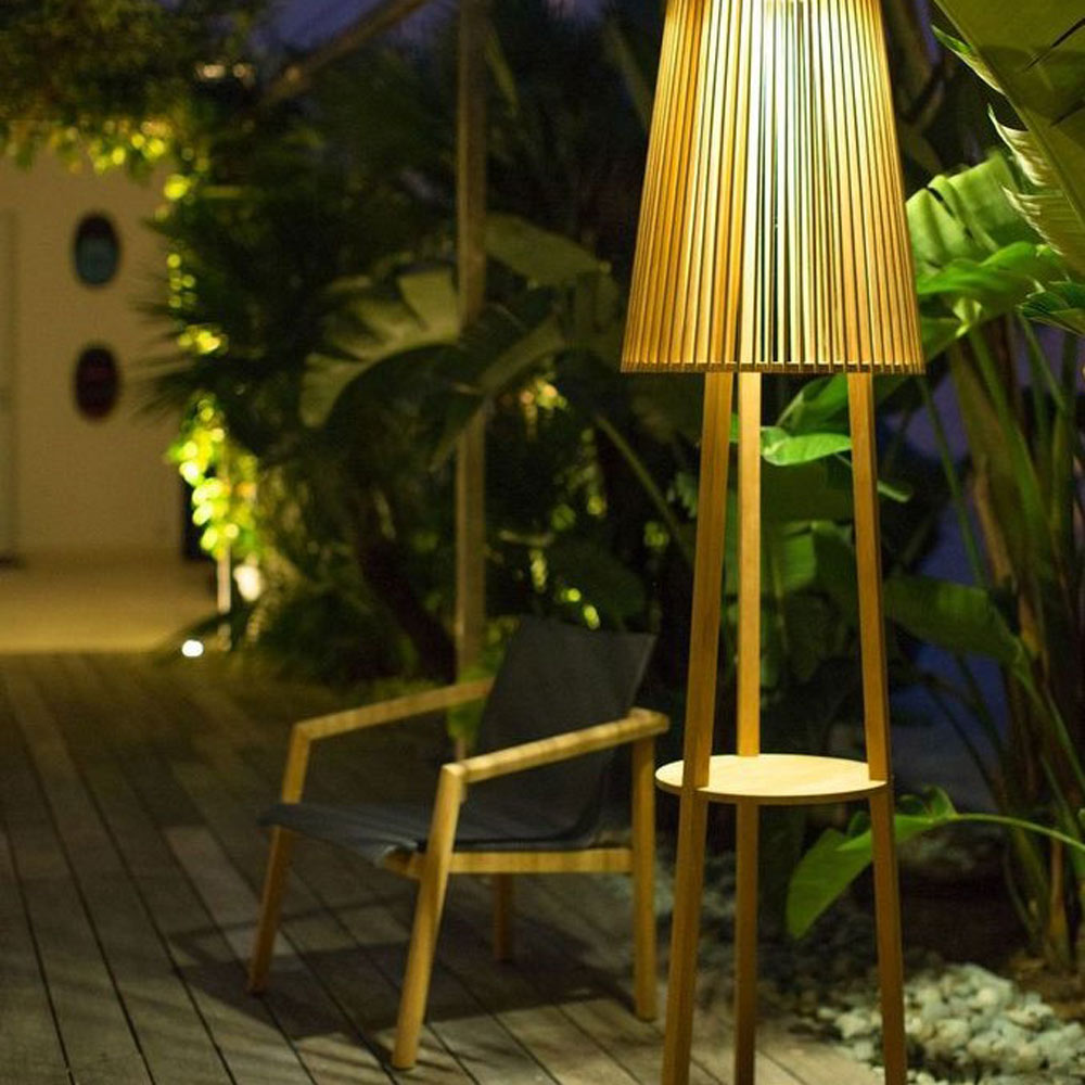Exotic ambiance conforms to a mix of geometric shapes, creating a decadent yet natural vibe perfect for outdoor settings. The Palma Outdoor Solar LED Floor Lamp from Les Jardins brings the portability of interior floor lighting to exterior spaces. Teak wood forms a tripod stand with a bonus center shelf, and a pieced tapered shade that matches to create a singular aesthetic in energy-efficient solar-powered lighting.