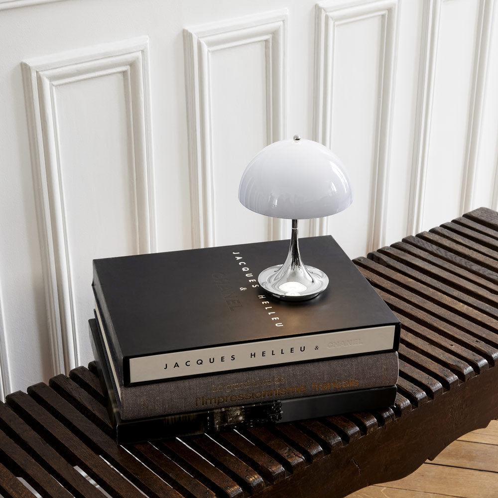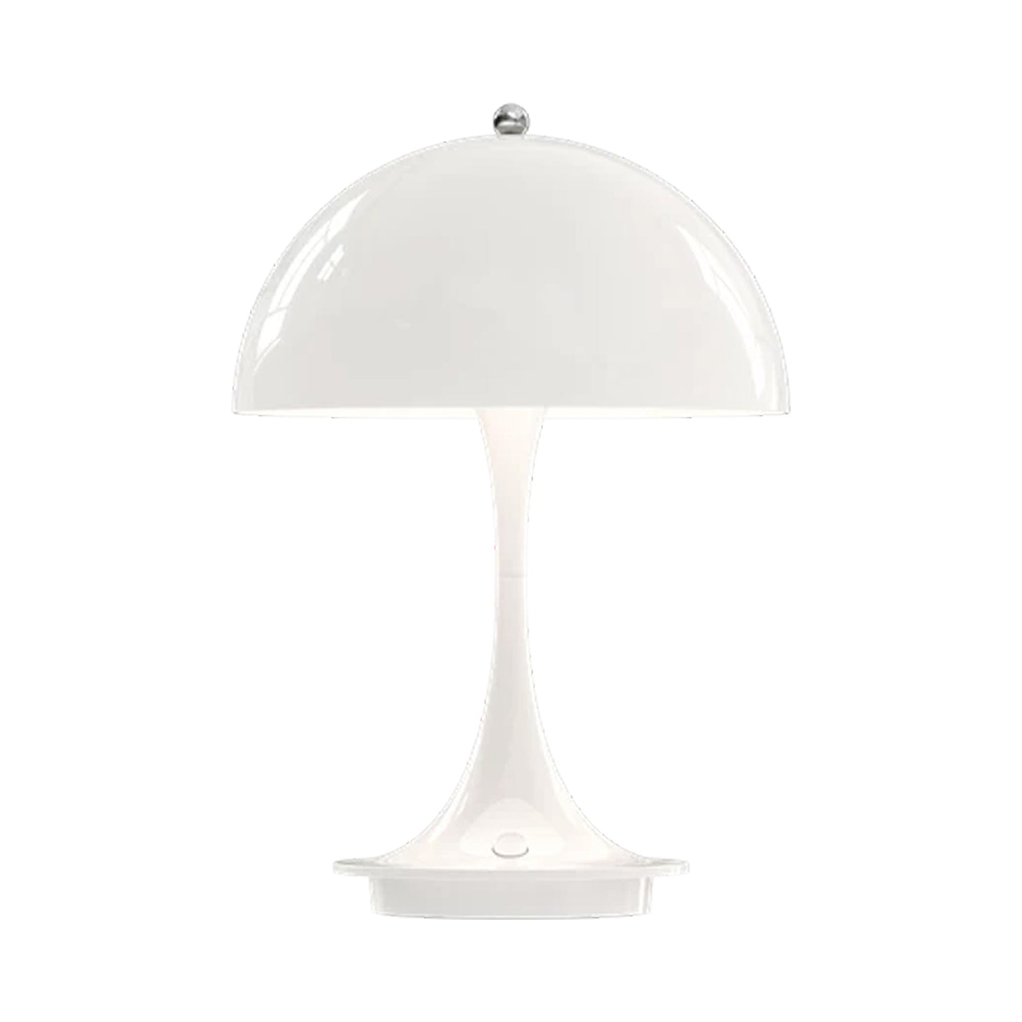 Add a rich glow to a conference table or bring soft illumination in a bedroom with the eminent convenience and style of the Panthella 160 LED Portable Table Lamp from Louis Poulsen. Cordless, the lamp delivers a distinctive silhouette in a compact package, ideal for versatile usage around the home and elsewhere. Graceful curves define the design, which pairs a hemispherical shade and trumpet base to create refined, modern flair.