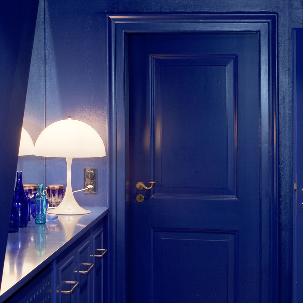 Soften the look and feel of an accent table or nightstand with the flowing curves of the modern Panthella 400 Table Lamp from Louis Poulsen. A chic trumpet stem and hemispherical shade feature white opal acrylic that creates a softly glowing bright spot within surrounding decor. Especially lovely against a vivid accent wall.