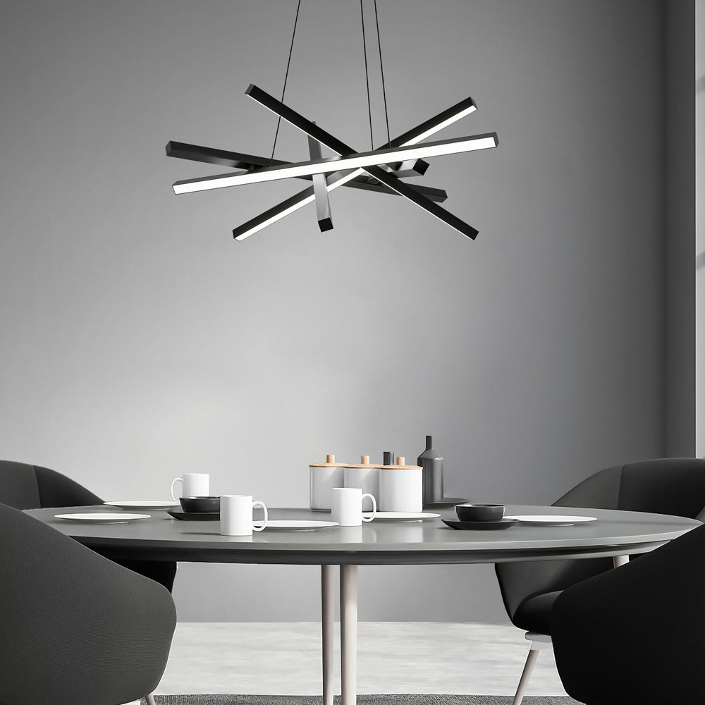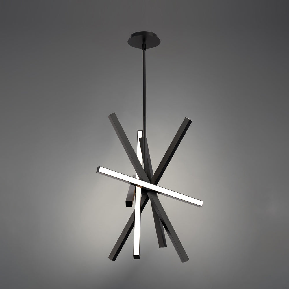 Juxtaposed rods create the engaging profile of the modern Parallax 731 LED Chandelier from dweLED. Energy efficient, it showcases an ultra-contemporary design that elevates simplicity to new heights. Glowing rods cast light in multiple directions, creating a rich ambiance over your dining table or in a foyer.