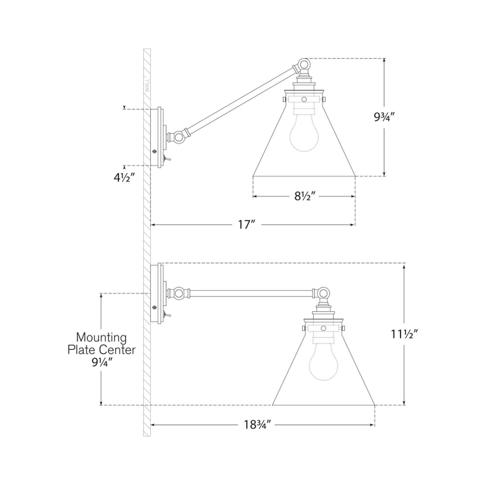 - Single Arm: 8.5"W X 9.75"-12.25"H; 17"-18.75" Extension