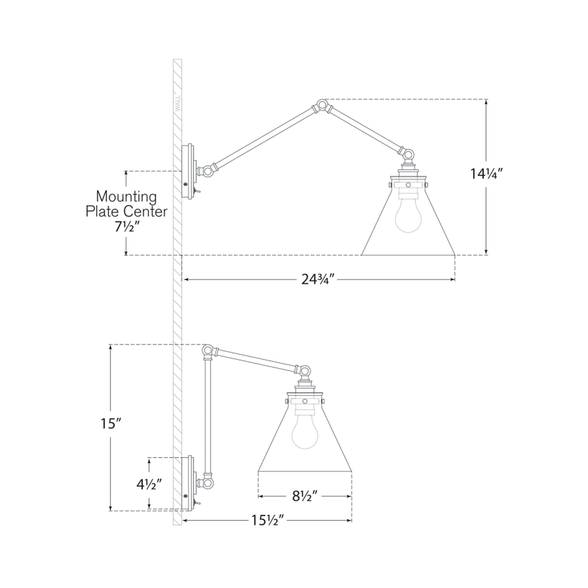 - Double Arm: 8.5"W X 14"-15"H; 15.5"-24.75" Extension